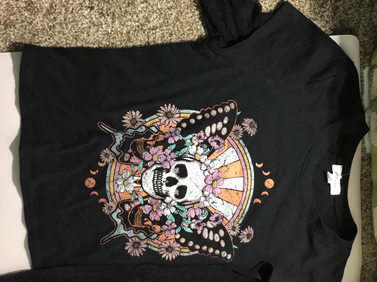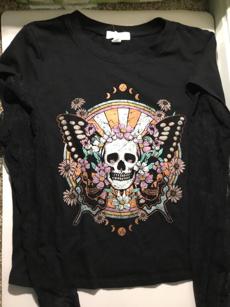 Stitch and pine black skull butterfly t shirt with lace sleeves
