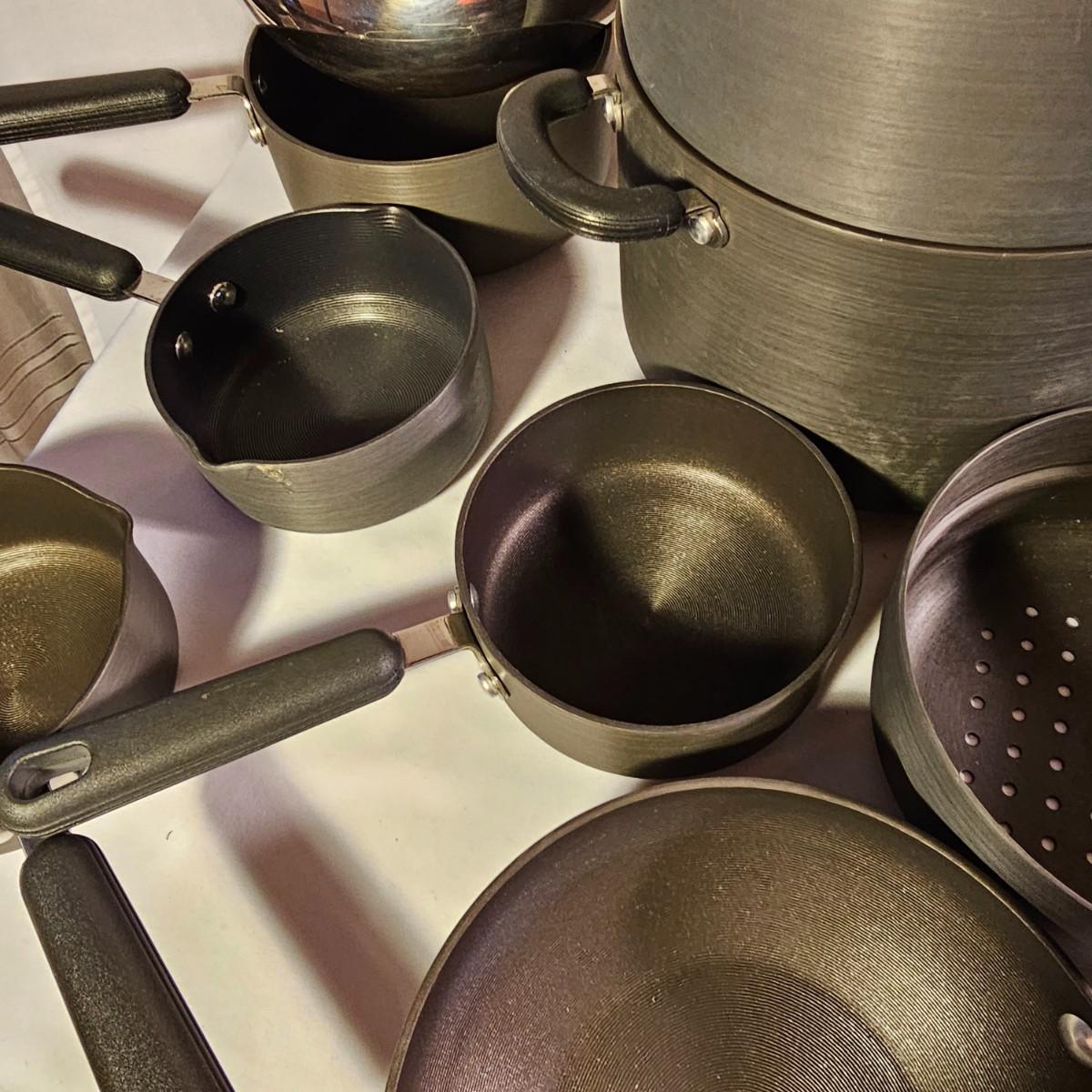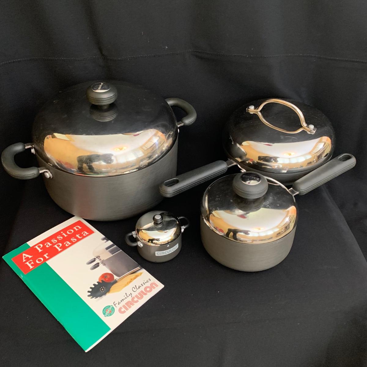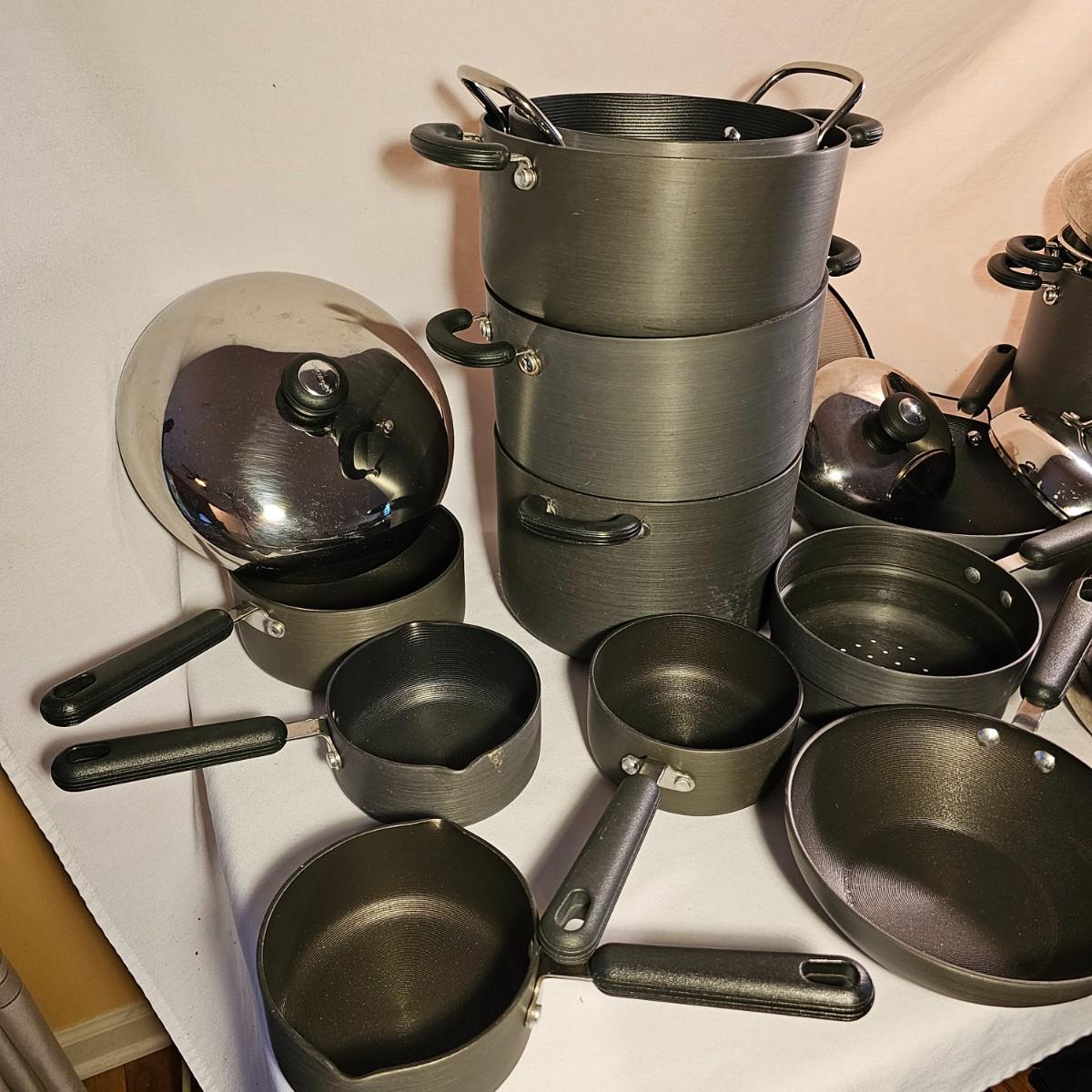 Large selection of stock pots and sauce pots. Lot includes four stock pots, two steamer pots, small timer, and four sauce pots. All Circulon products are non-stick. Please note that smaller steamer pot is unbranded, however all other items in lot are made by Circulon. Largest pot measures approximately, 10.5”D x 9”H. Please see photos for more details. More matching Circulon pans available in another lot. Local pickup only.