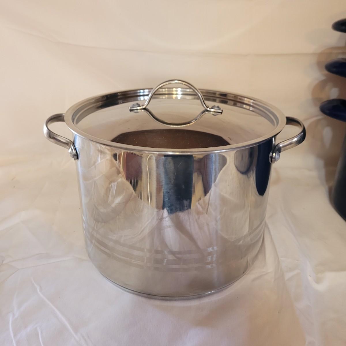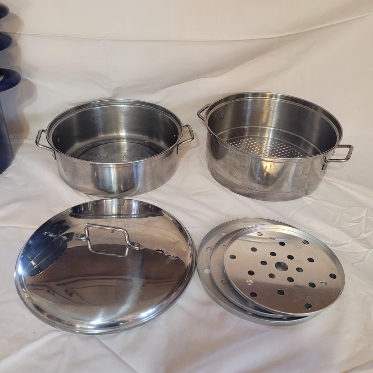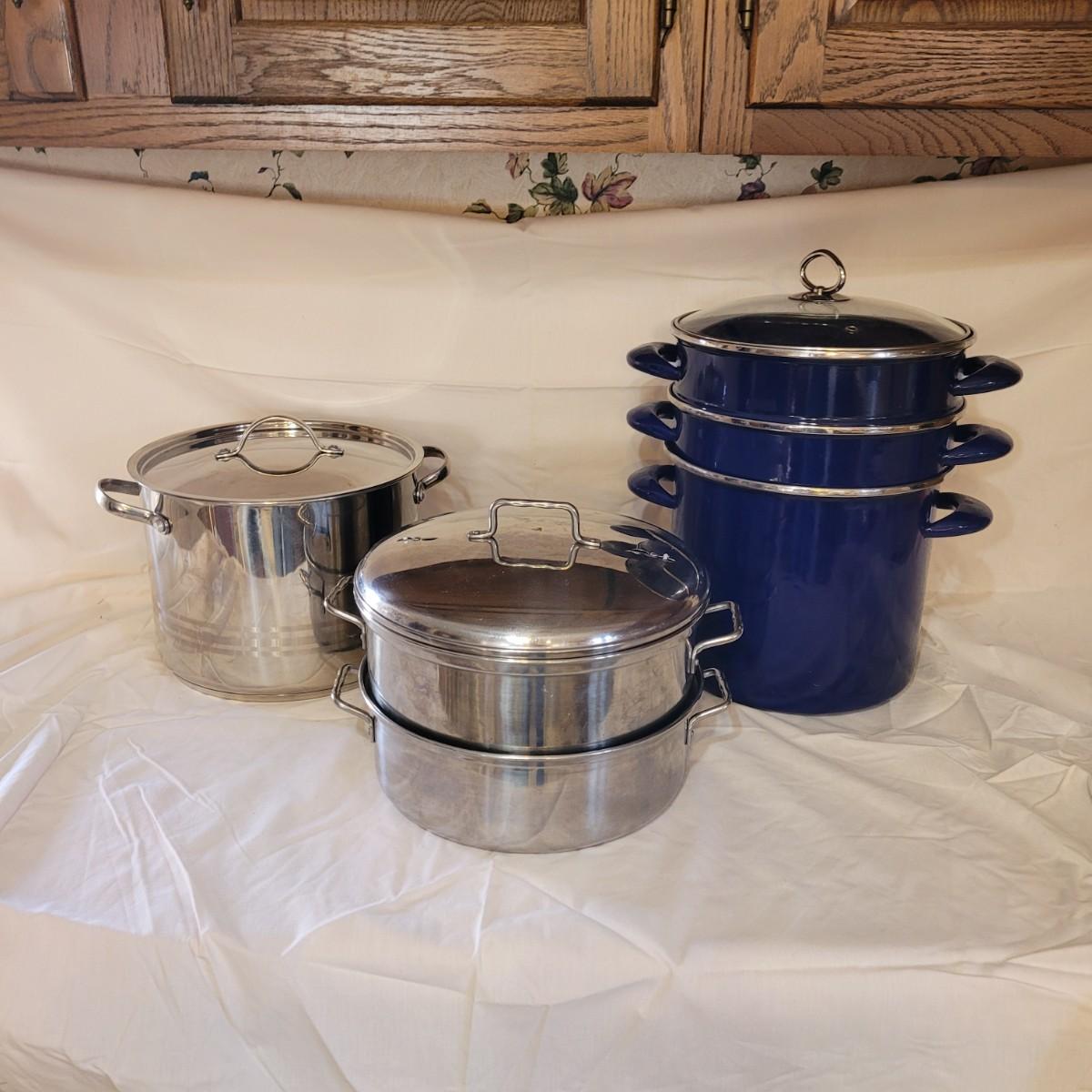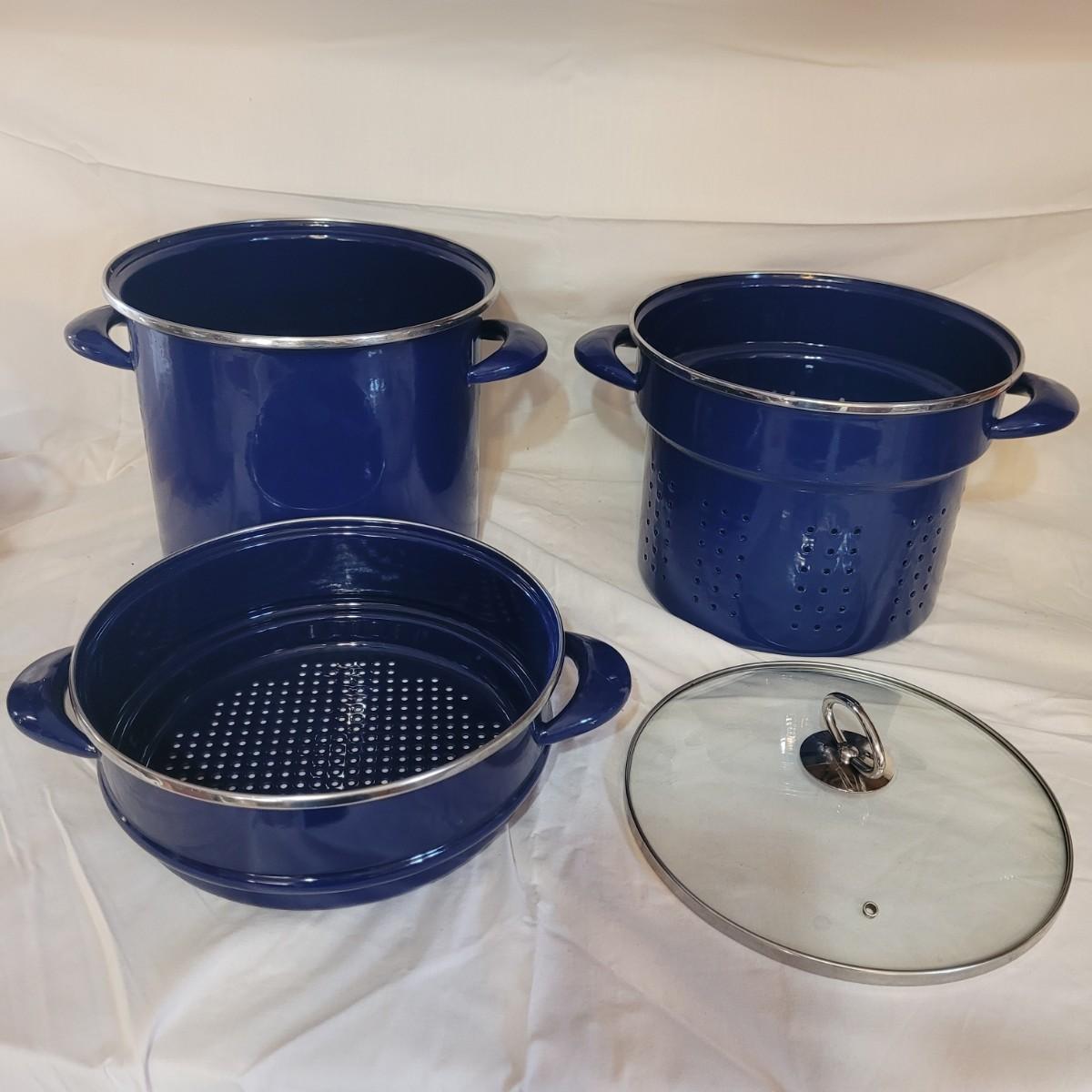 This collection includes a stainless steel stock pot and steamer pot, and an enamel coated stock and steamer pot combo. Enamel stock pot measures approximately 9.5"DIA x 8.5"H. Shipping available.
