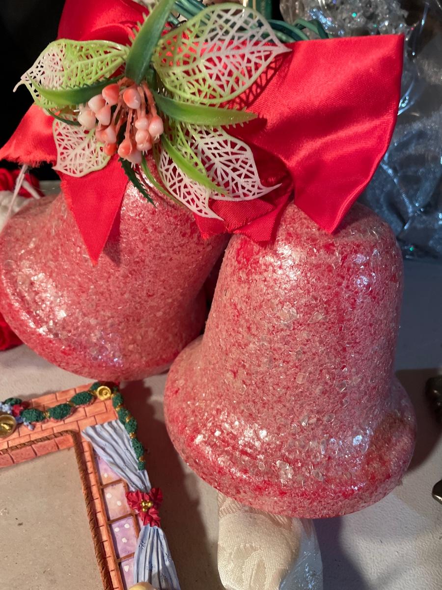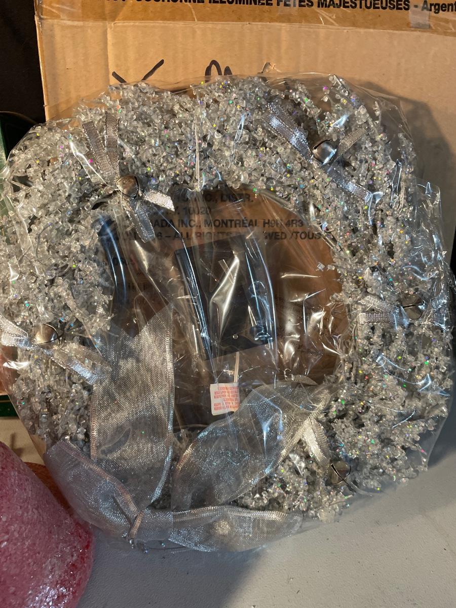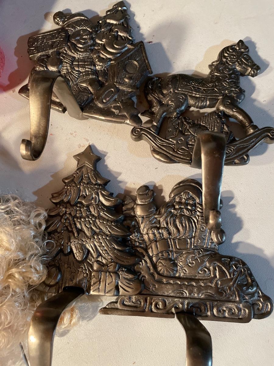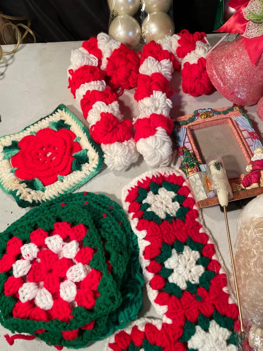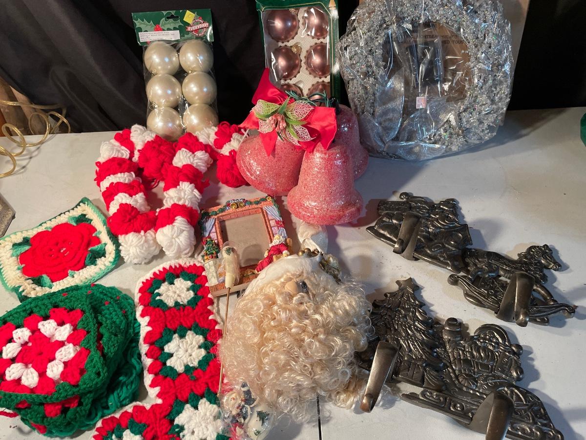 Stocking holders, lighted wreath, vintage, crochet, and bells