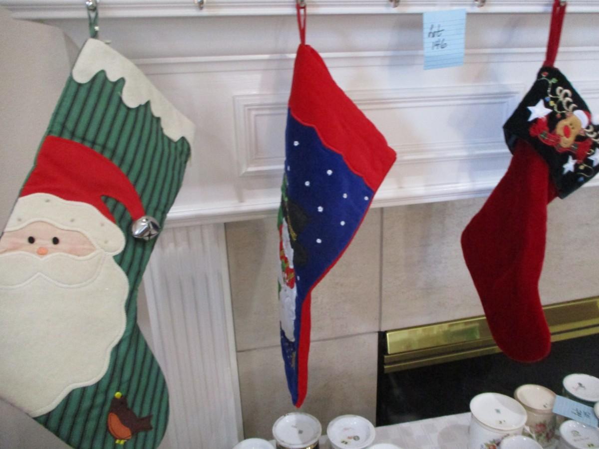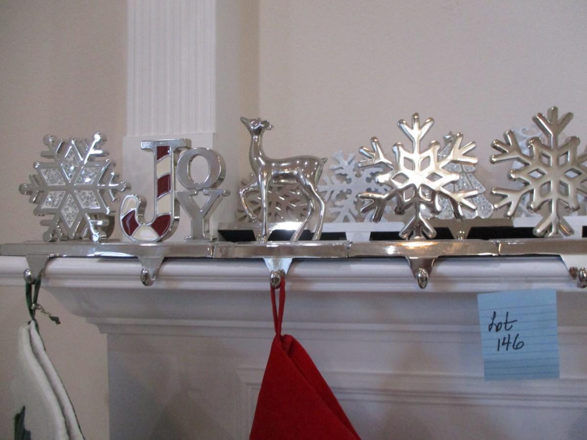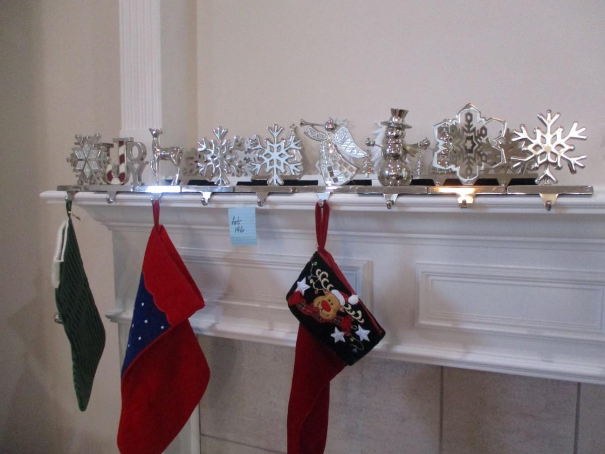 3 stockings. Silver stocking holders. Great conditon