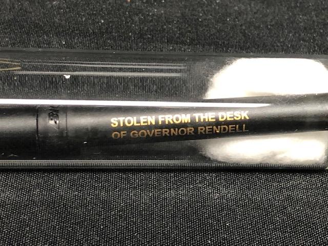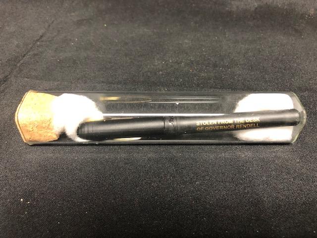 "Stolen from the desk of Governor Rendell" pen in glass vial. Governor Rendell served as Pennsylvania's governor from 2003 to 2011. Did not remove pen from vial, unsure if it works.