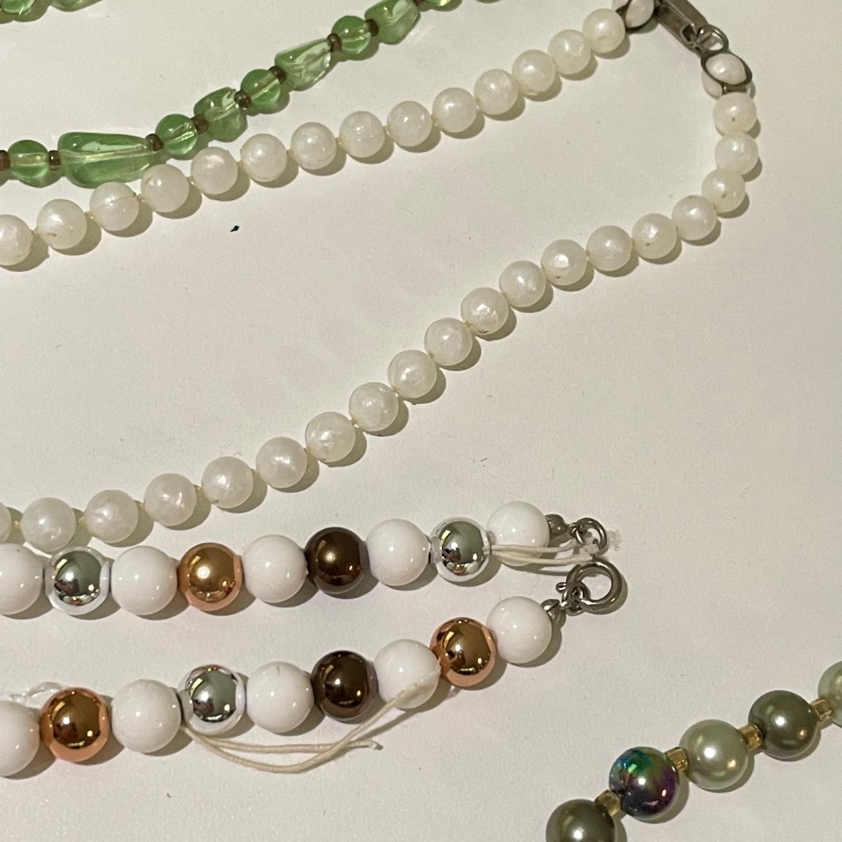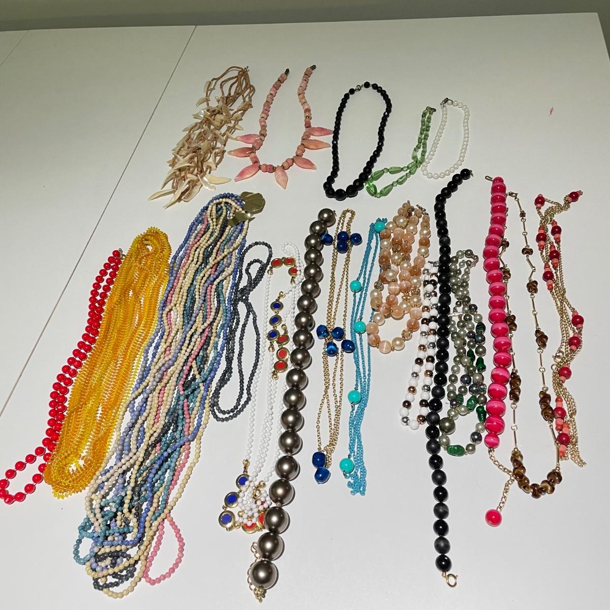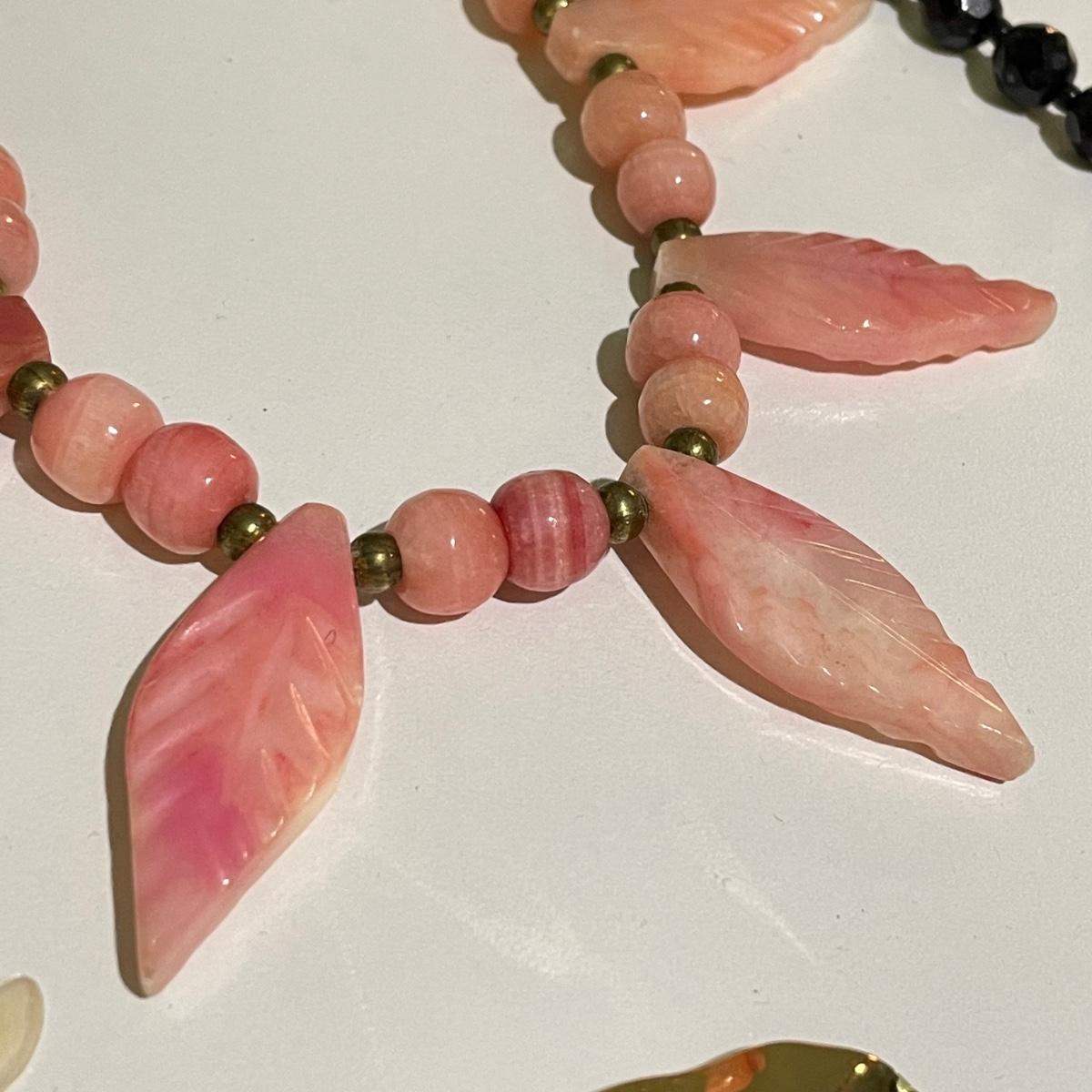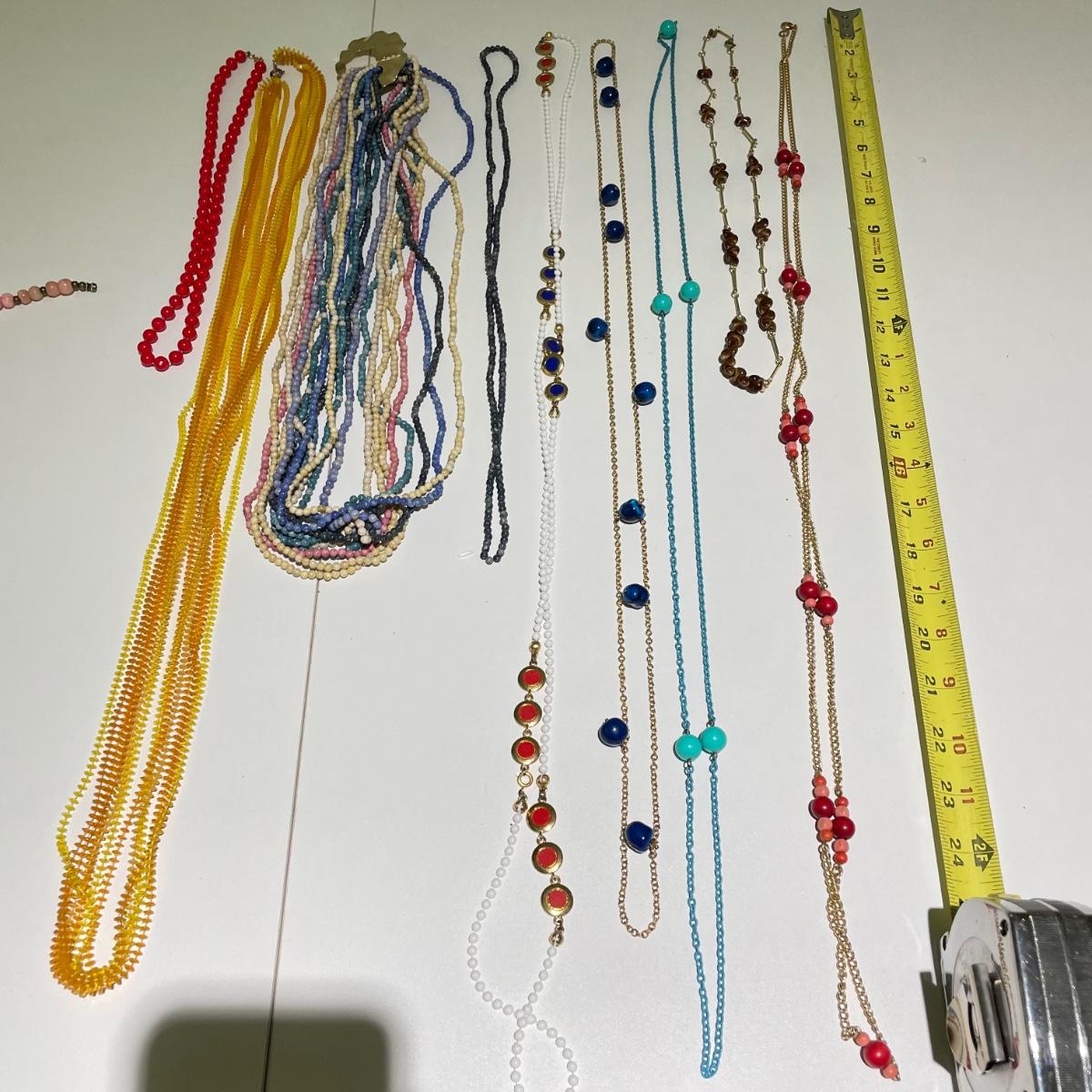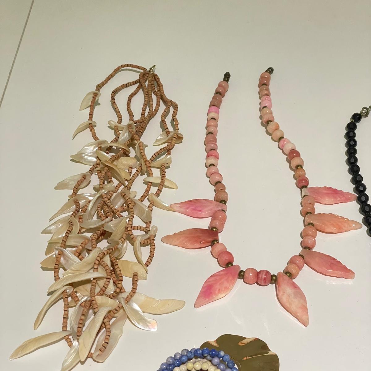 Several stylish beaded necklaces. The pink leaf necklaces feels similar to Jade, other necklaces have shells and colorful pearl-like beads. Quite a few would be best worn layered and are over 26” long. See images. Shipping available.