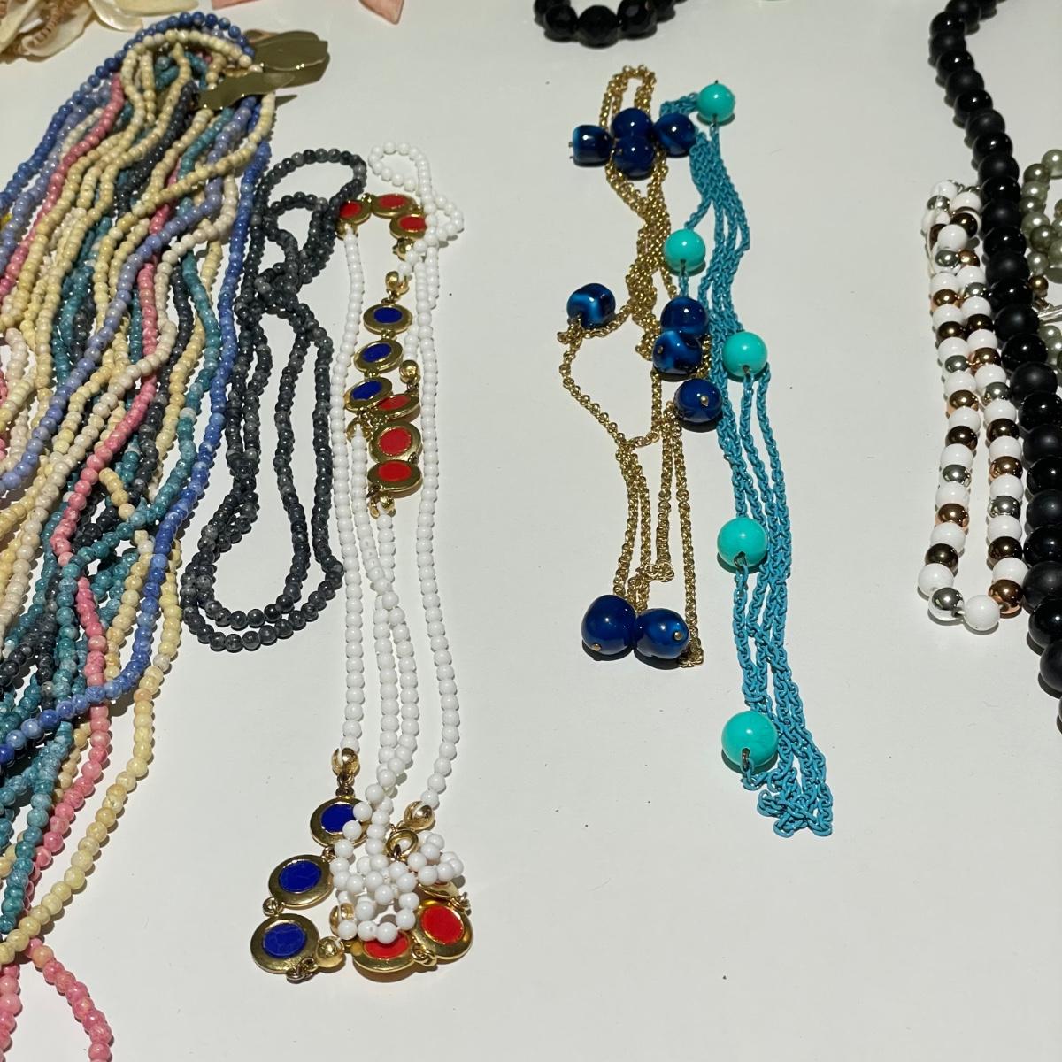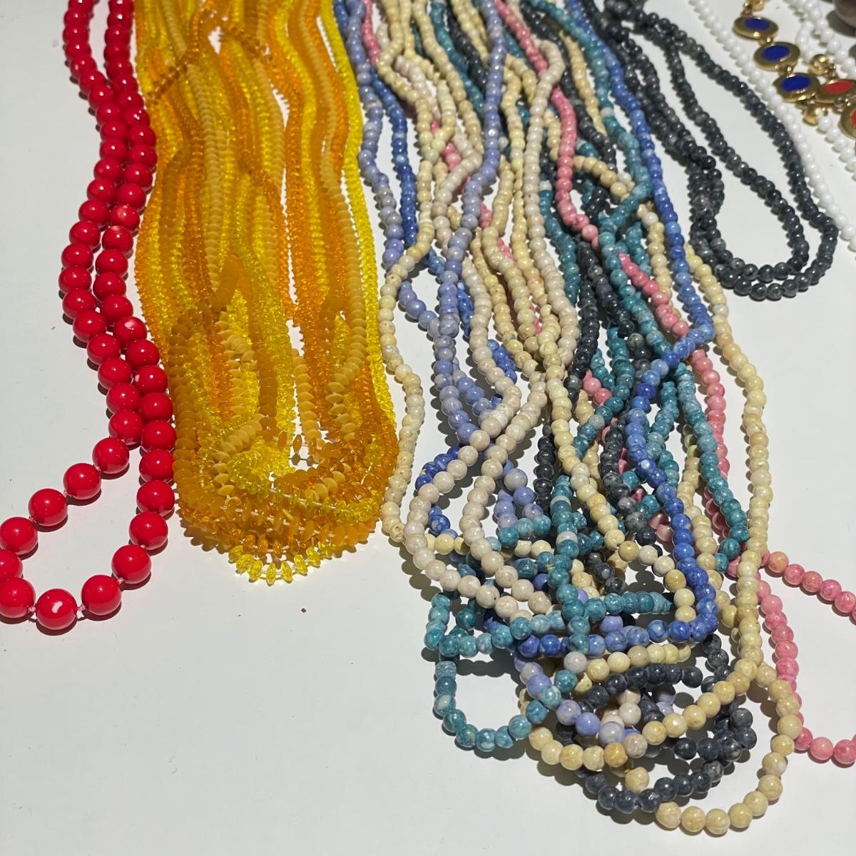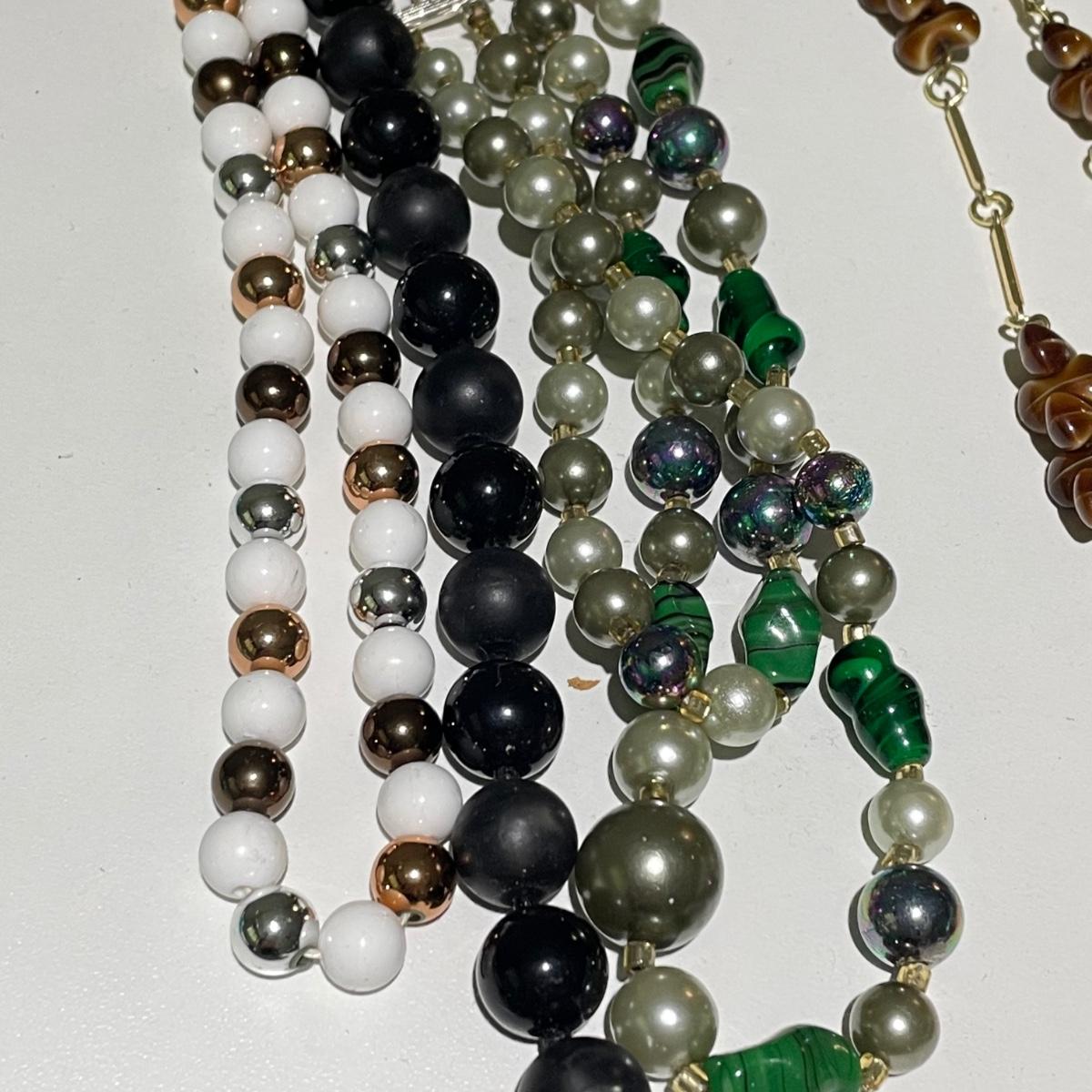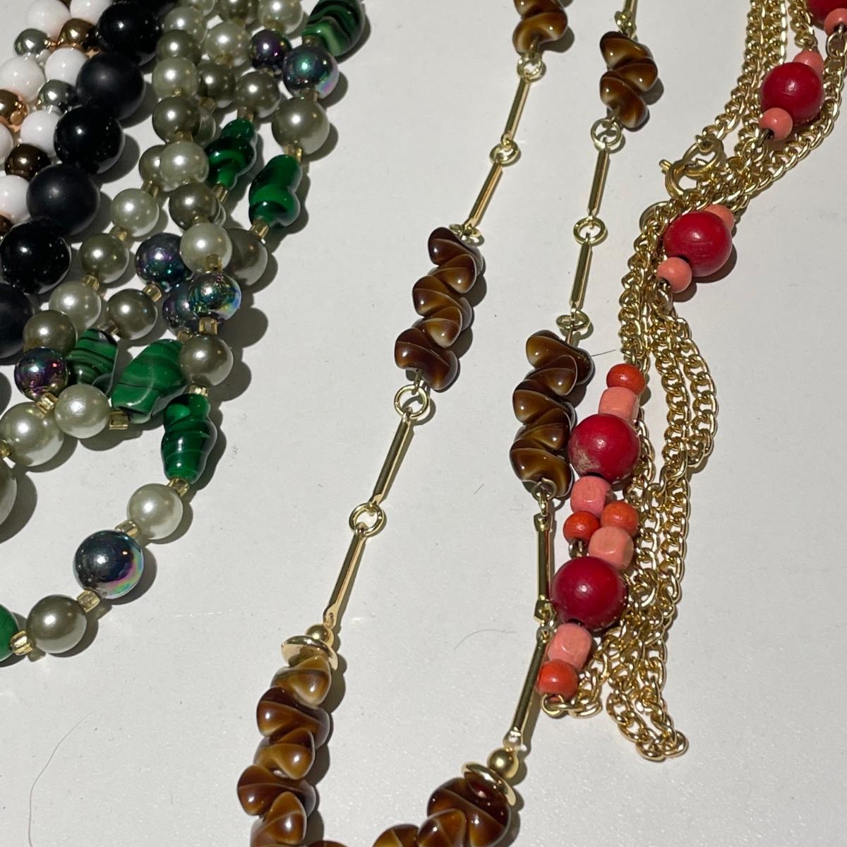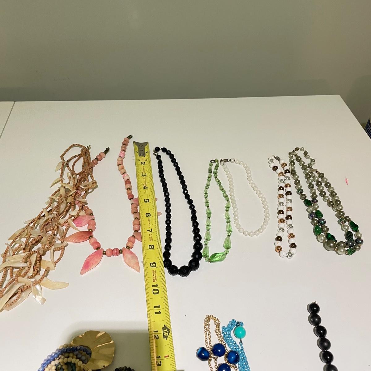 Several stylish beaded necklaces. The pink leaf necklaces feels similar to Jade, other necklaces have shells and colorful pearl-like beads. Quite a few would be best worn layered and are over 26” long. See images. Shipping available.