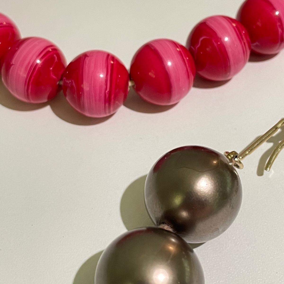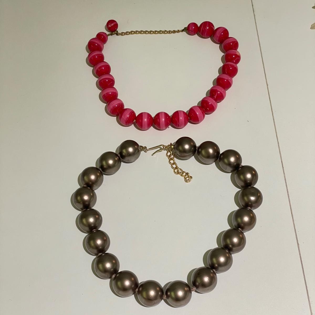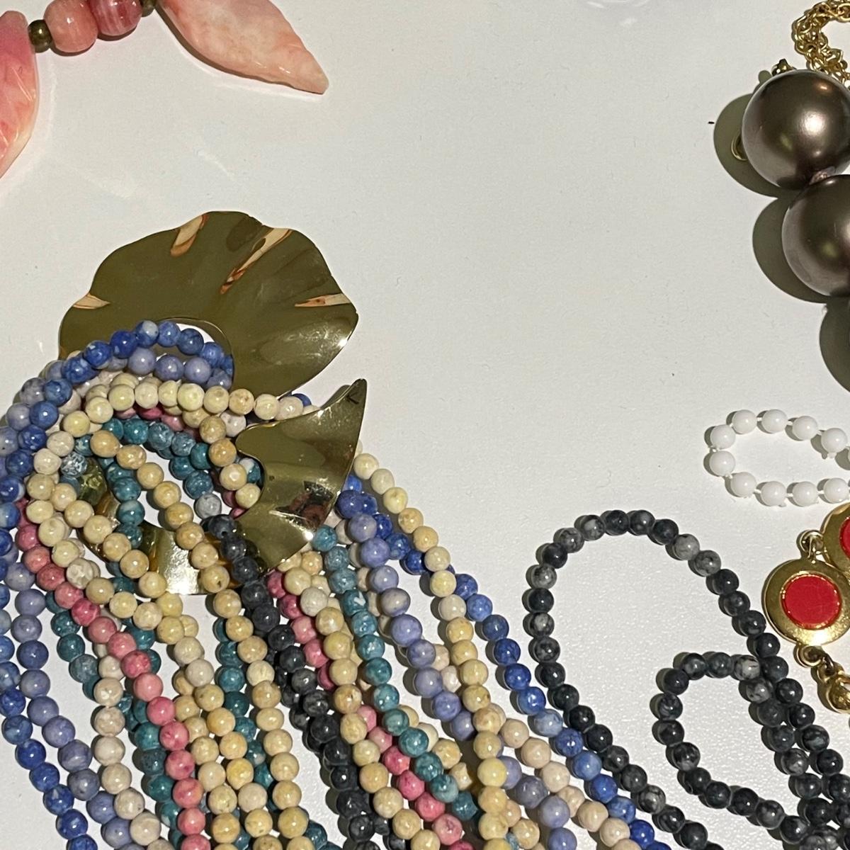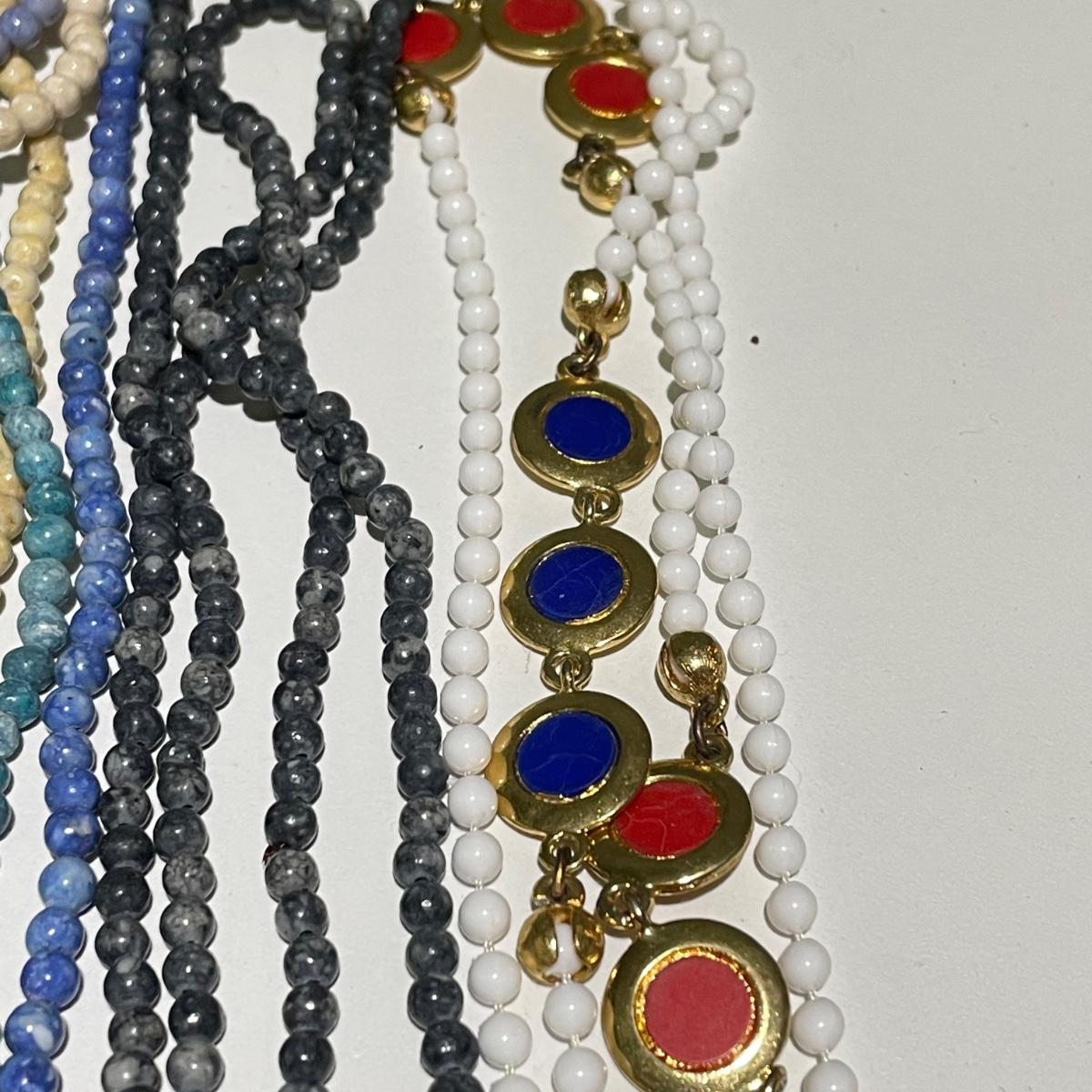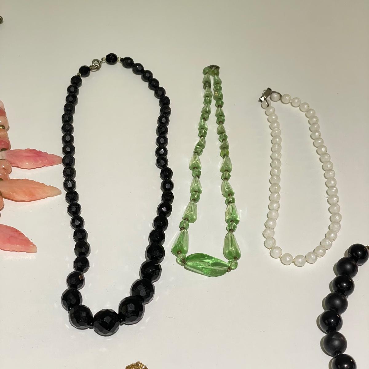 Several stylish beaded necklaces. The pink leaf necklaces feels similar to Jade, other necklaces have shells and colorful pearl-like beads. Quite a few would be best worn layered and are over 26” long. See images. Shipping available.
