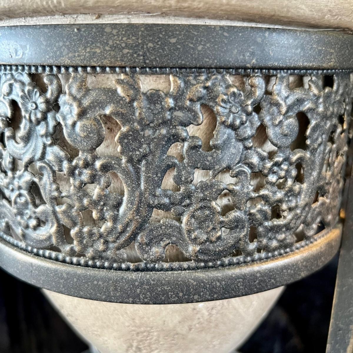 Two Stone-like Resin Lamps with Metal Stands. Lamps meas. 33”h and can use 150 watt 3way bulbs. Finials do not match and one shade has a 1cm tear.