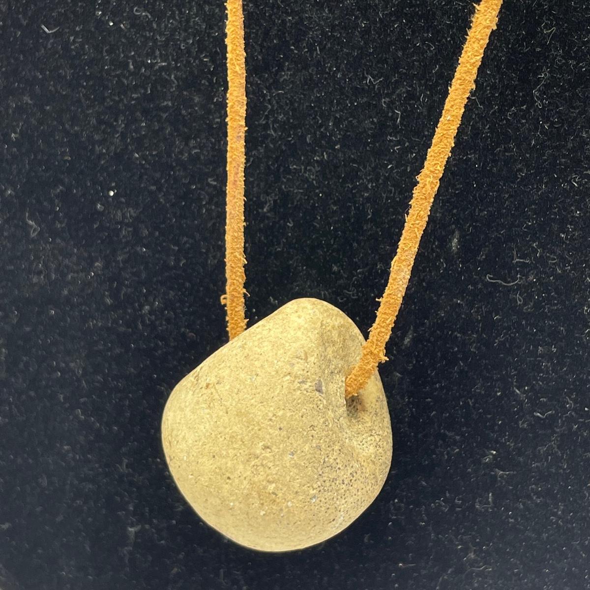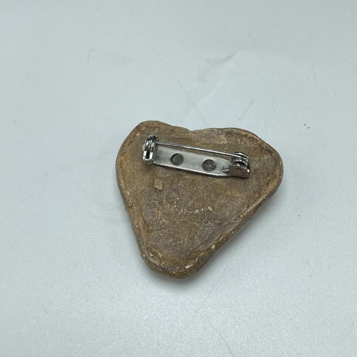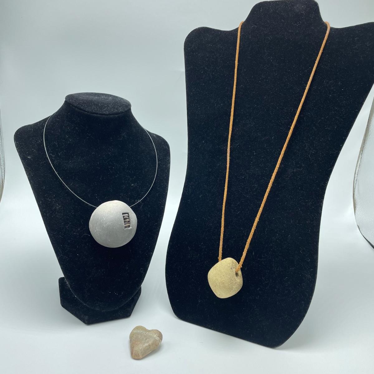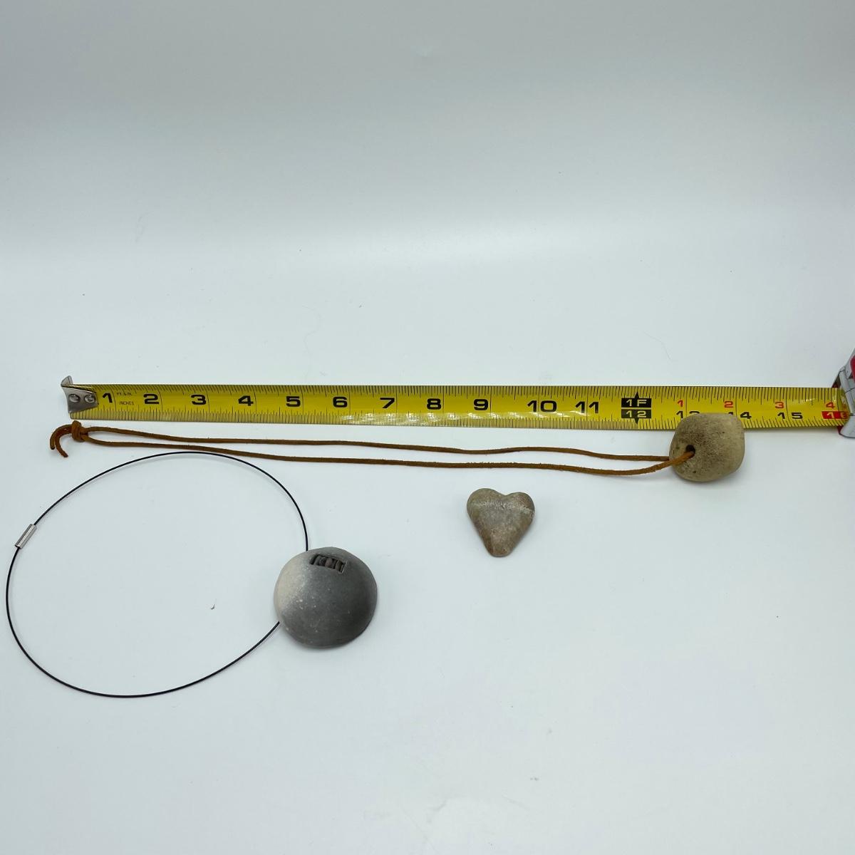 Stone heart shaped brooch and a stone pendant on a leather cord. Lot also features a moon colored signed pendant that appears to be pottery featuring real pebbles. See images. Shipping available.