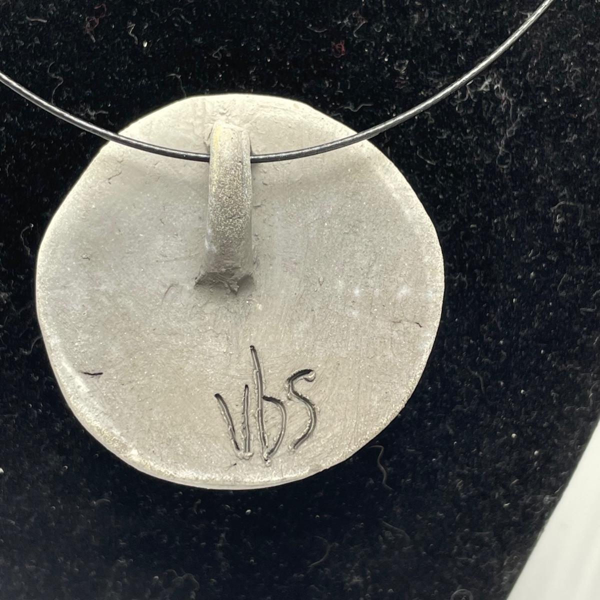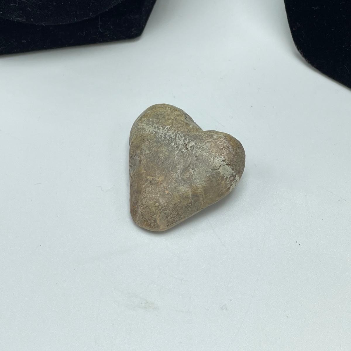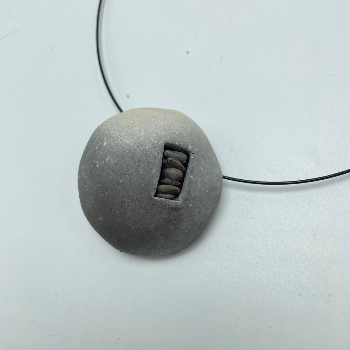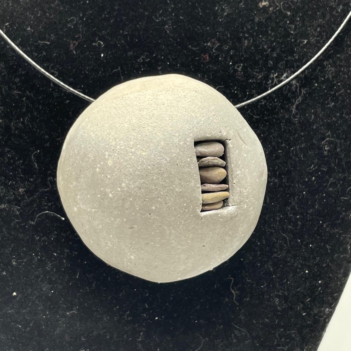 Stone heart shaped brooch and a stone pendant on a leather cord. Lot also features a moon colored signed pendant that appears to be pottery featuring real pebbles. See images. Shipping available.