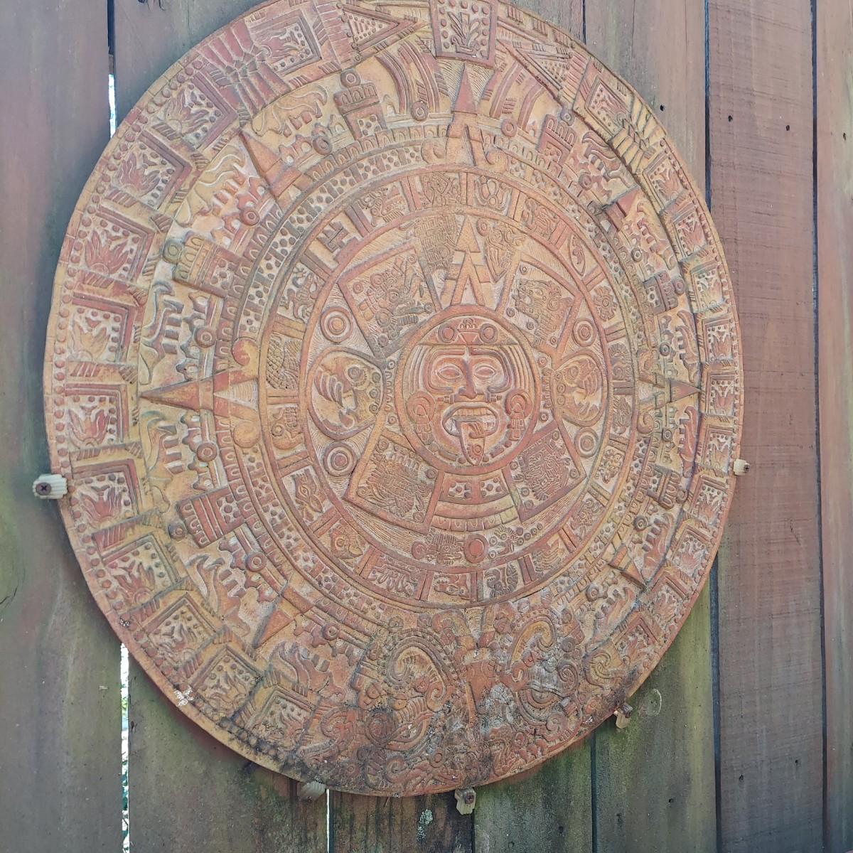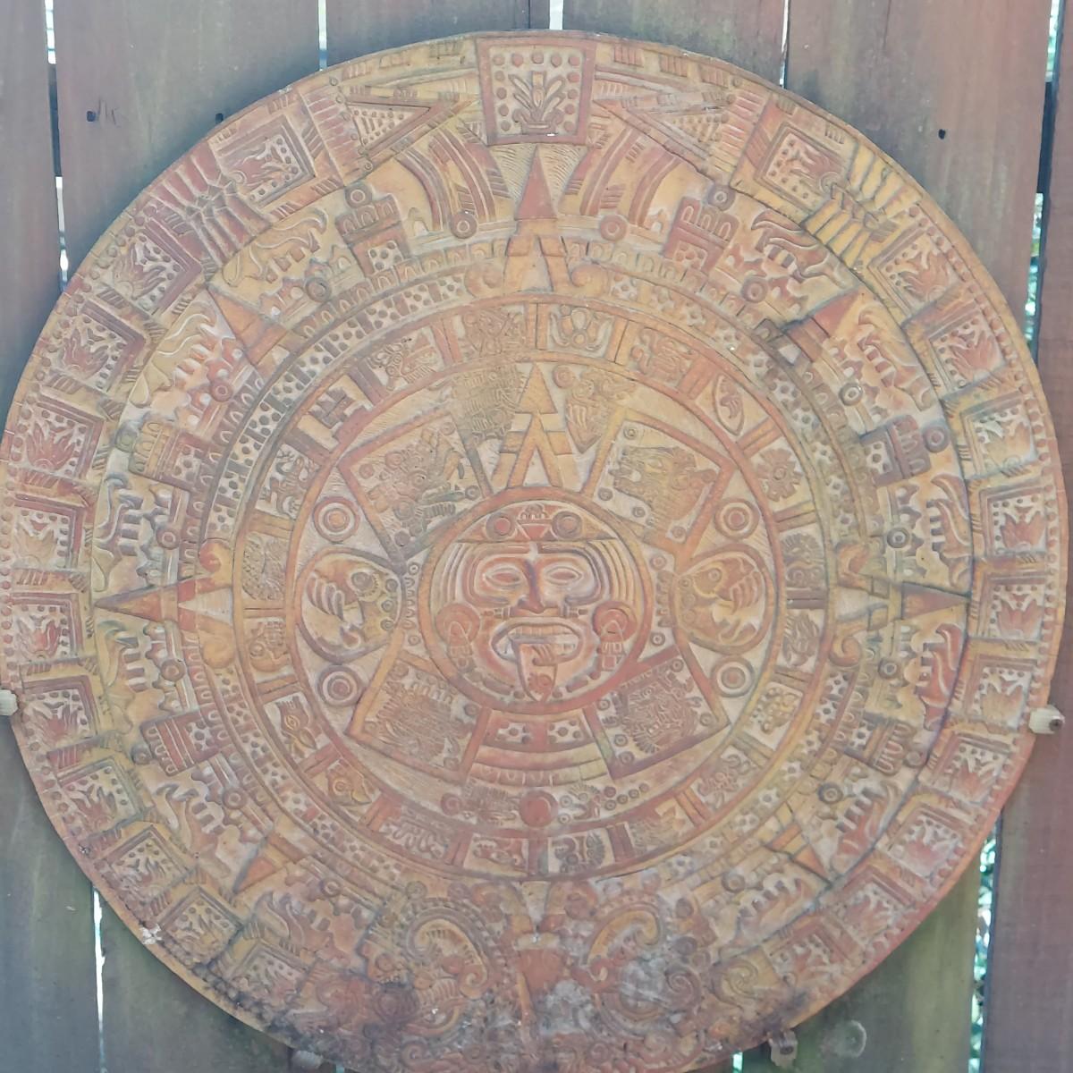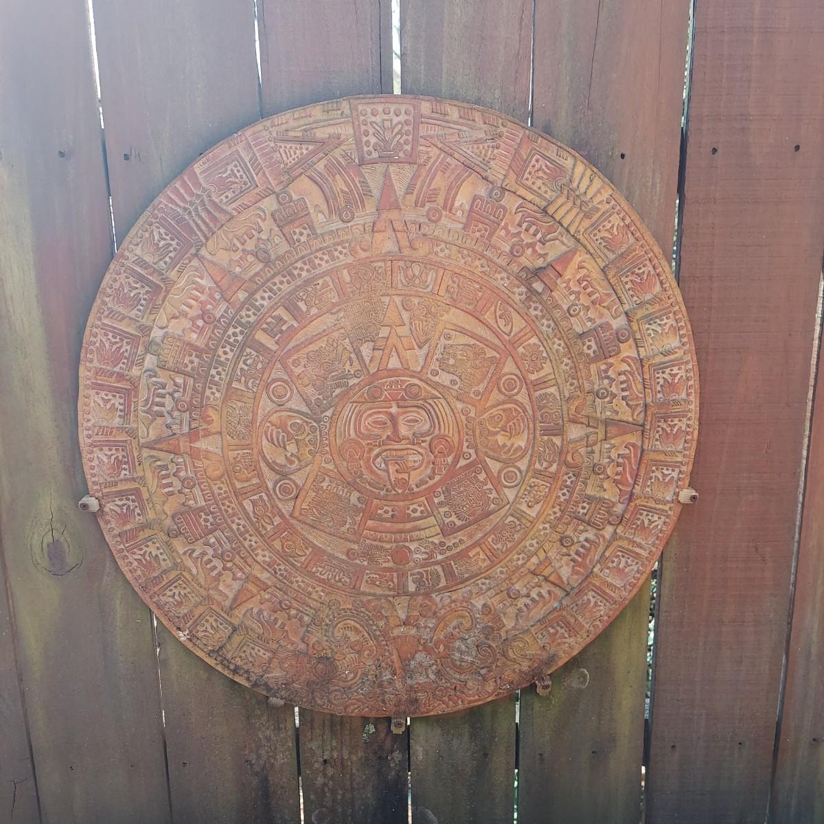 Large stone wall hanging. Appears to be poured cement formed into The Aztec Calendar. Measures 24"D across. Please see photos for details. Local Pickup Only
