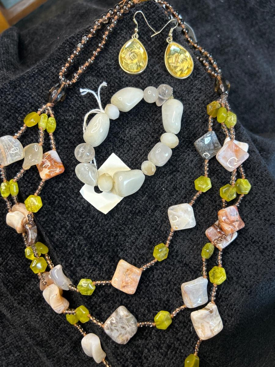The necklace is agates & smoky quartz. The bracelet is milky quartz & stretchy. The earrings are not stone, but 3D w/ flowers inside (super cool)