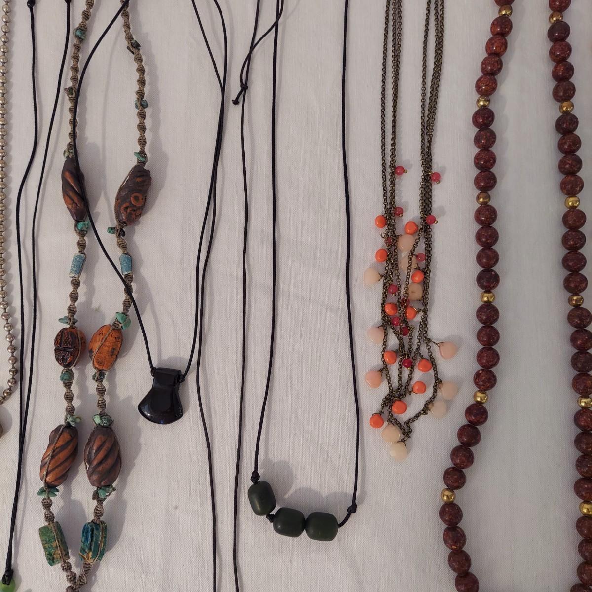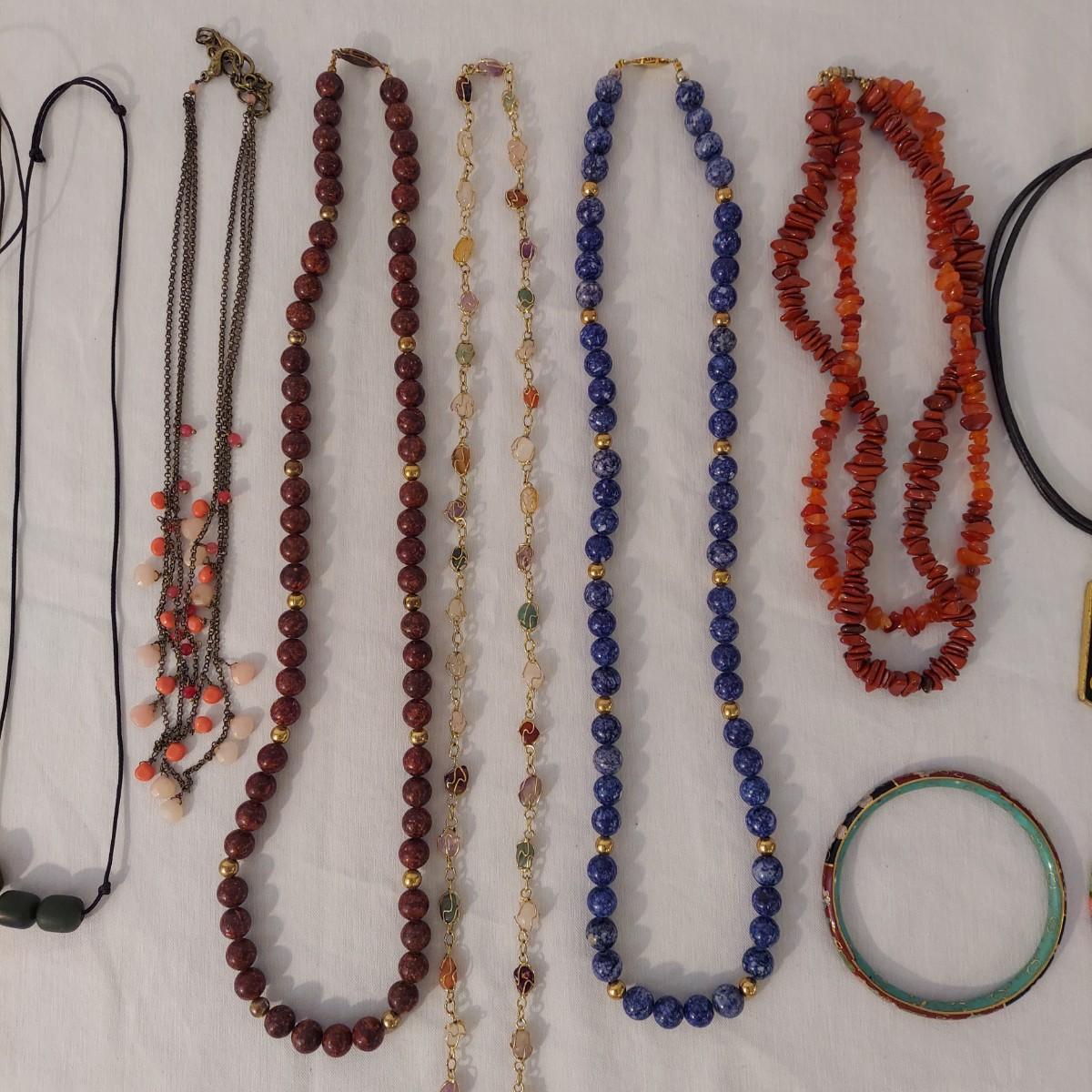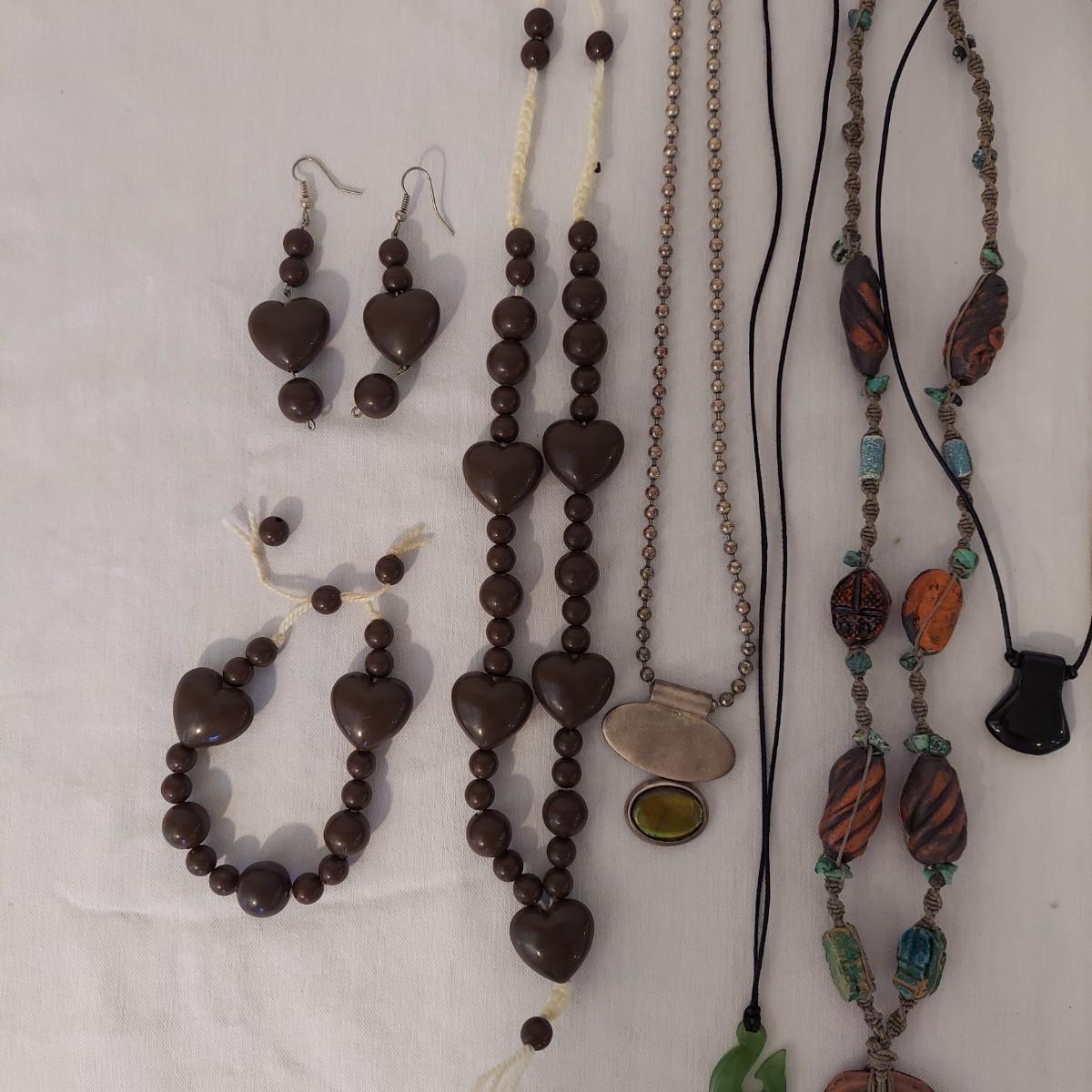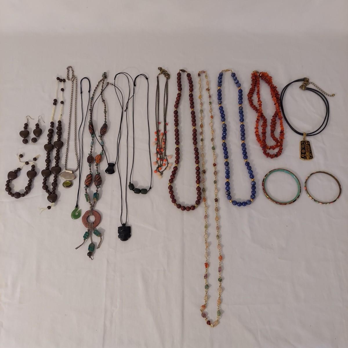 Lot includes 10+ necklaces with wood and stone beads. One necklace with hearts comes with a matching bracelet and pair of earrings for pierced ears. Appears to include lapis lazuli, quartz, chalcedony, jade and more. Necklaces range from 14-44” long. Please see photos for details. Shipping available. All sales are final. No returns or refunds. Please bid accordingly.