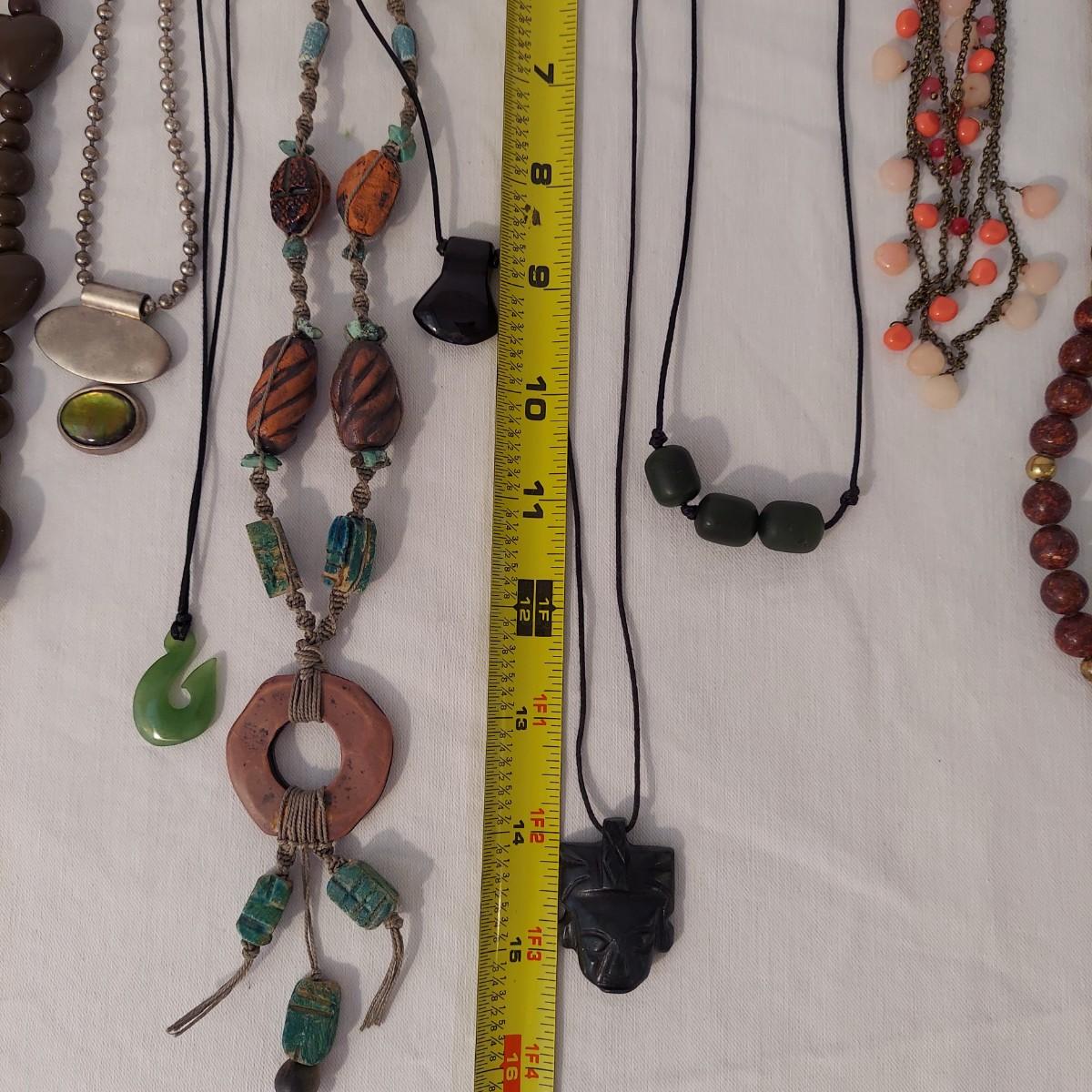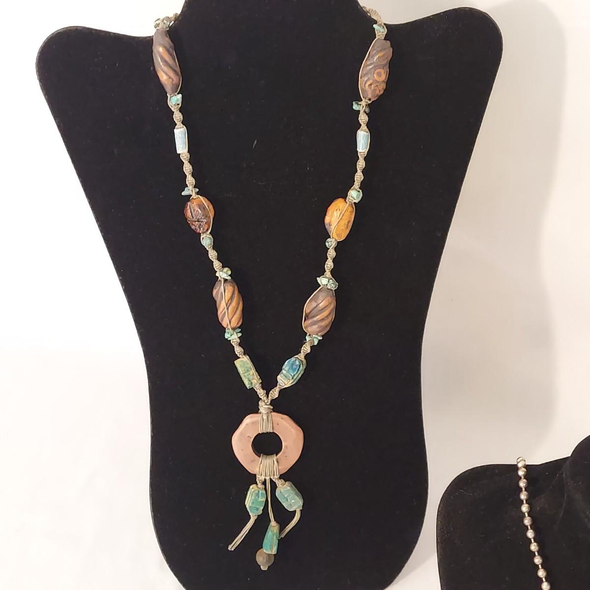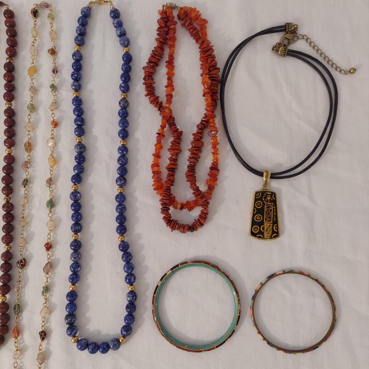 Lot includes 10+ necklaces with wood and stone beads. One necklace with hearts comes with a matching bracelet and pair of earrings for pierced ears. Appears to include lapis lazuli, quartz, chalcedony, jade and more. Necklaces range from 14-44” long. Please see photos for details. Shipping available. All sales are final. No returns or refunds. Please bid accordingly.