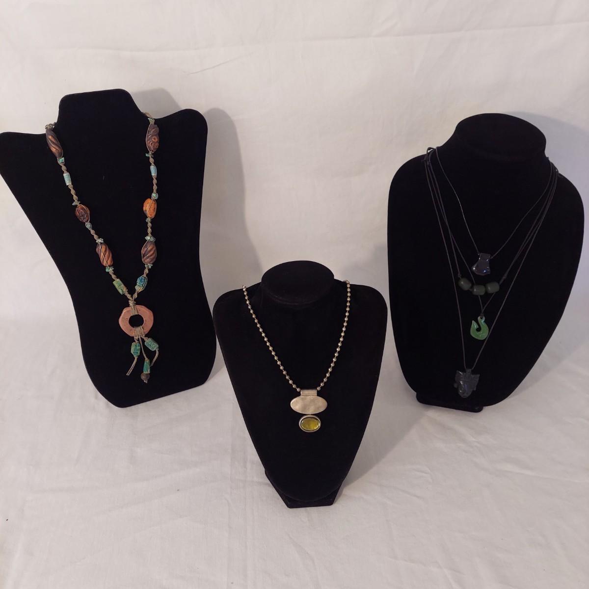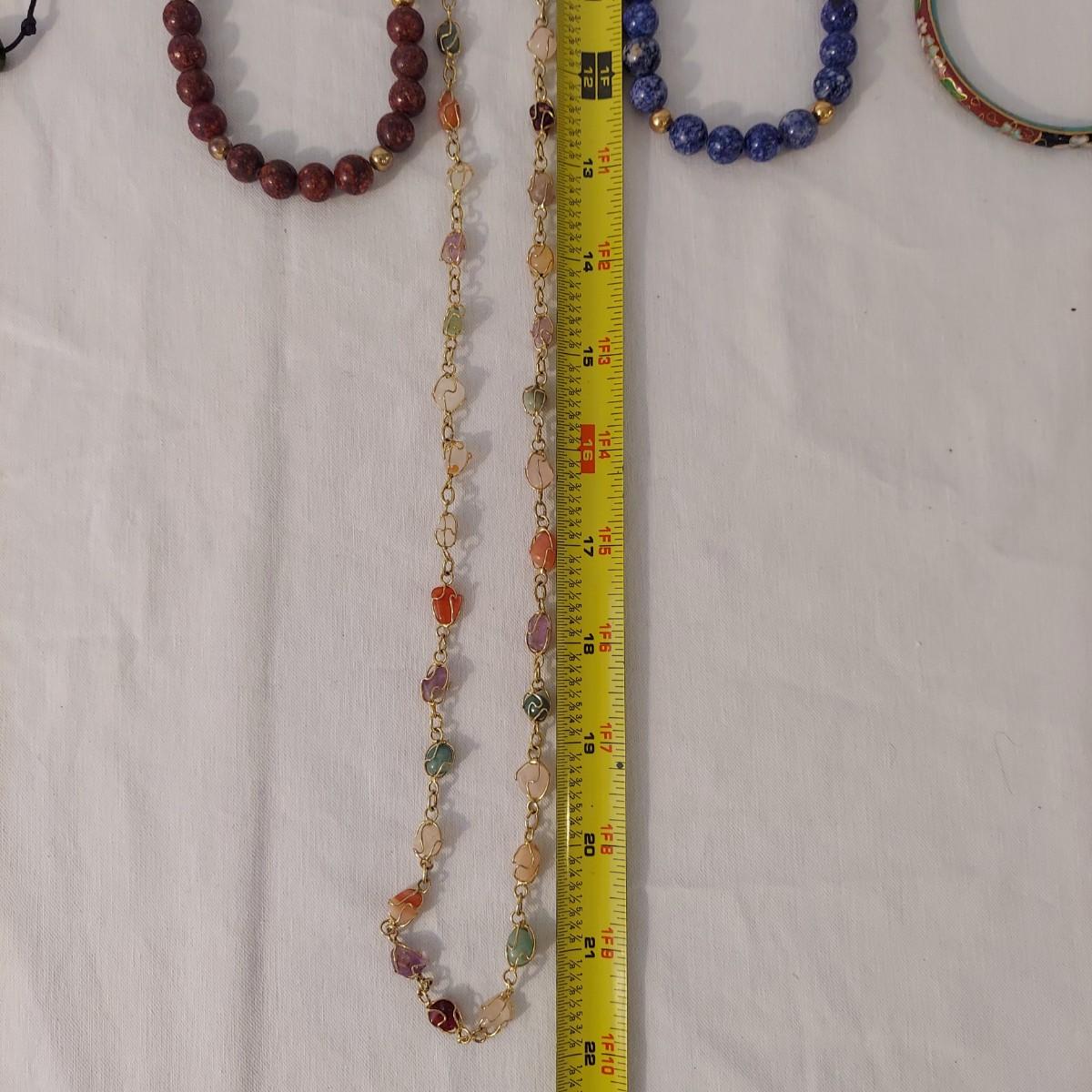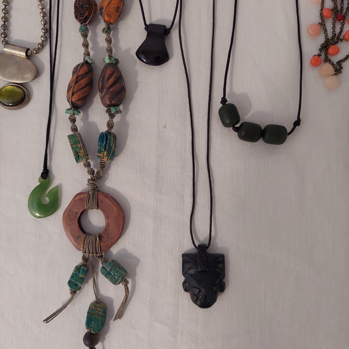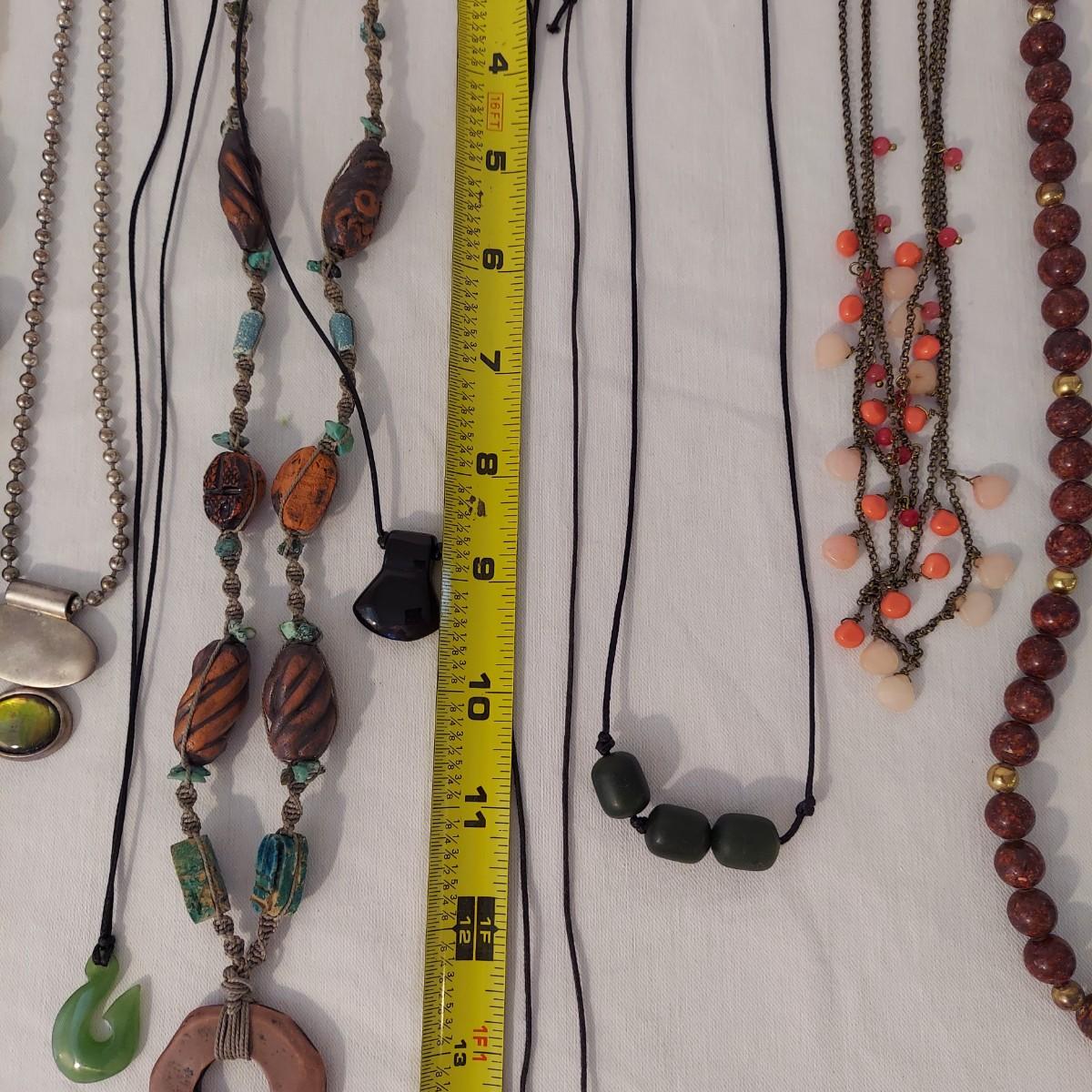 Lot includes 10+ necklaces with wood and stone beads. One necklace with hearts comes with a matching bracelet and pair of earrings for pierced ears. Appears to include lapis lazuli, quartz, chalcedony, jade and more. Necklaces range from 14-44” long. Please see photos for details. Shipping available. All sales are final. No returns or refunds. Please bid accordingly.