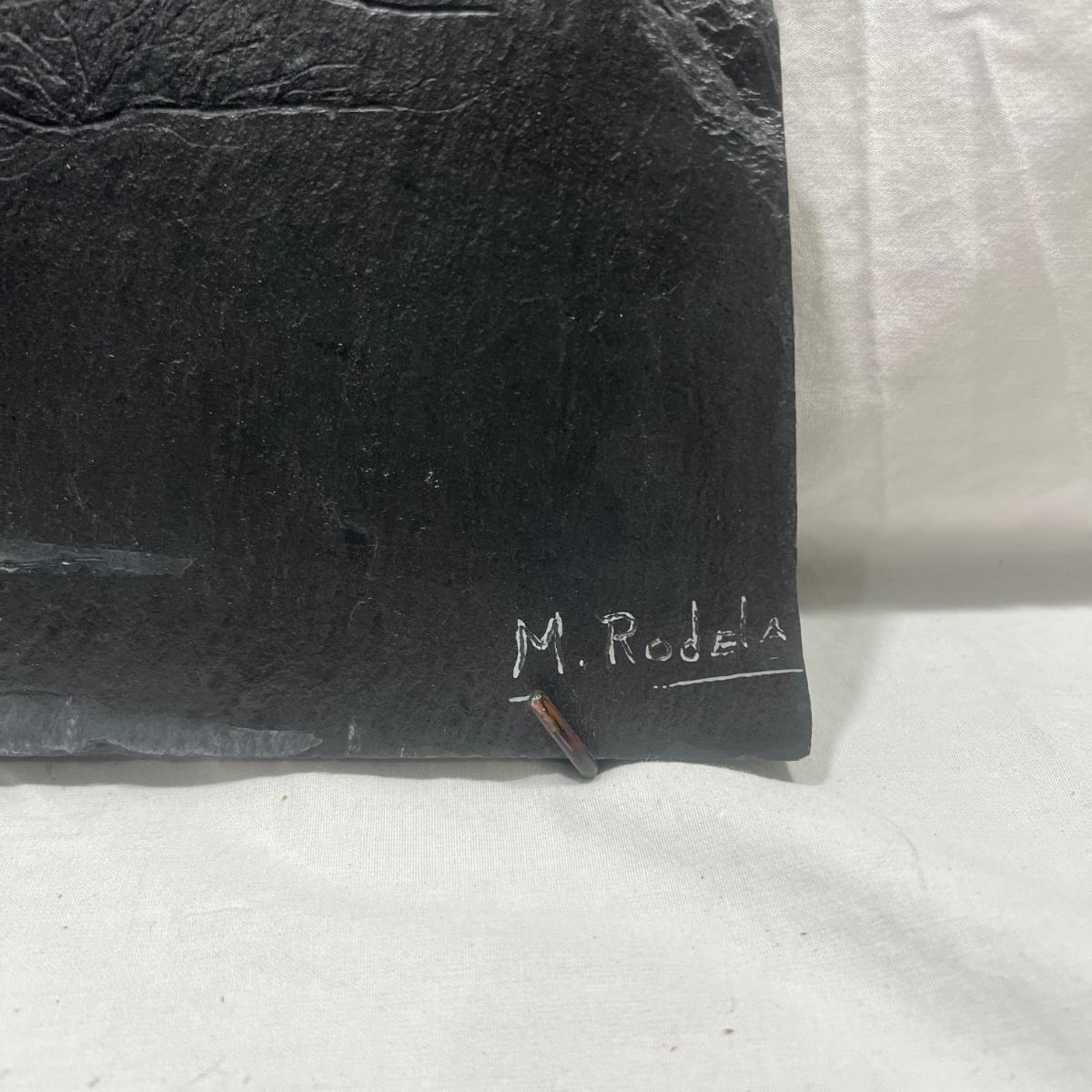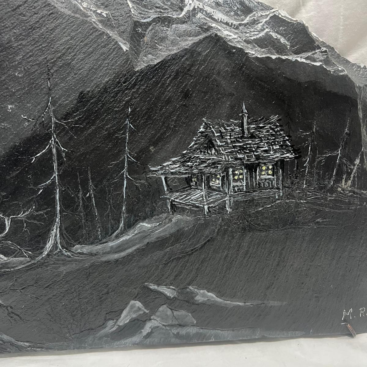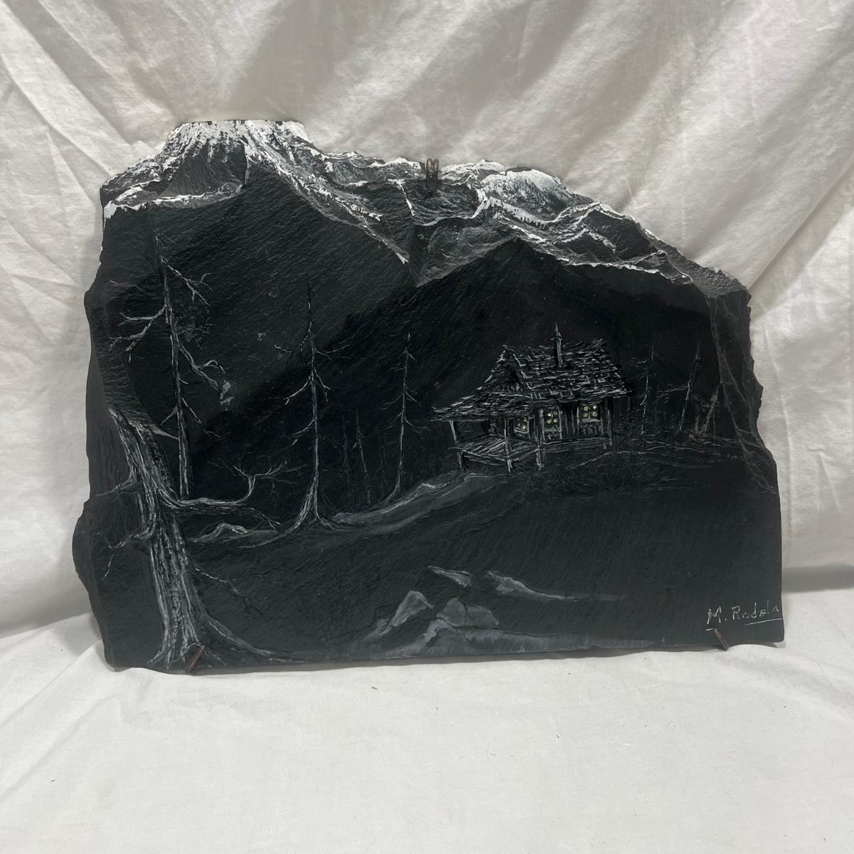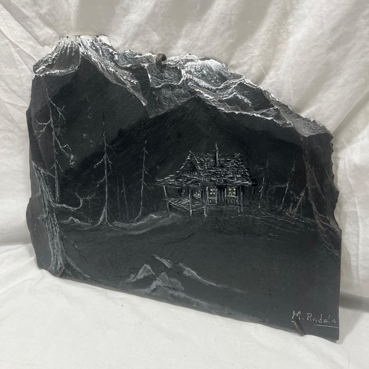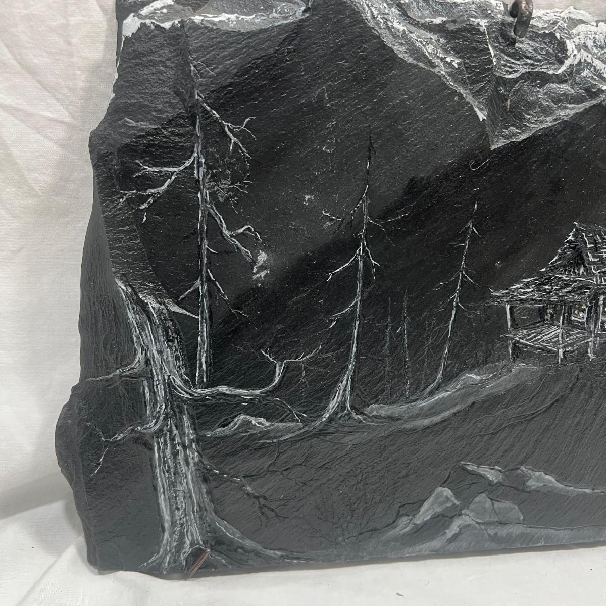 Stone carved and painted unique art of winter cabin landscape by mel rodela roughly 16 1/2" x 12"