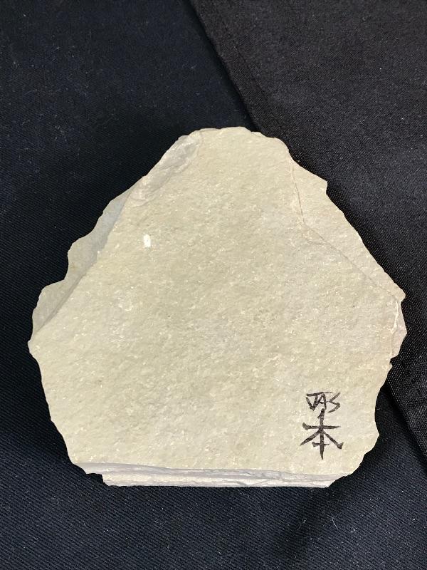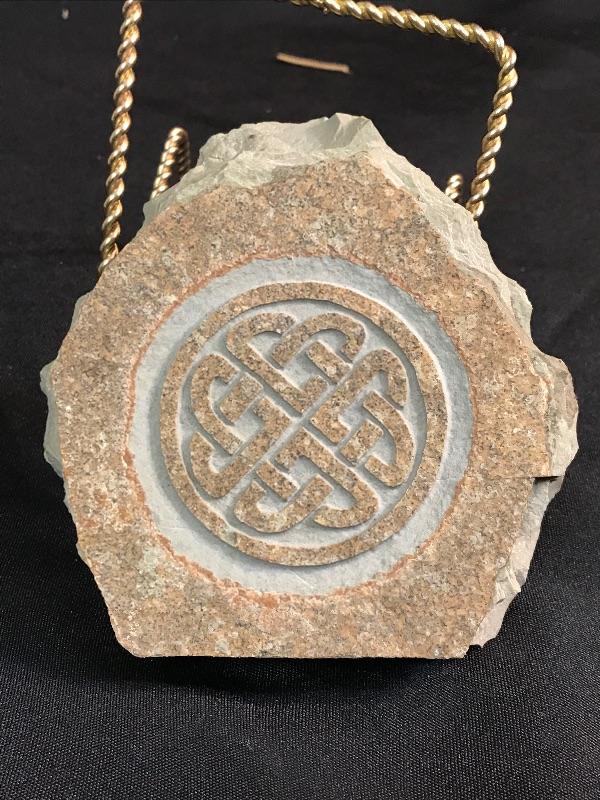 Up for auction is a decorative stone coaster with an etched motif on the front. The bottom is signed, “JAS“ above a symbol.