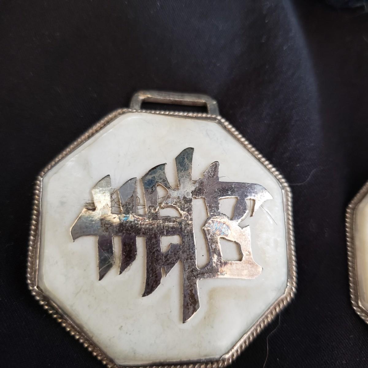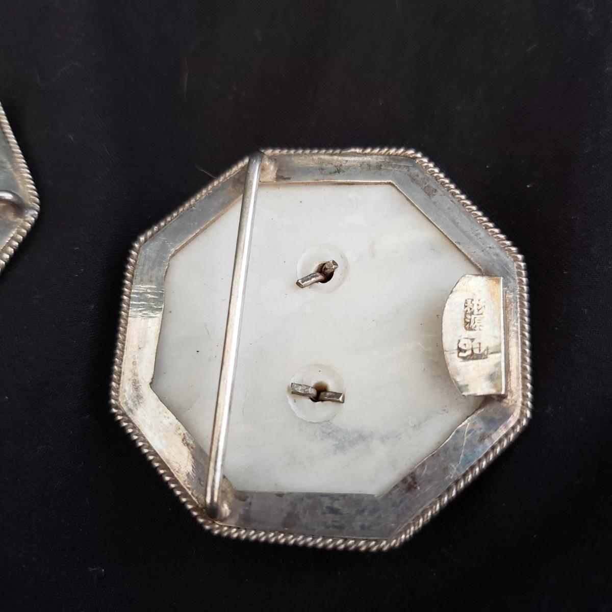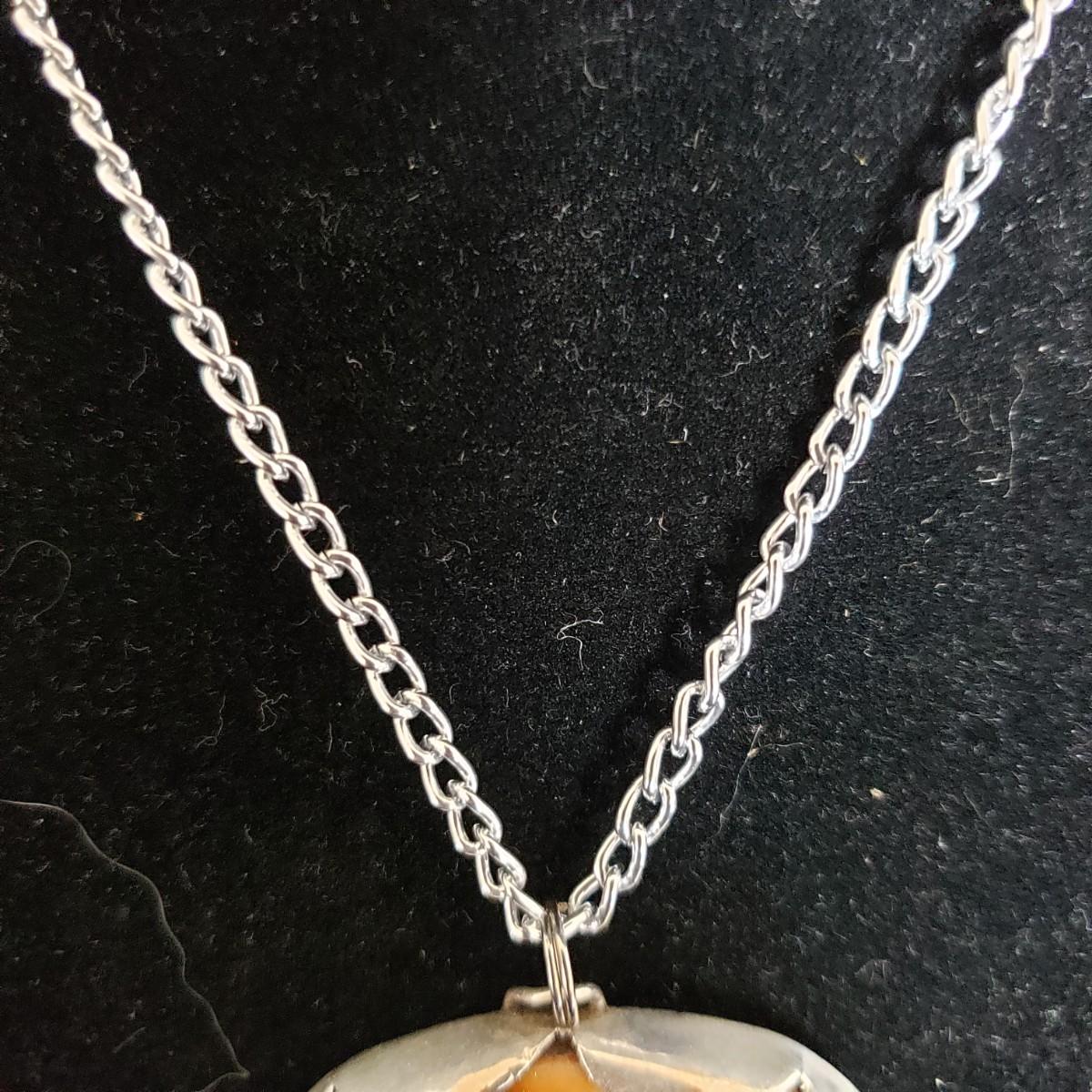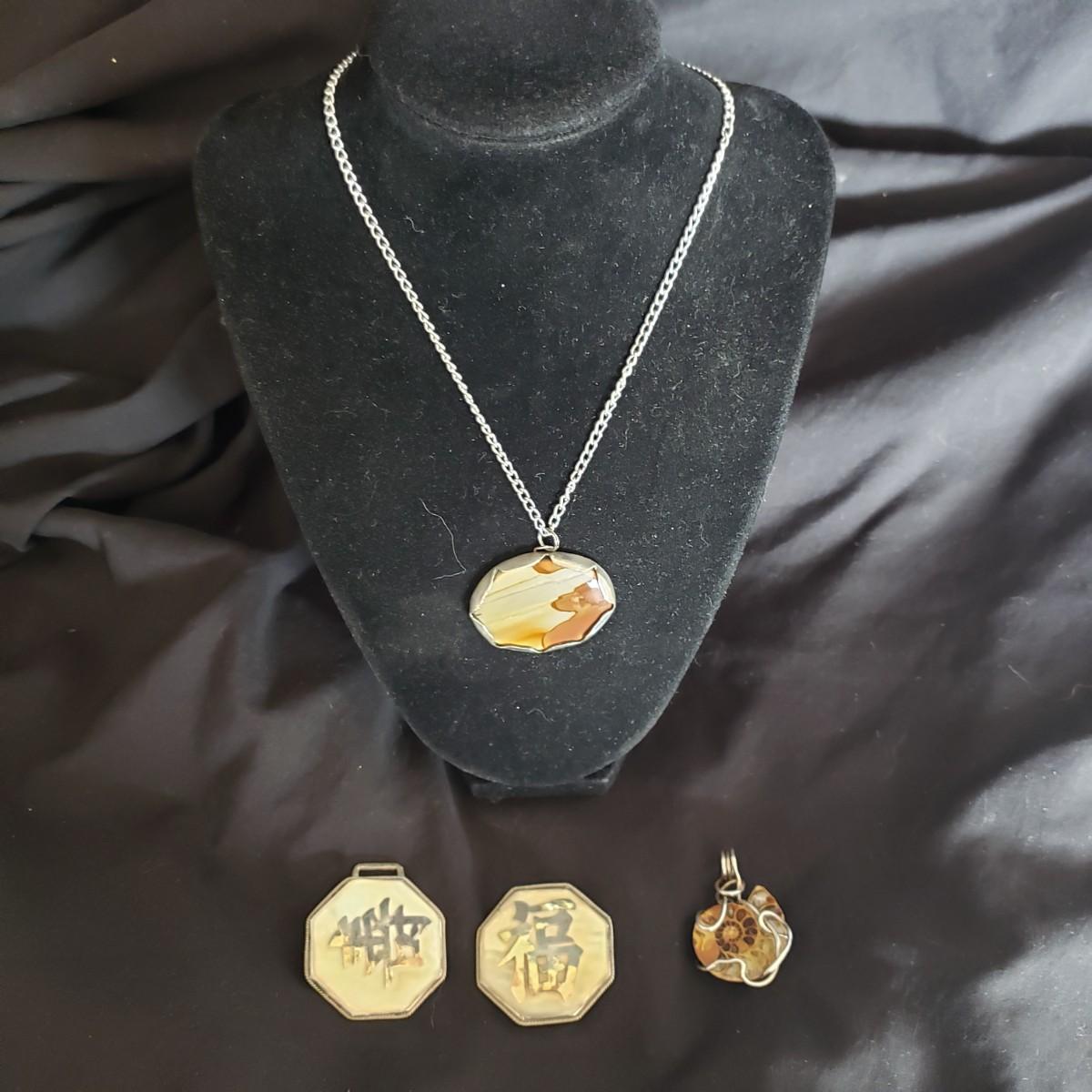 This four piece lot has two pendants and a matching pearl-like belt clip set. The handcrafted stone pendant on a silver-colored chain necklace is wrapped in a metal casing. The chain measures 14". The Nautilus pendant (2" x 1") is finely wrapped in a silver like wire, just ready for your chain. The two Asian inspired buckles appear to be on a mother of pearl back with silver like inscriptions.