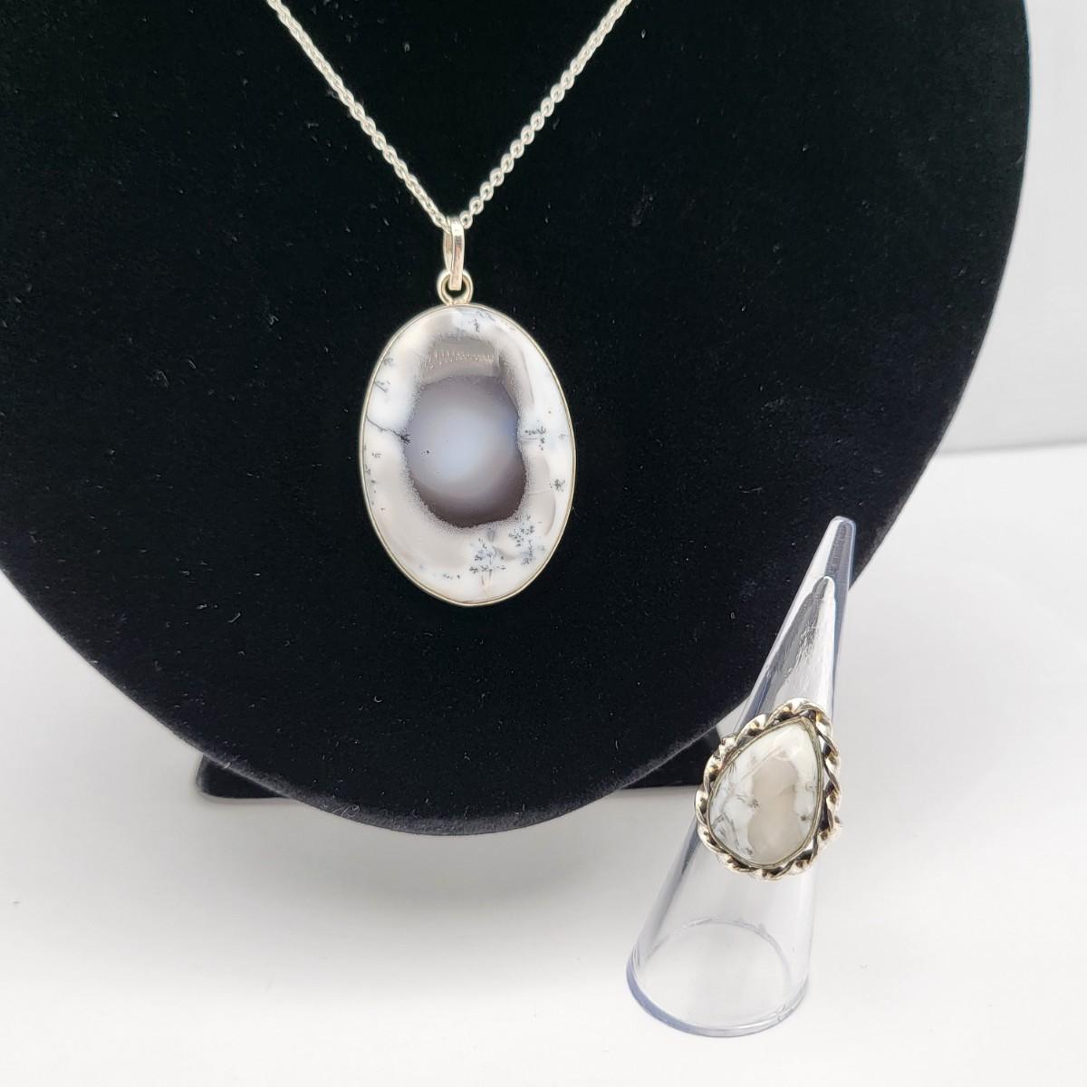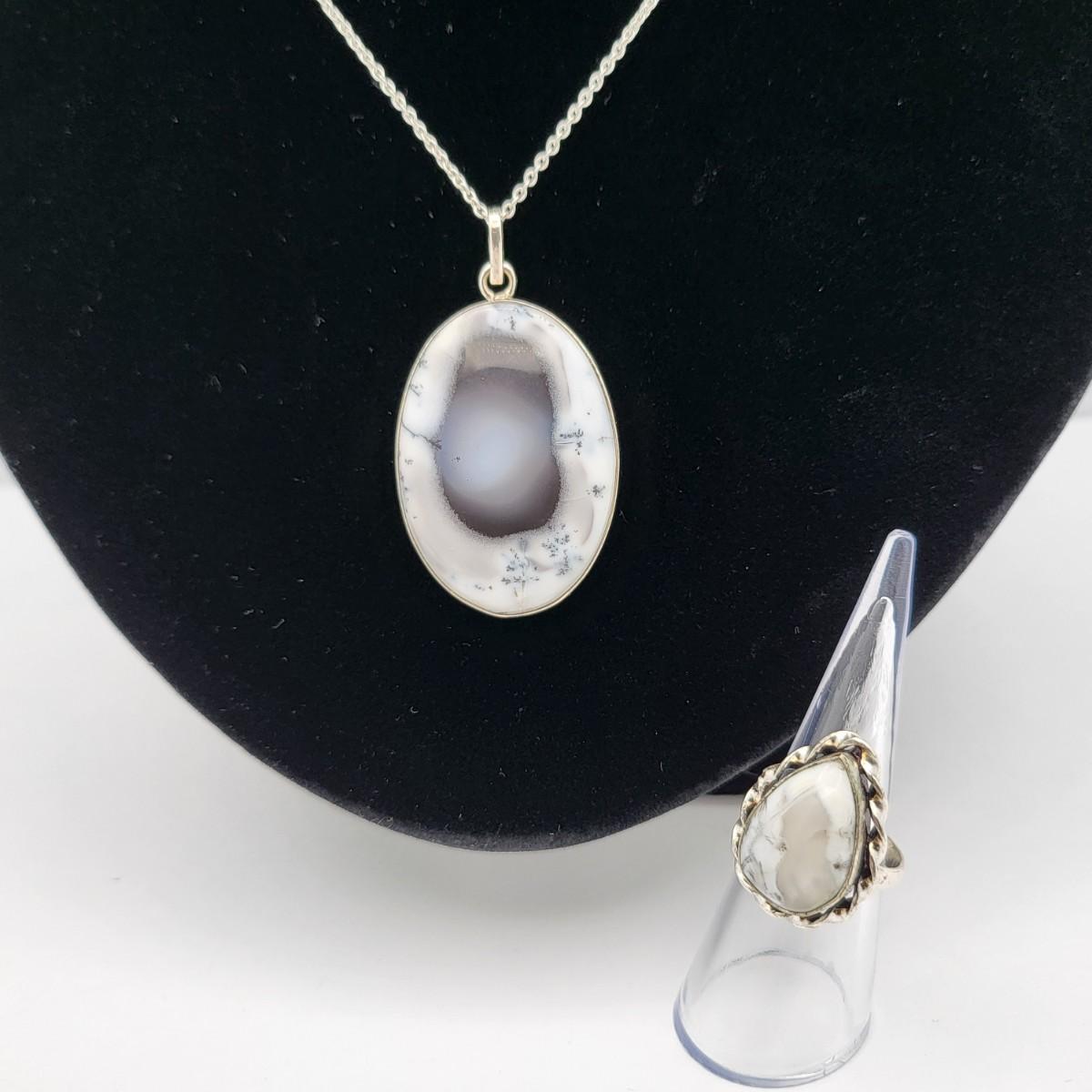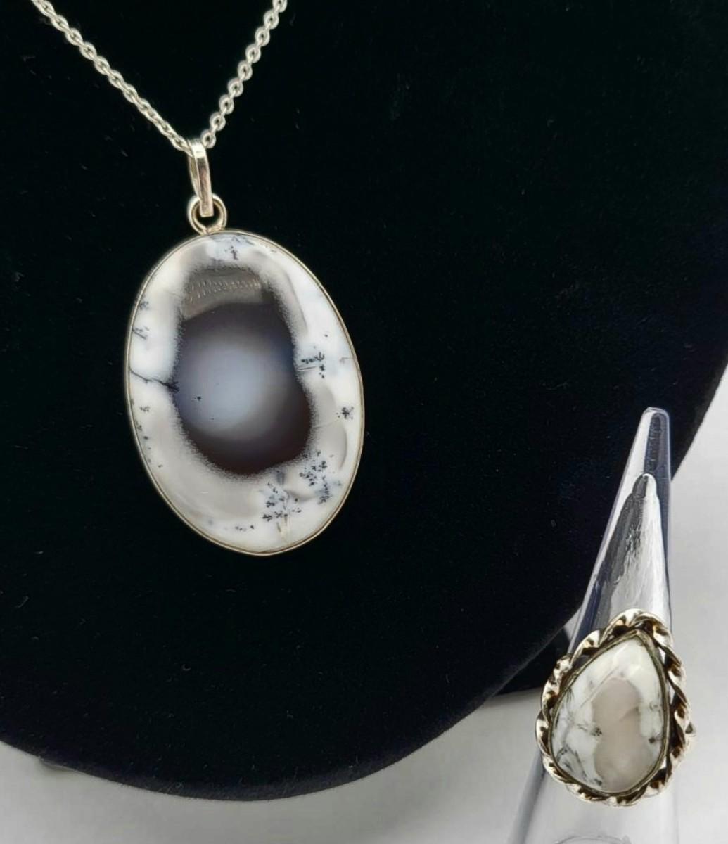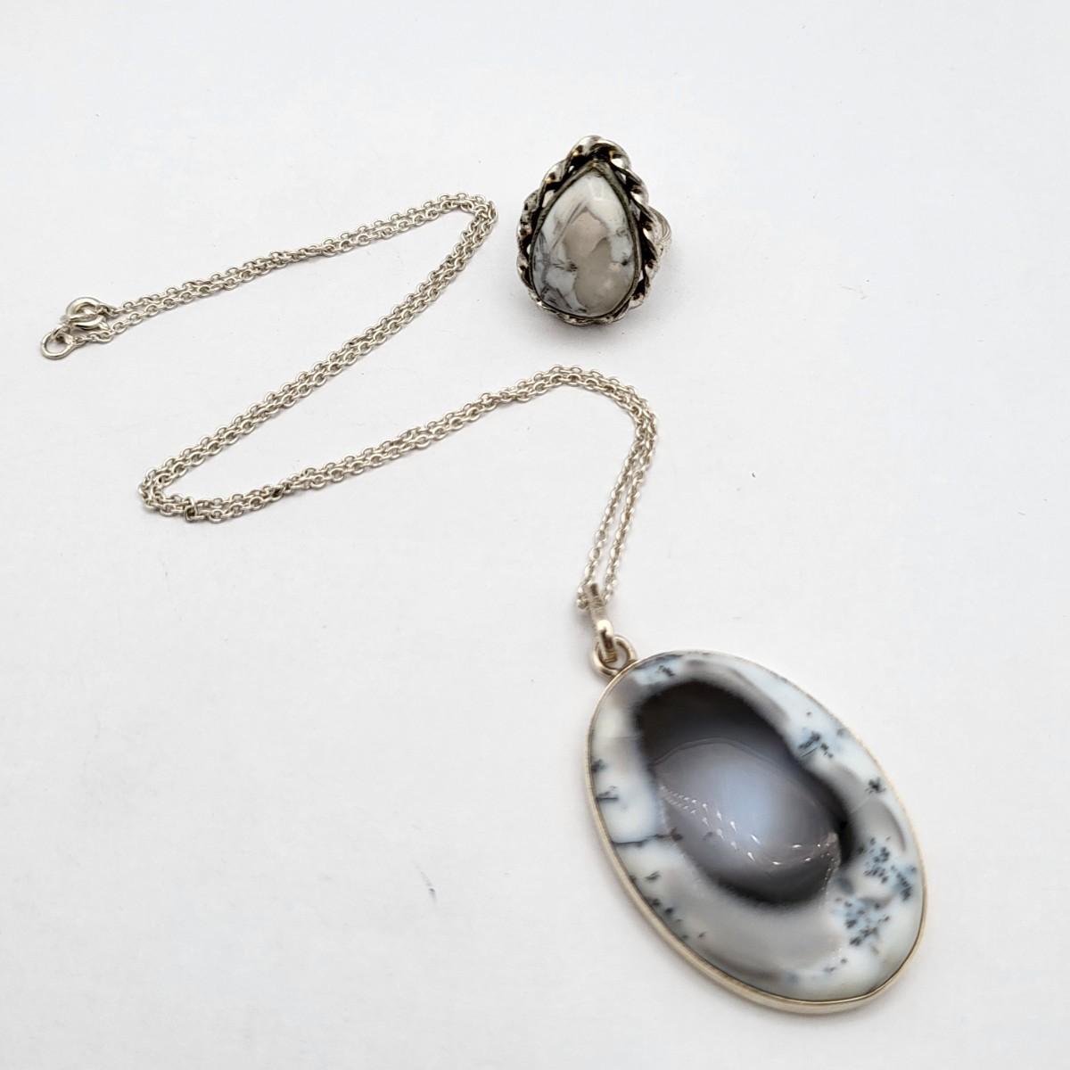 Dentritic agate necklace & ring. Necklace 2.5" x 1.25" including bale. It is on a 17" SS 925 chain. Pear shape ring is a size 6.5