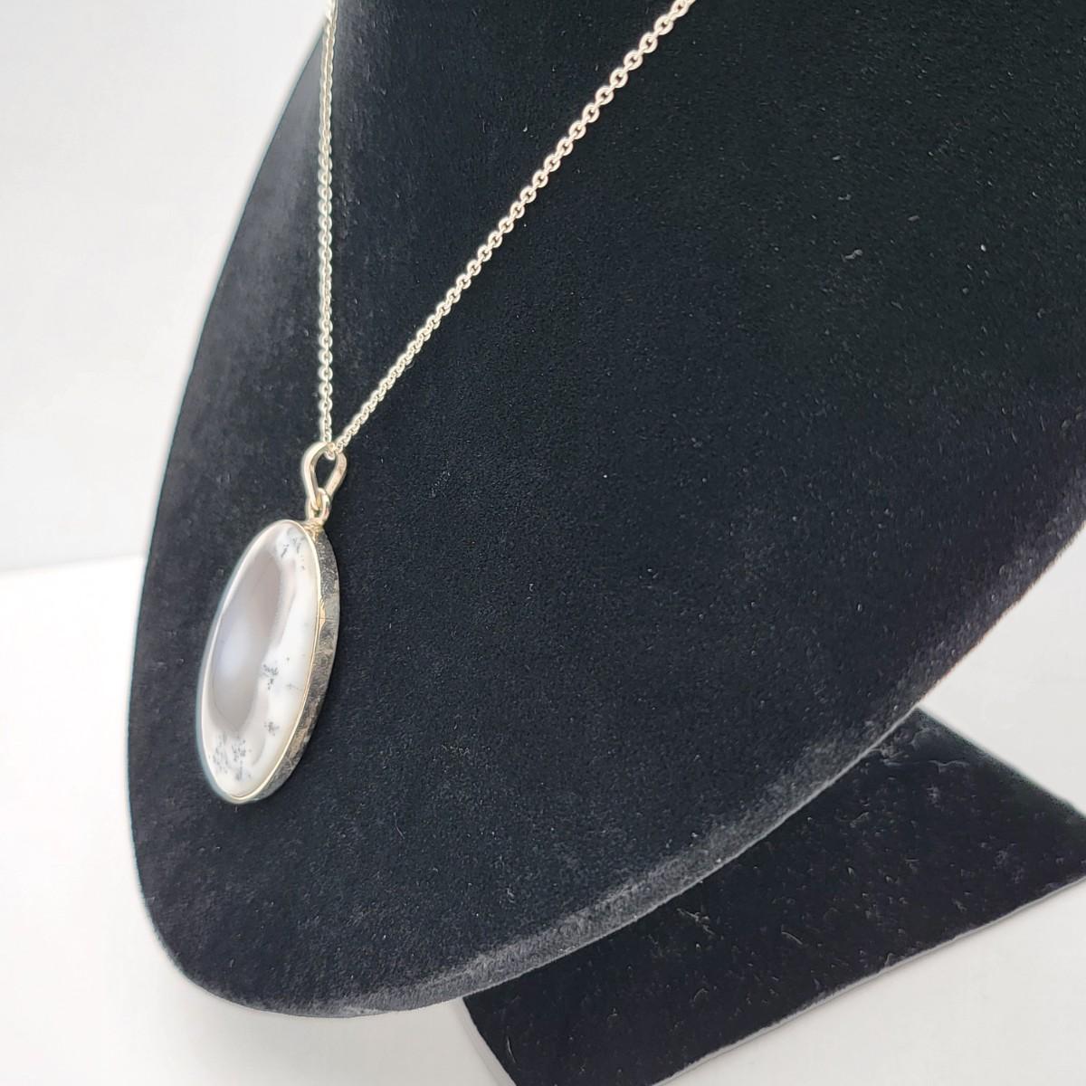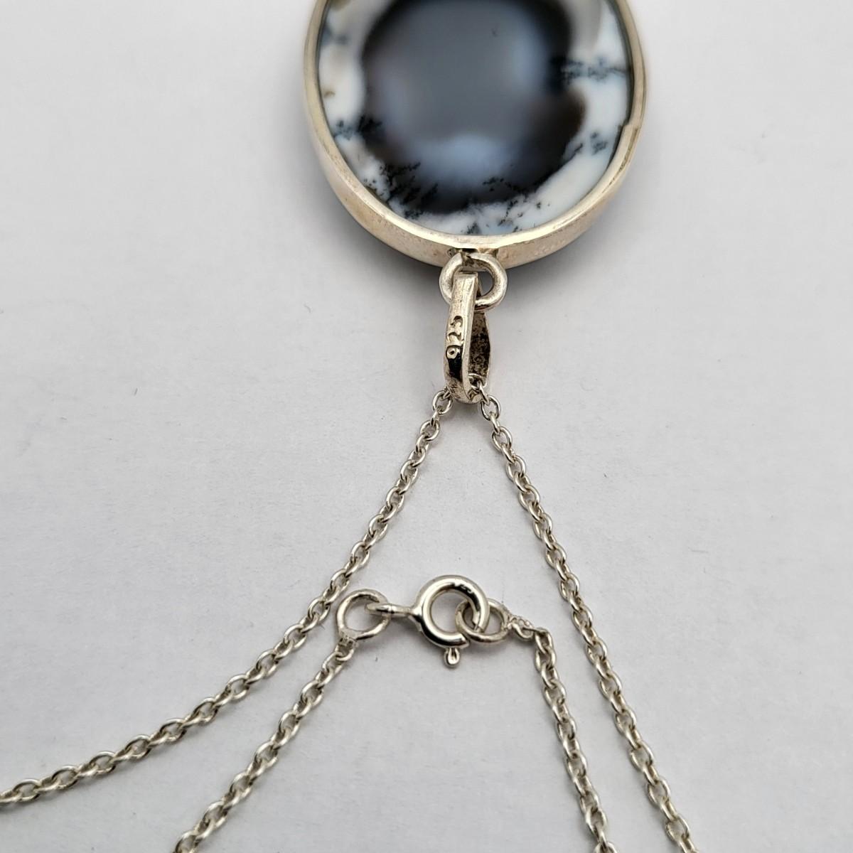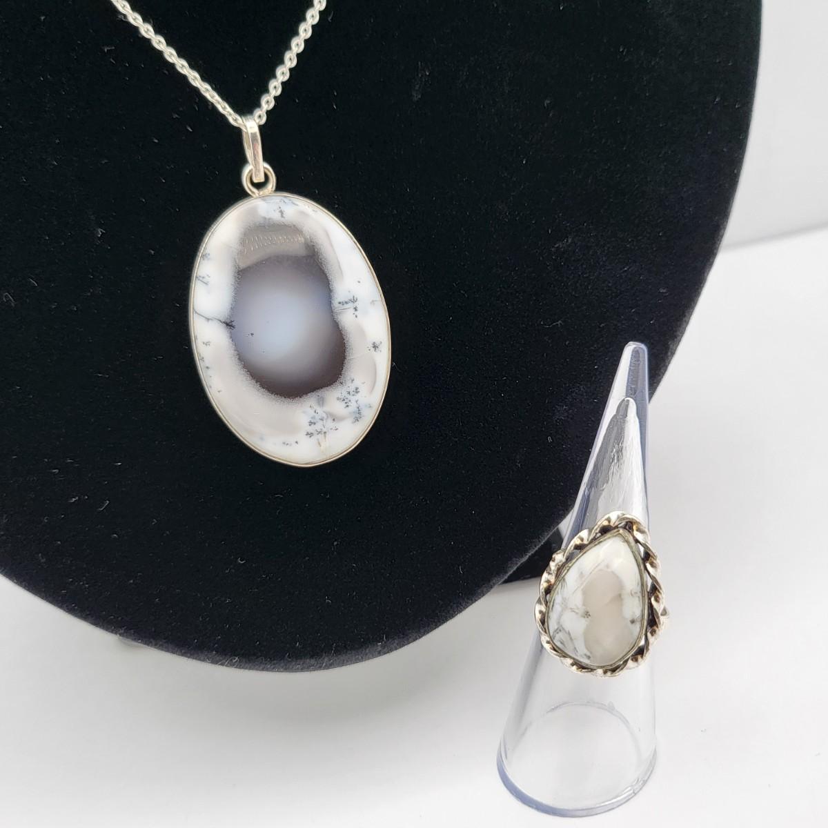 Dentritic agate necklace & ring. Necklace 2.5" x 1.25" including bale. It is on a 17" SS 925 chain. Pear shape ring is a size 6.5