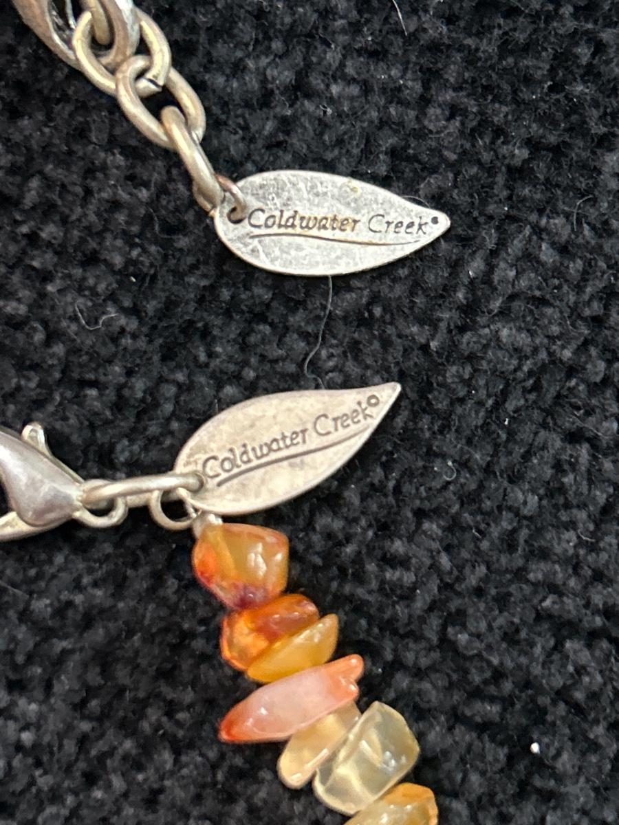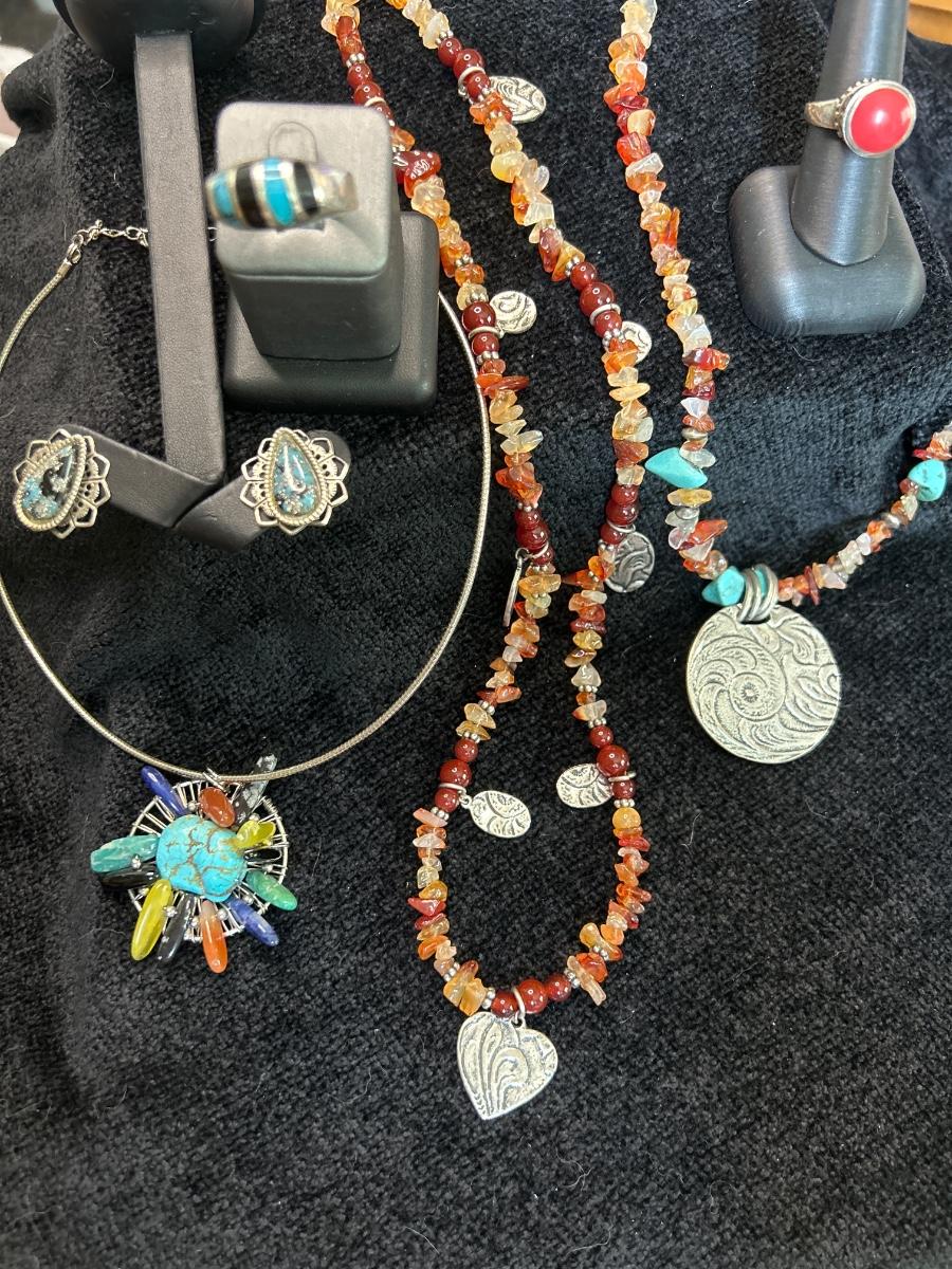 The round chain is Lia Sophia, the stones are carnelian, amber & howlite. The stone necklaces are both Coldwater Creek. The ring is red coral & a size 8. The onyx & howlite ring is a size 12 & stamped 925.