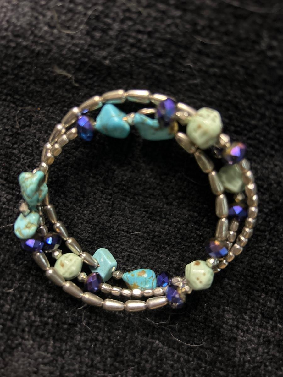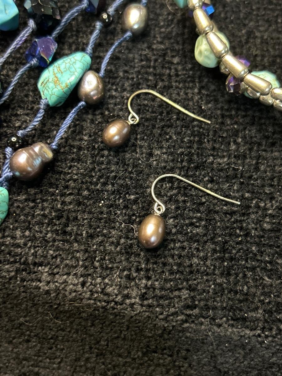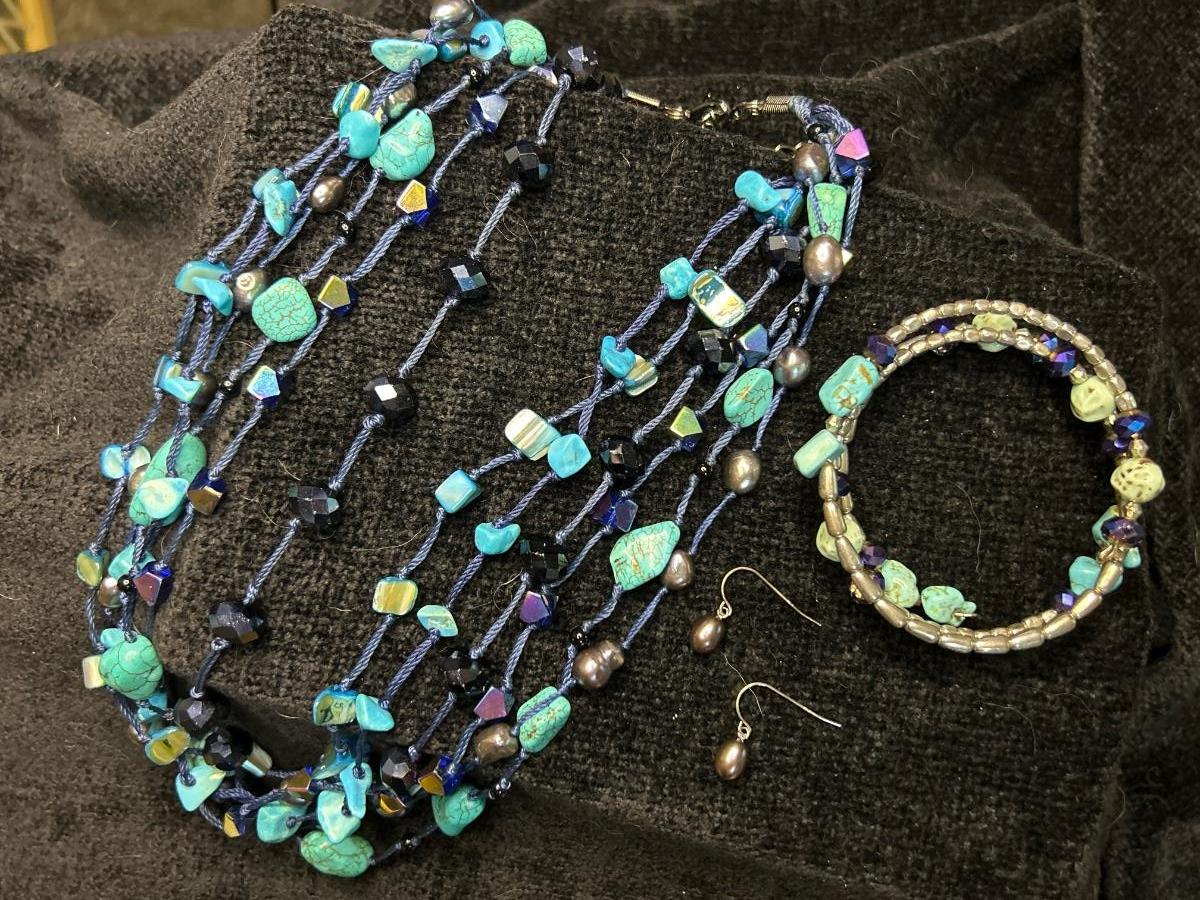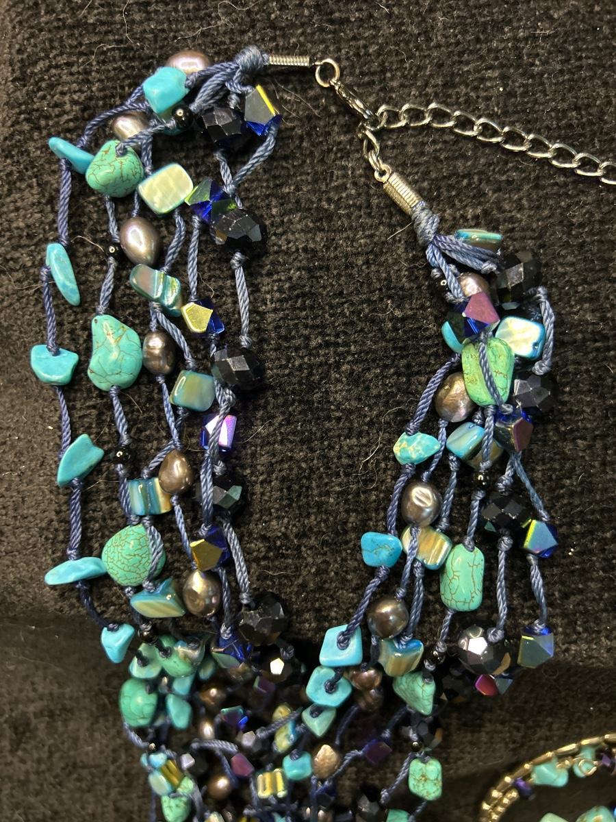 The necklace is six strands very pretty with real pearls. The earrings are also real pearl.