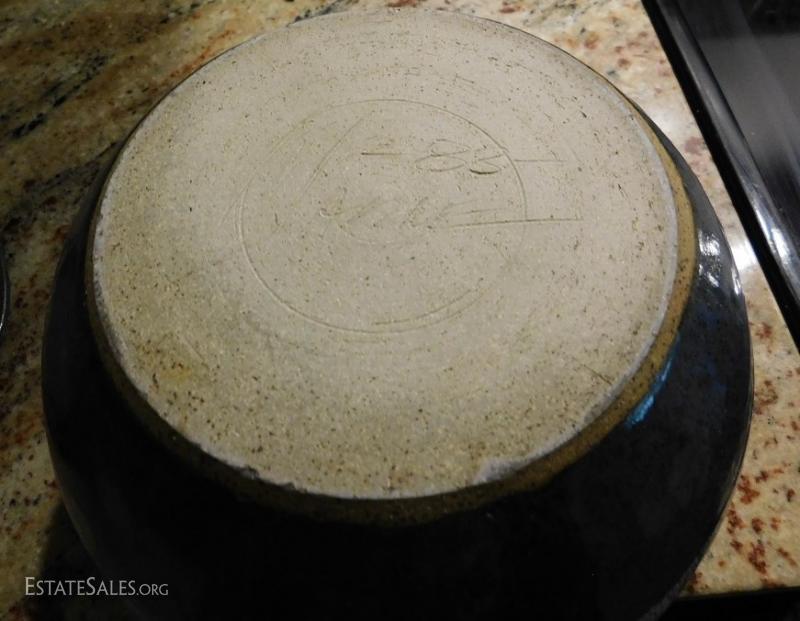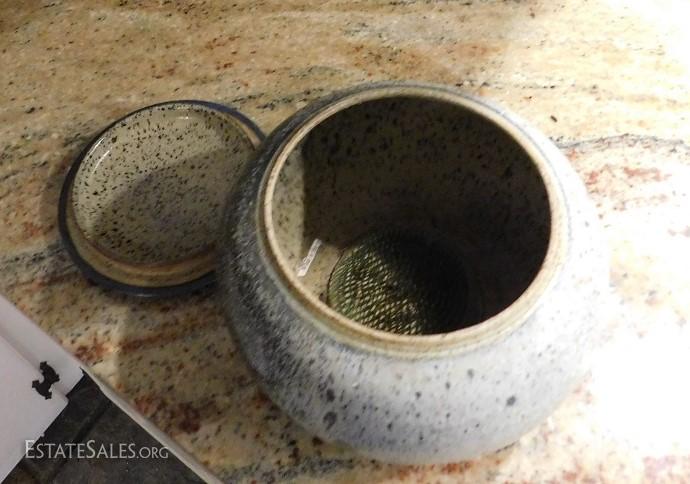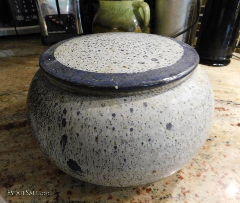Nice color pottery canister. Possible marking is Lance-'83. Was used as a flower pot. Nice condition. Shipping Available.