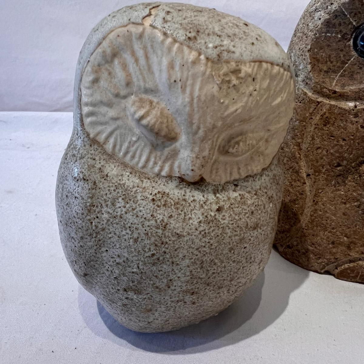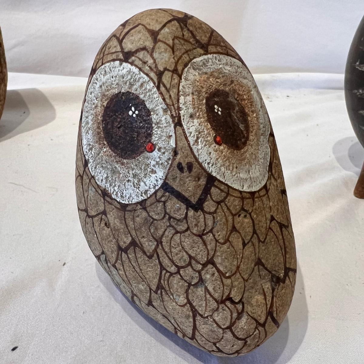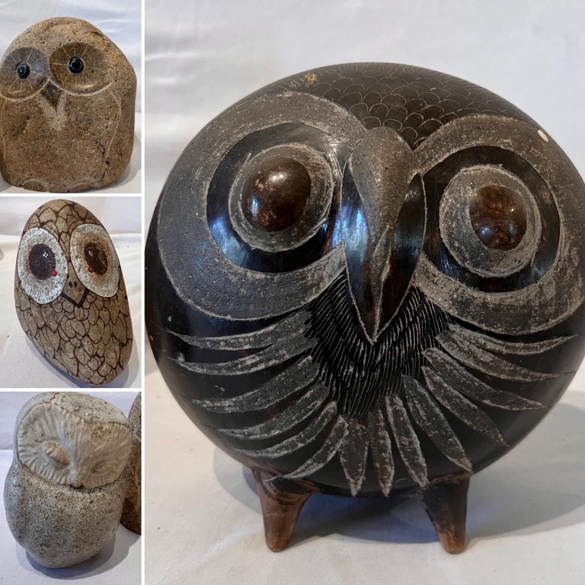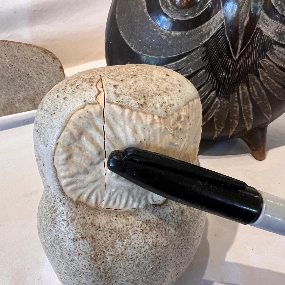 Of these four small statutes, two are stone; the dark brown and oatmeal colored owls are pottery. The oatmeal colored owl has a crack across its face and the other pottery piece has a paint splotch. Smallest item is the hand painted stone which is also the only one with a signature found; measures 3” x 2” x 4”H.