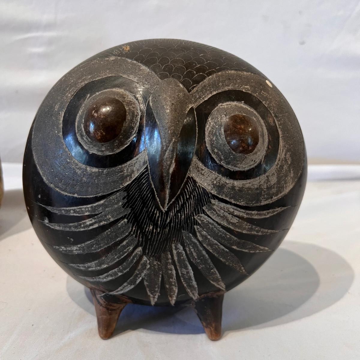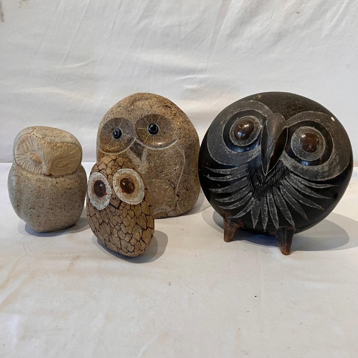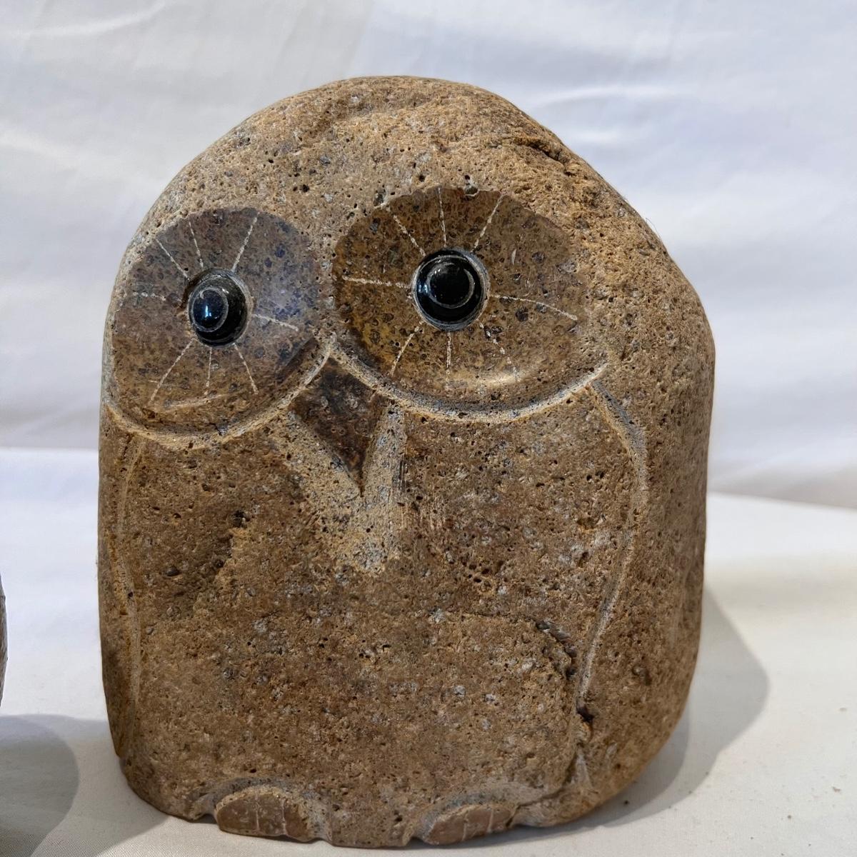 Of these four small statutes, two are stone; the dark brown and oatmeal colored owls are pottery. The oatmeal colored owl has a crack across its face and the other pottery piece has a paint splotch. Smallest item is the hand painted stone which is also the only one with a signature found; measures 3” x 2” x 4”H.