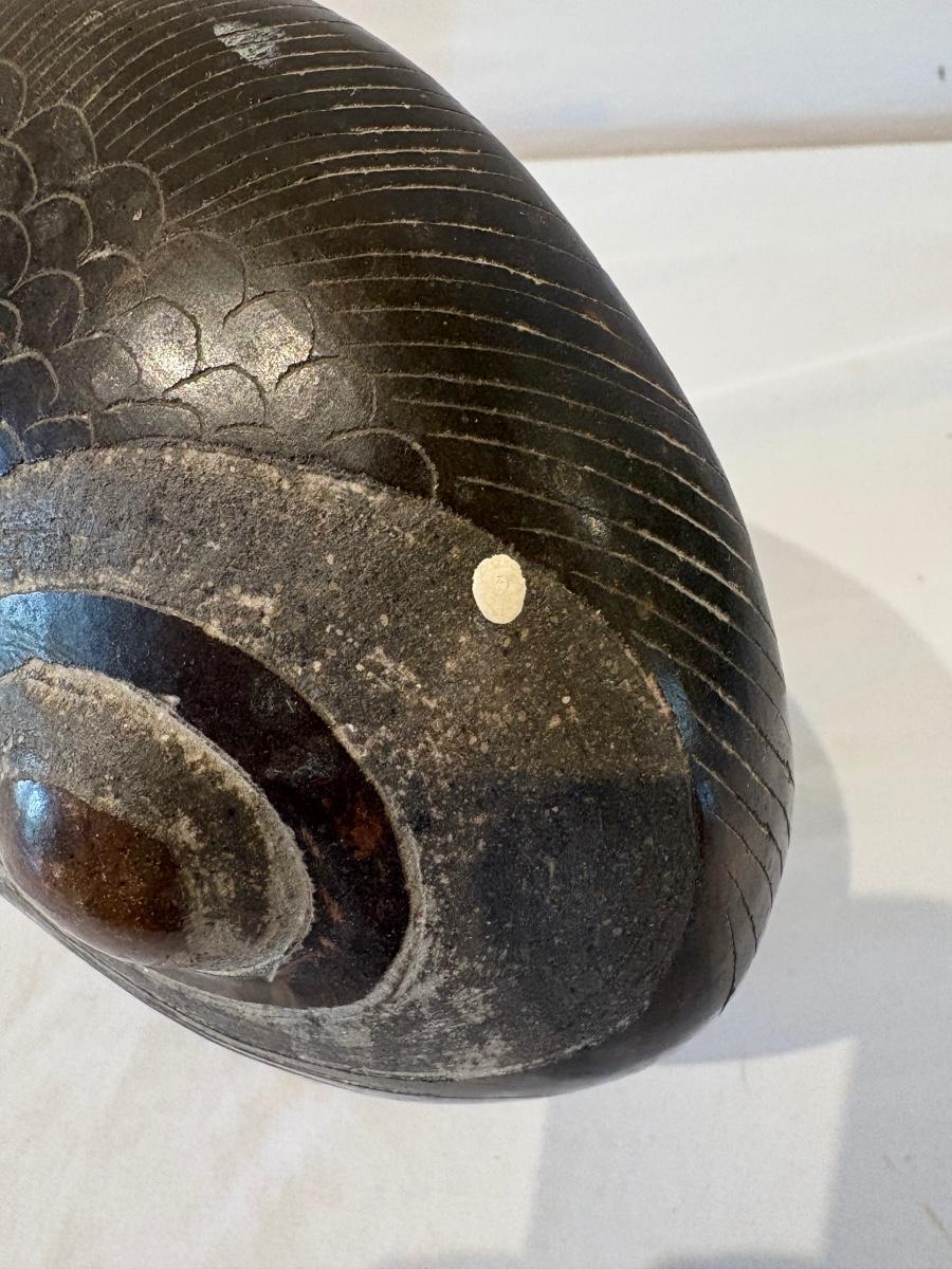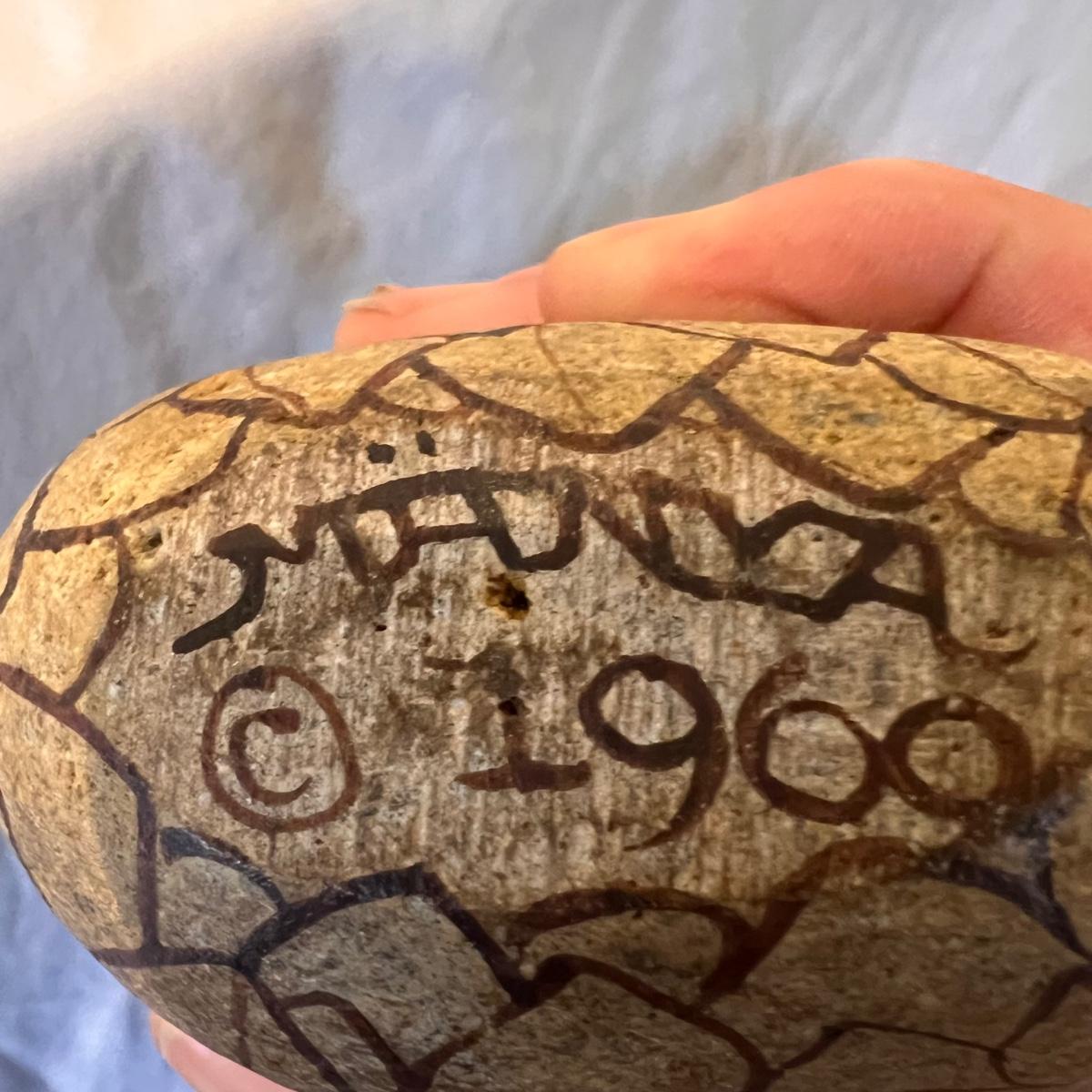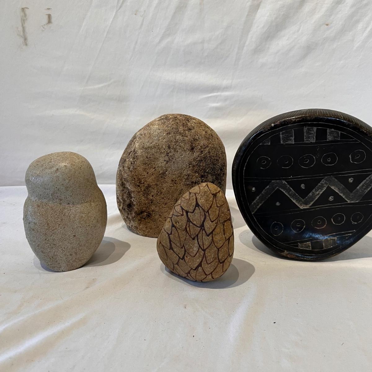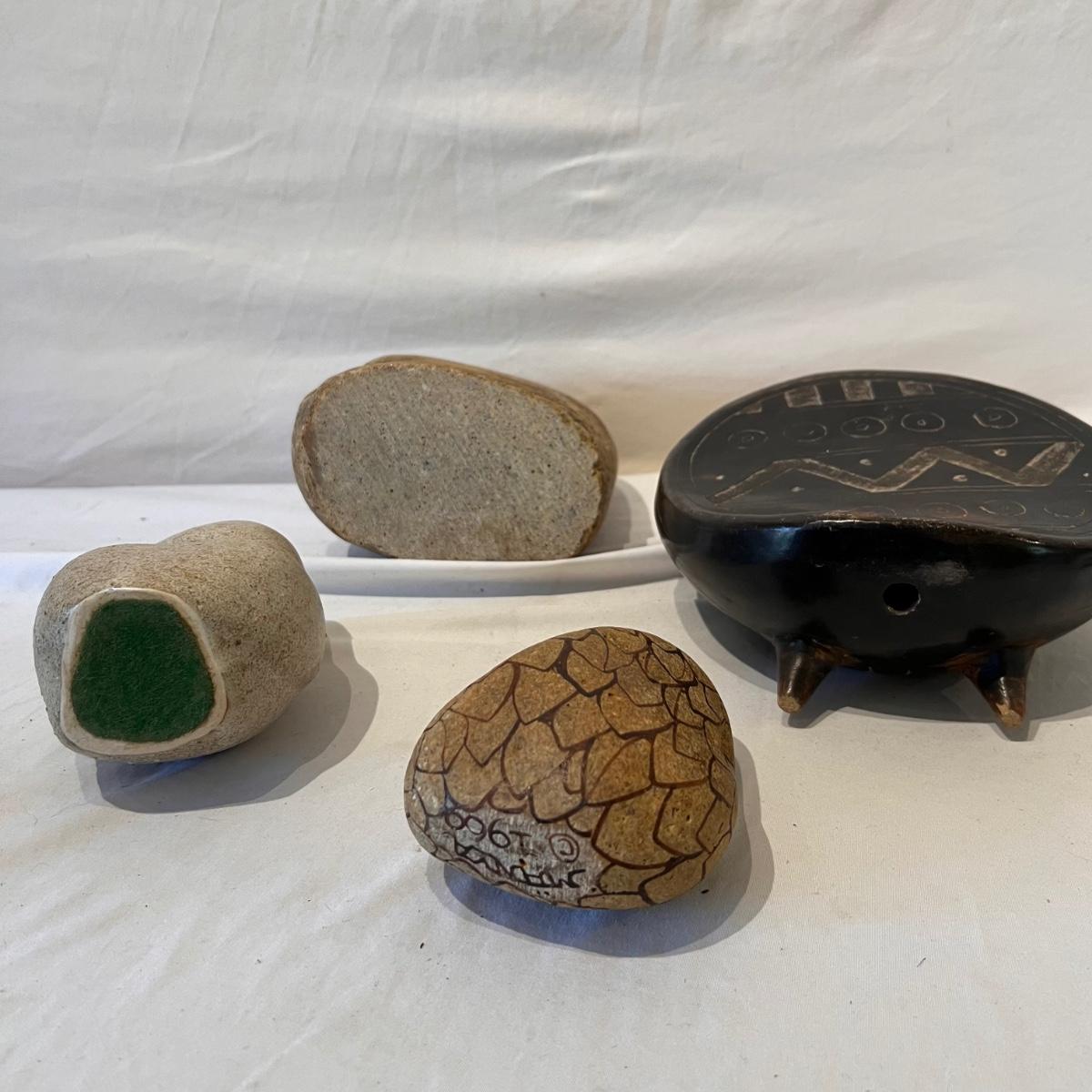 Of these four small statutes, two are stone; the dark brown and oatmeal colored owls are pottery. The oatmeal colored owl has a crack across its face and the other pottery piece has a paint splotch. Smallest item is the hand painted stone which is also the only one with a signature found; measures 3” x 2” x 4”H.
