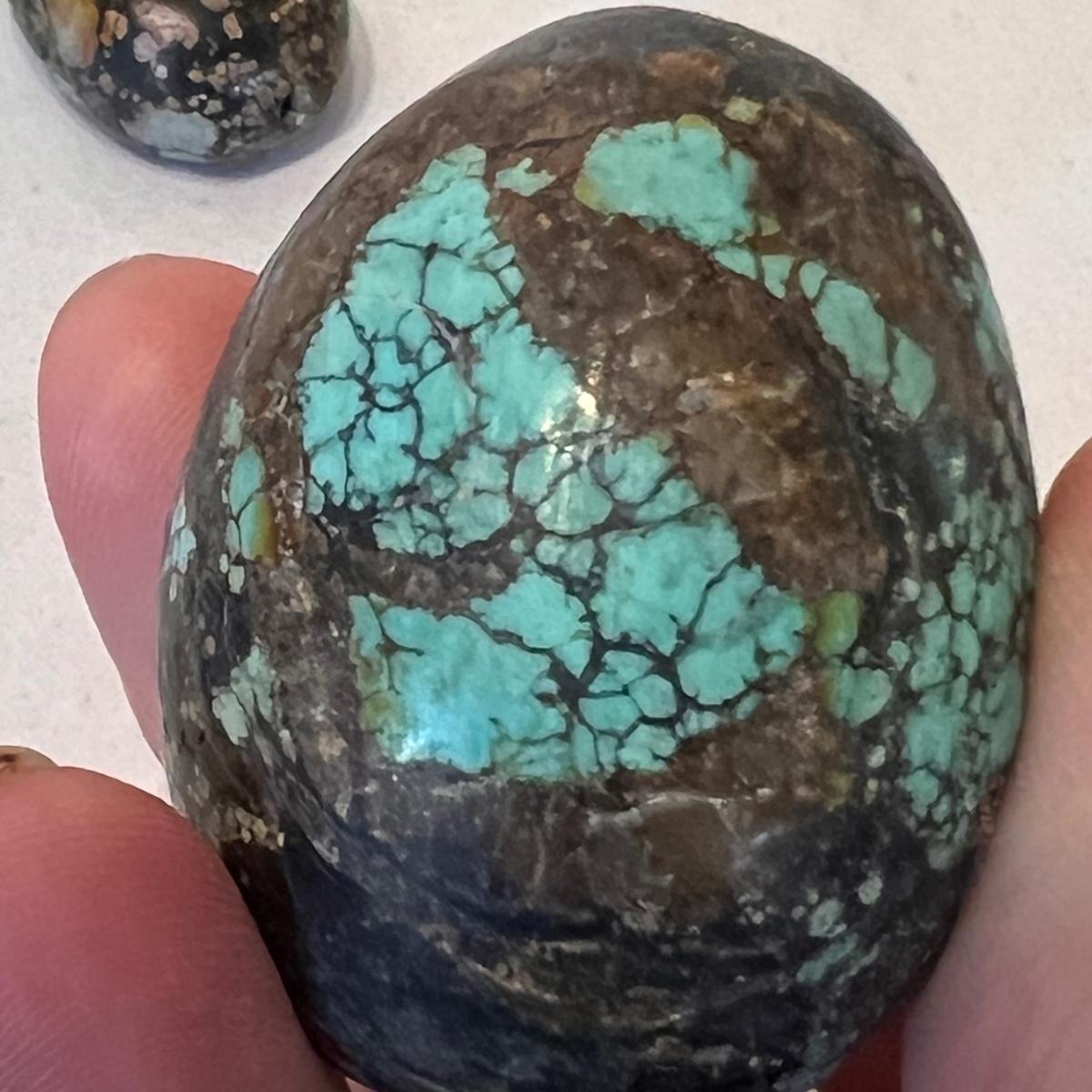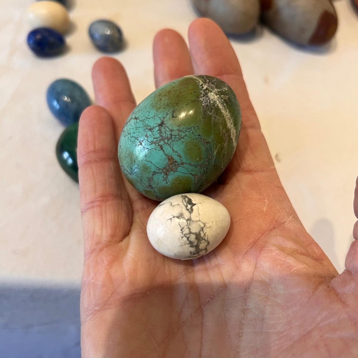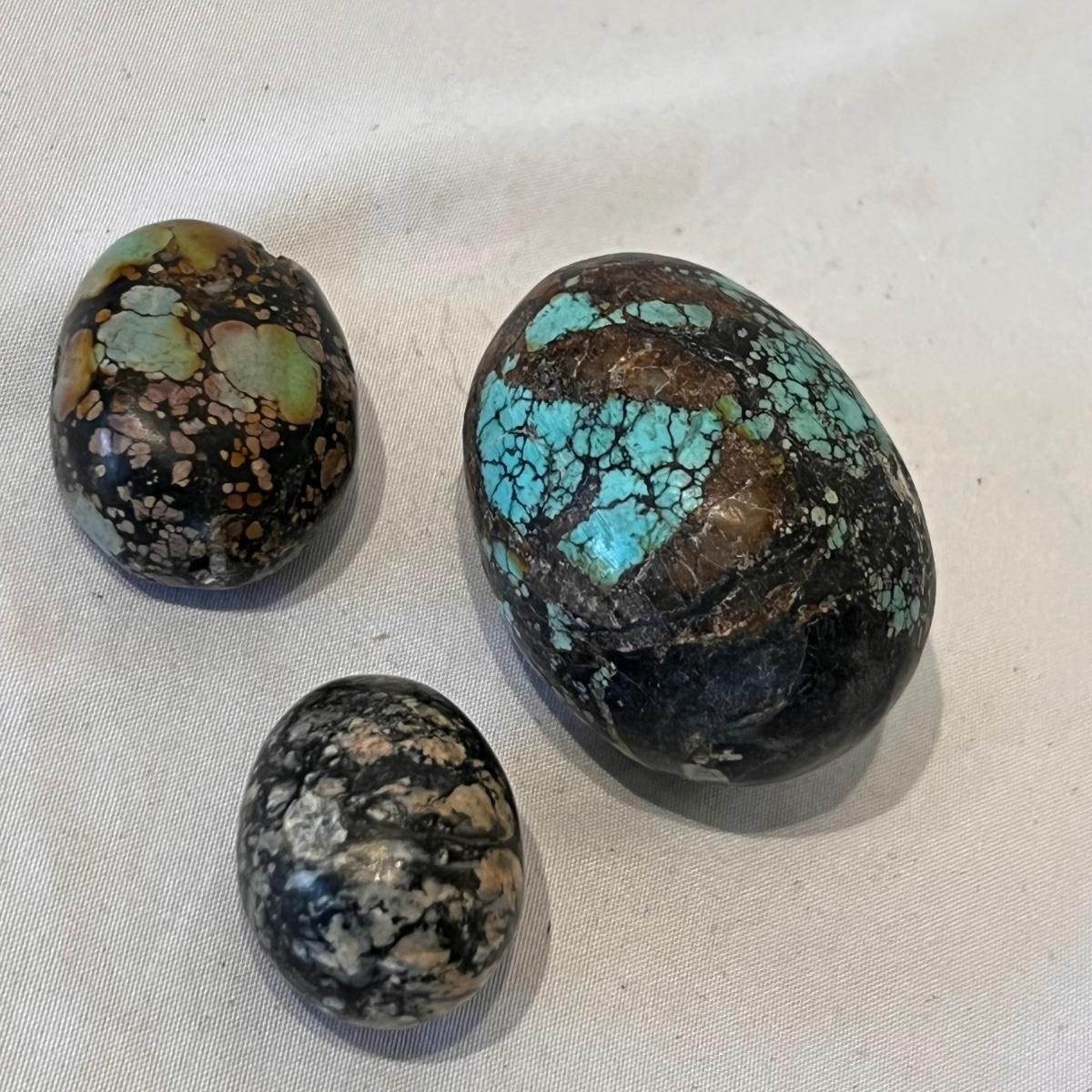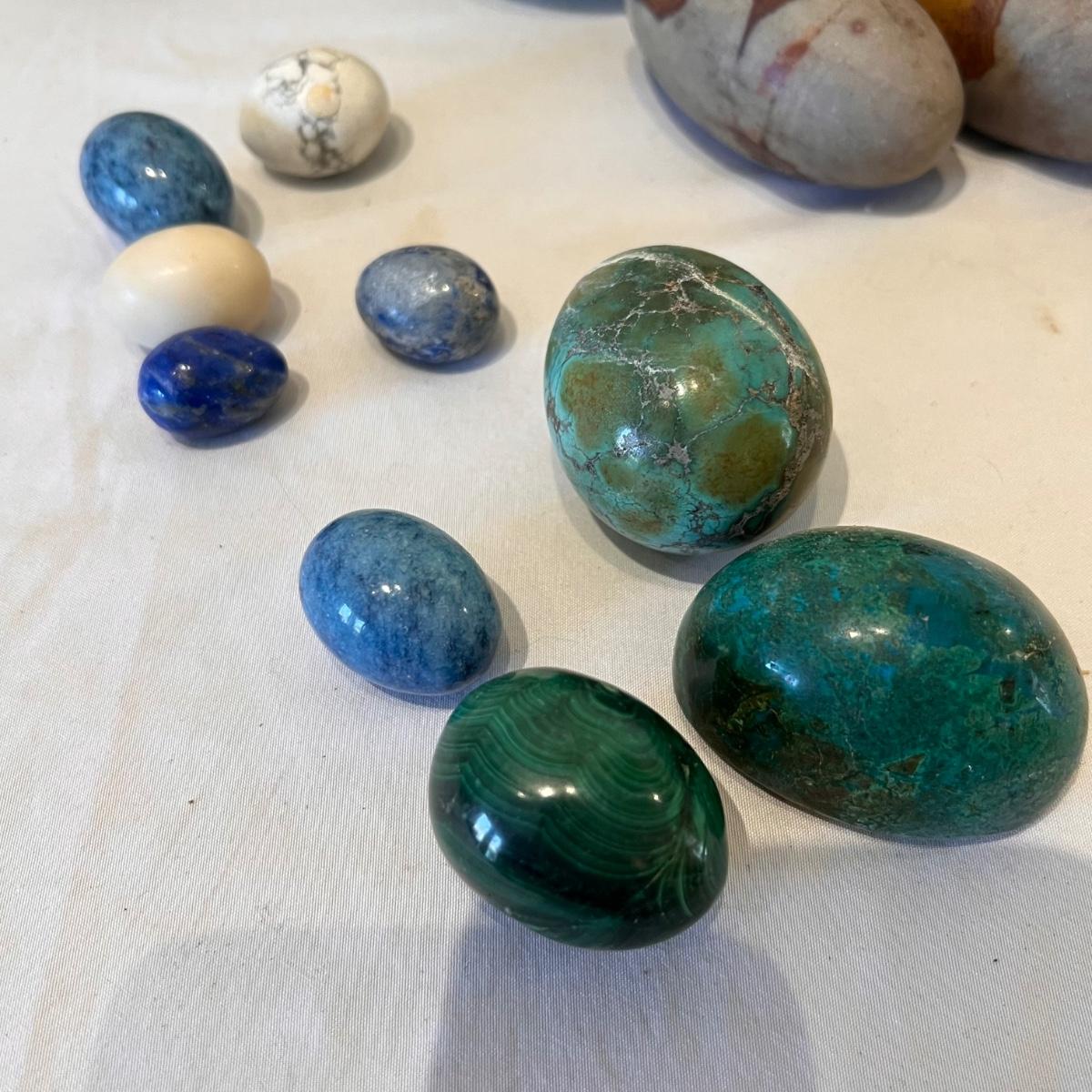 Approximately 20 stone pieces range in size from 4”d x 3”H to 0.5” x 1”H. A couple appear to contain turquoise.