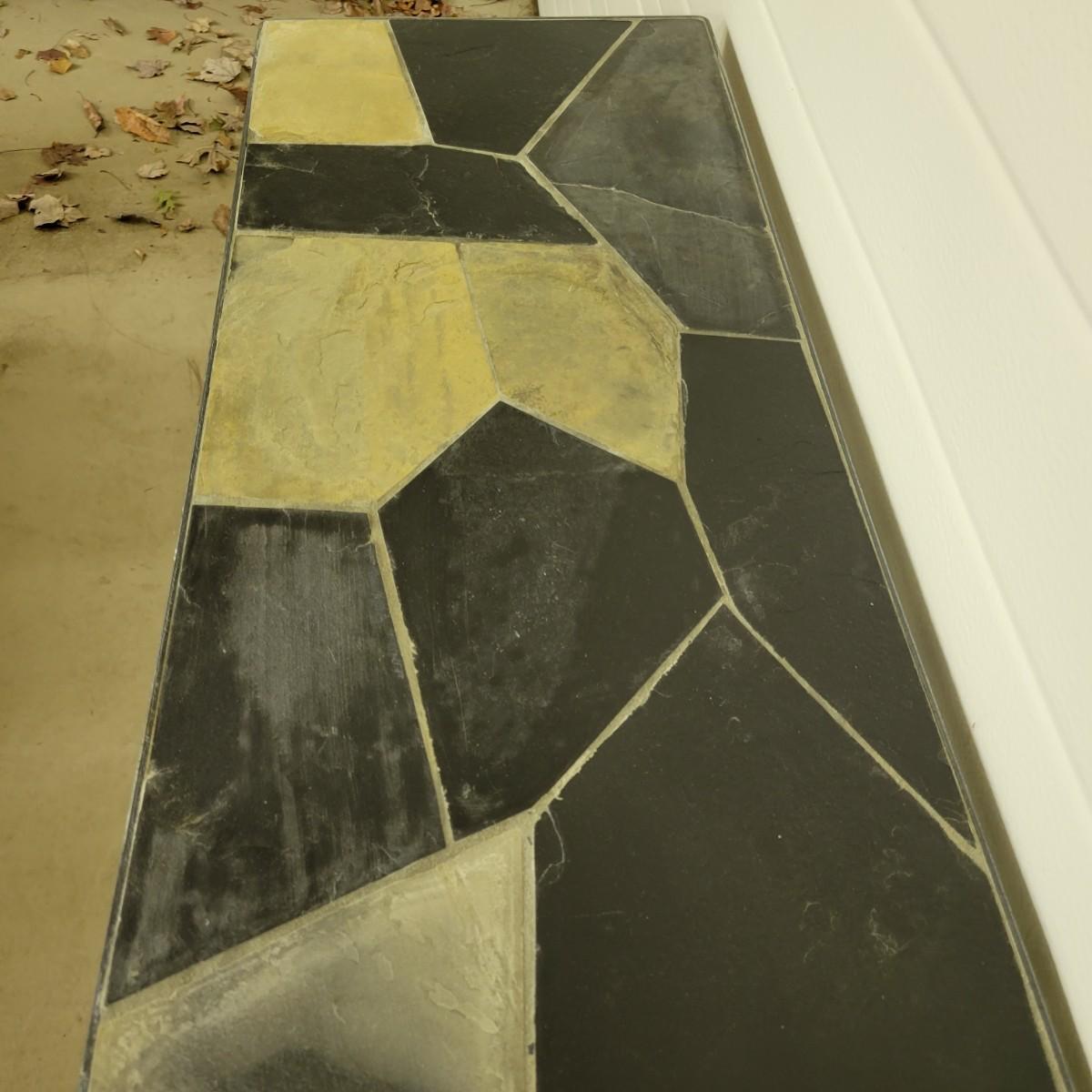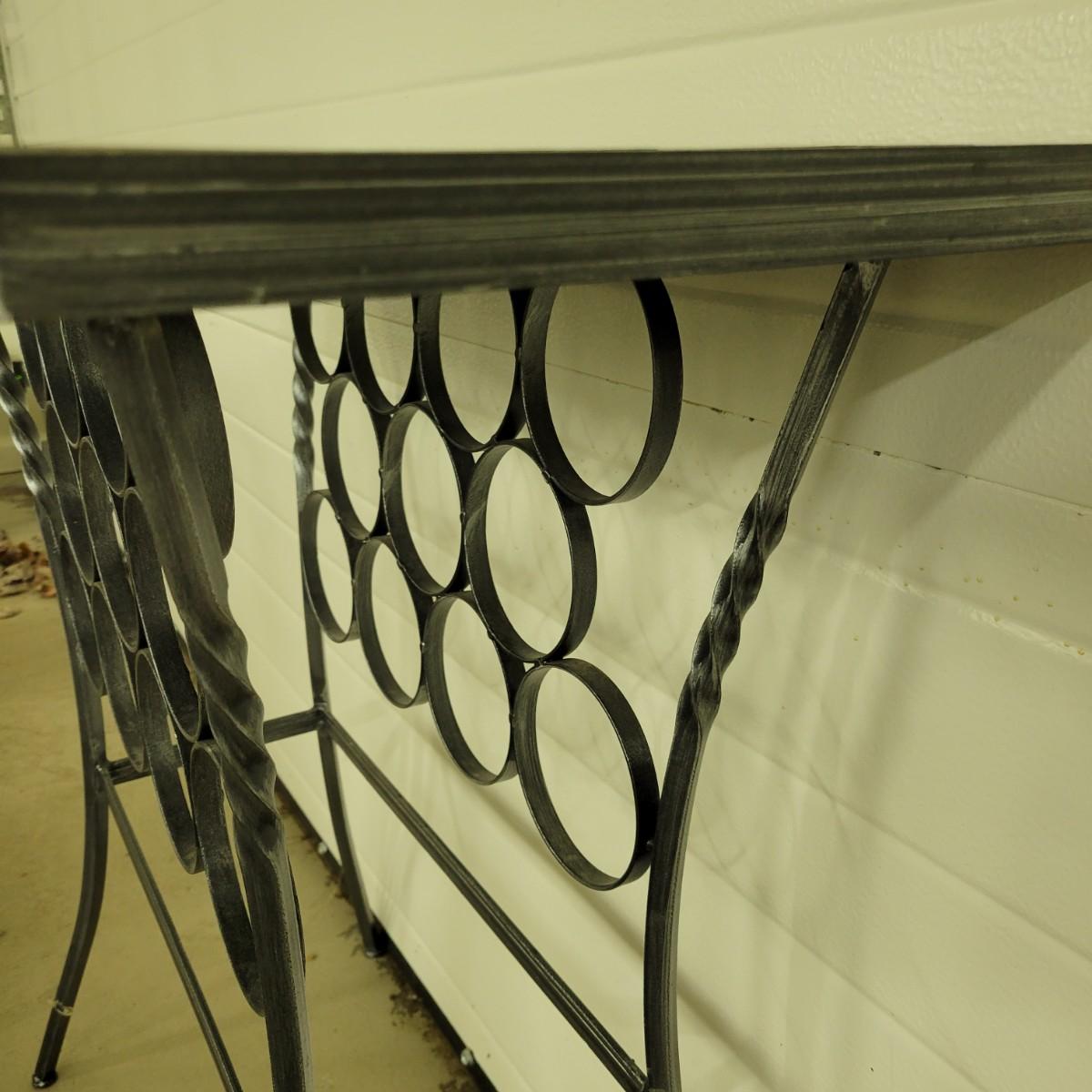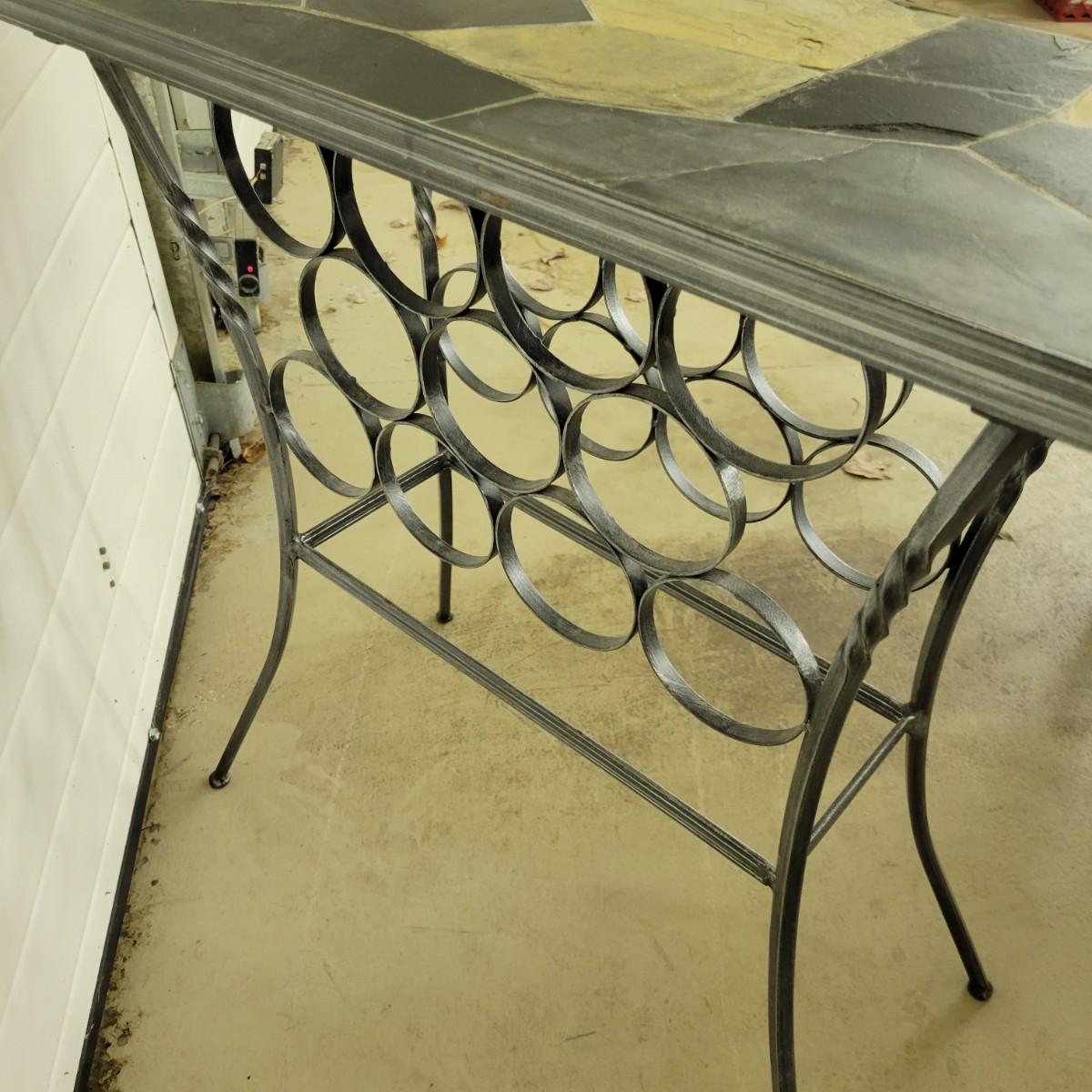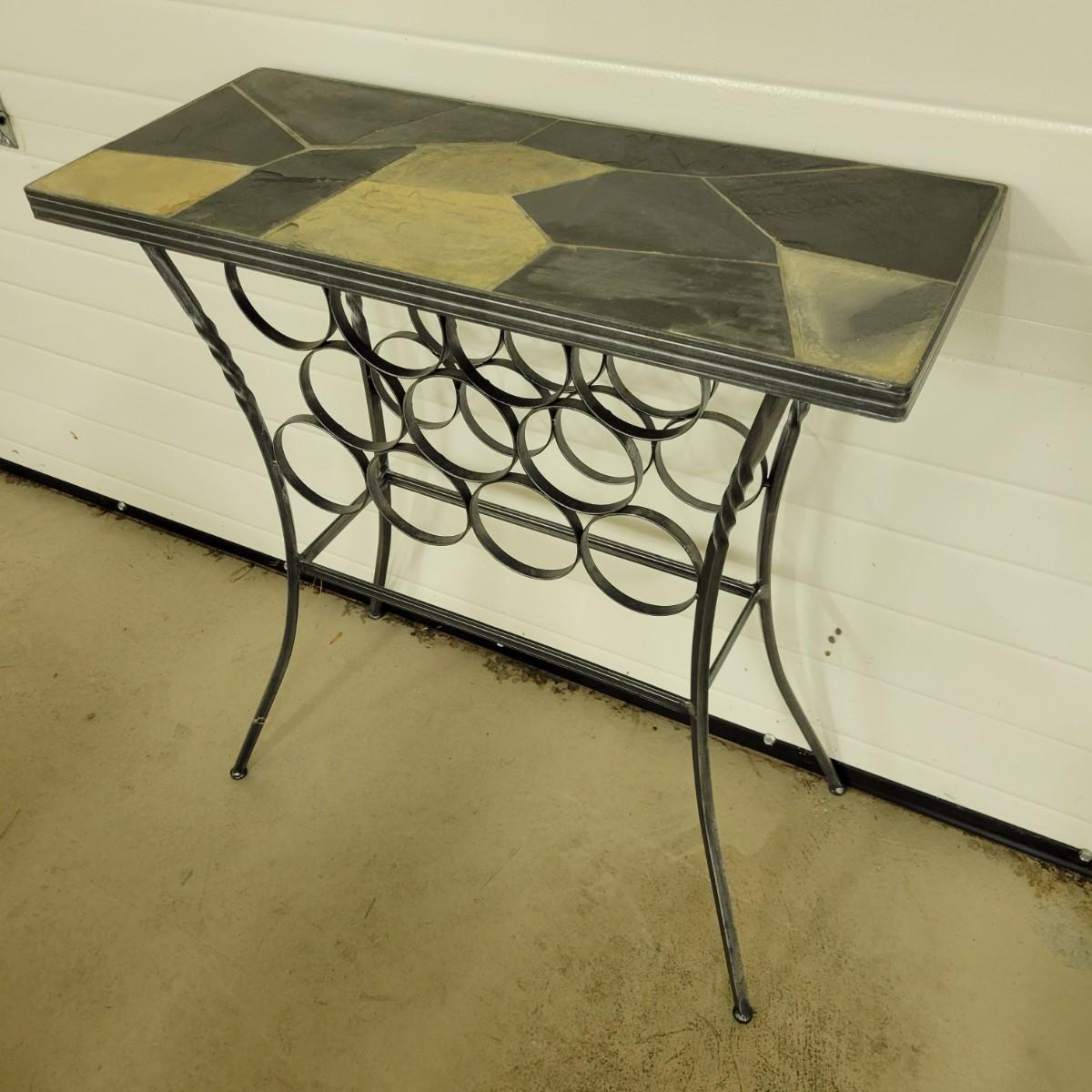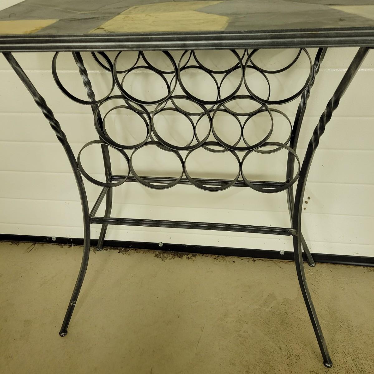 A stone topped wine rack with a wrought iron base. It can hold up to 11 bottles of wine and measures approximately 28" x 12" x 29.5"H. Local pick-up only.