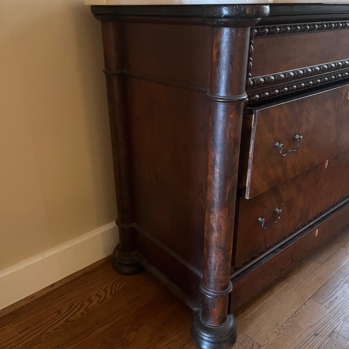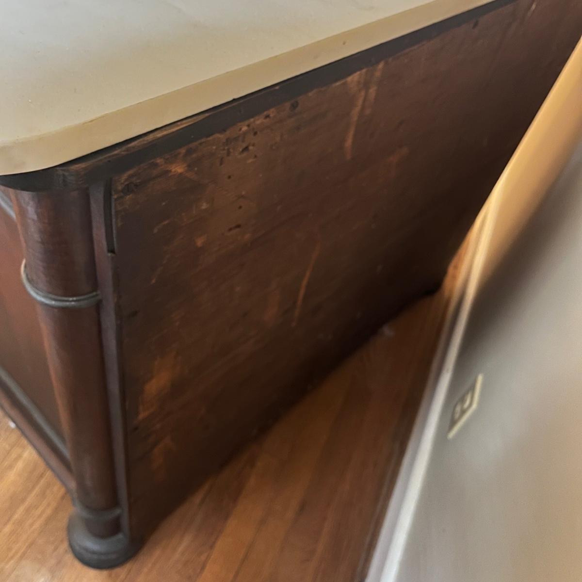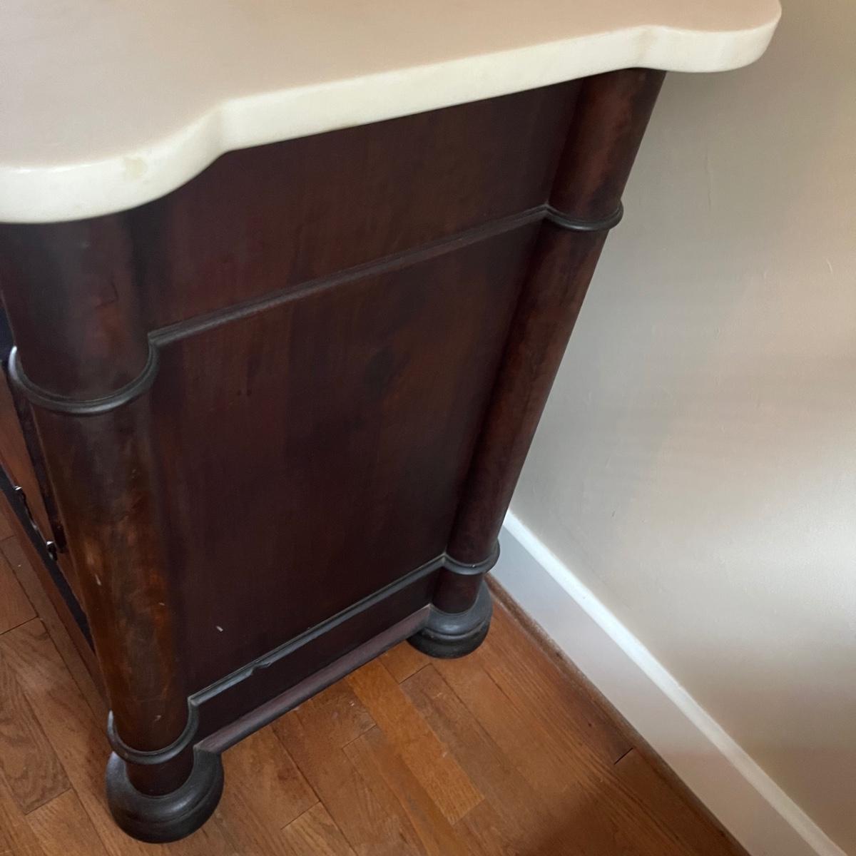 Lot includes a antique marble top chest of drawers with four dovetailed drawer. Chest is a walnut colored wood with the marble top being removable. Chest measures 23” x 46.5” x 36”. The winning bidder will need to bring assistance to move and load item due to it's size and/or weight.