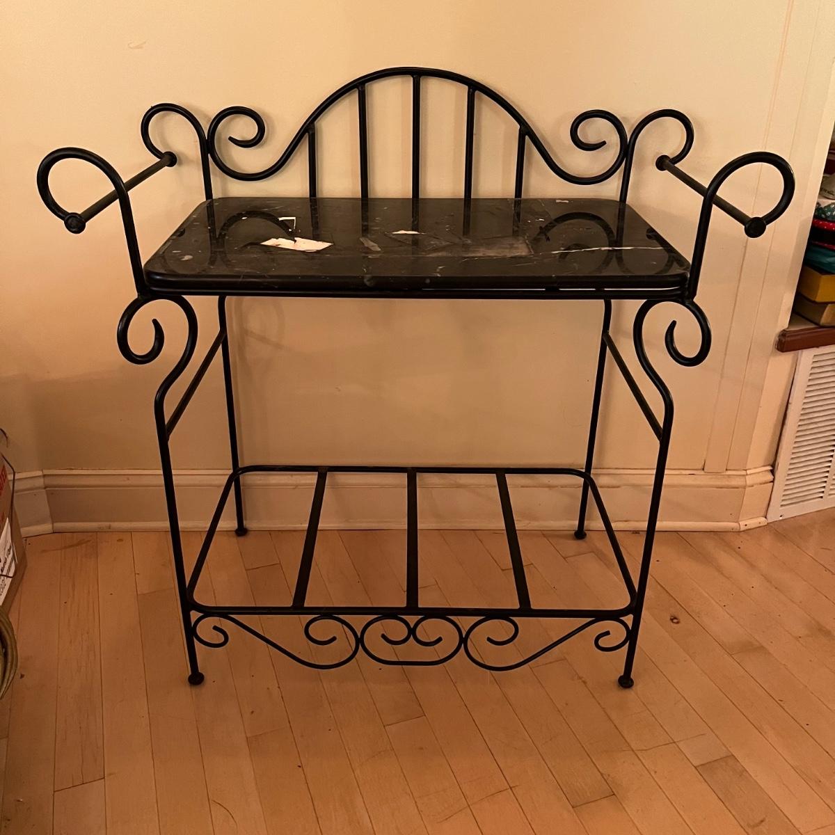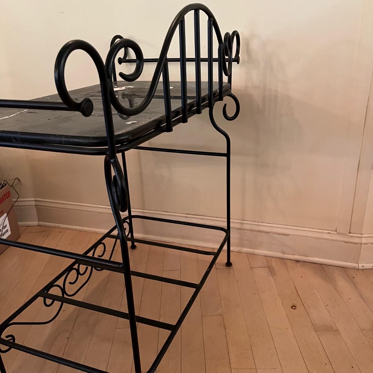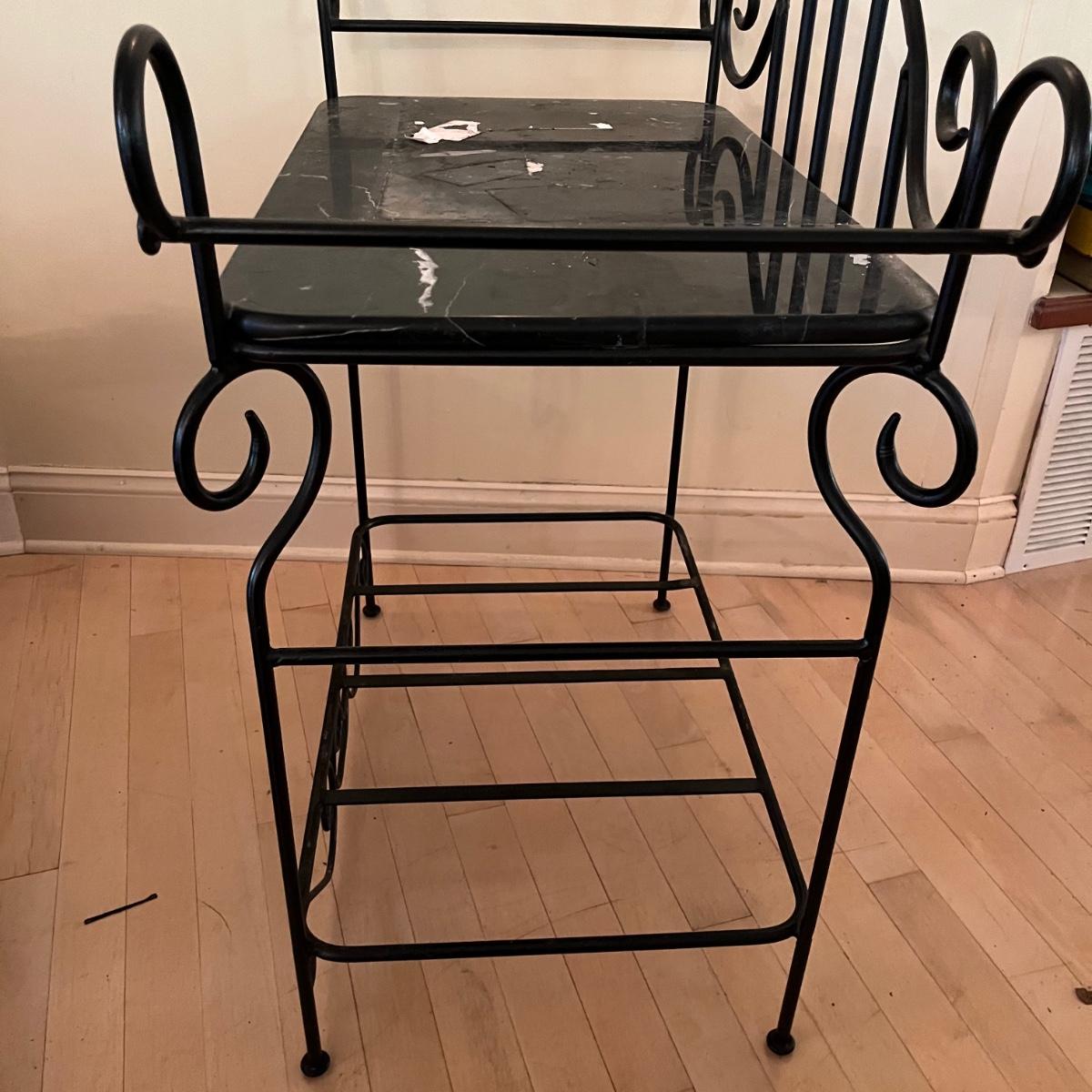 Lot includes a black iron bar table with a stone top. Table measures 15.5” x 35” x 35”. Bring help item is substantial. Stone has scratches and some paper stuck to it but appears it will clean up nicely.