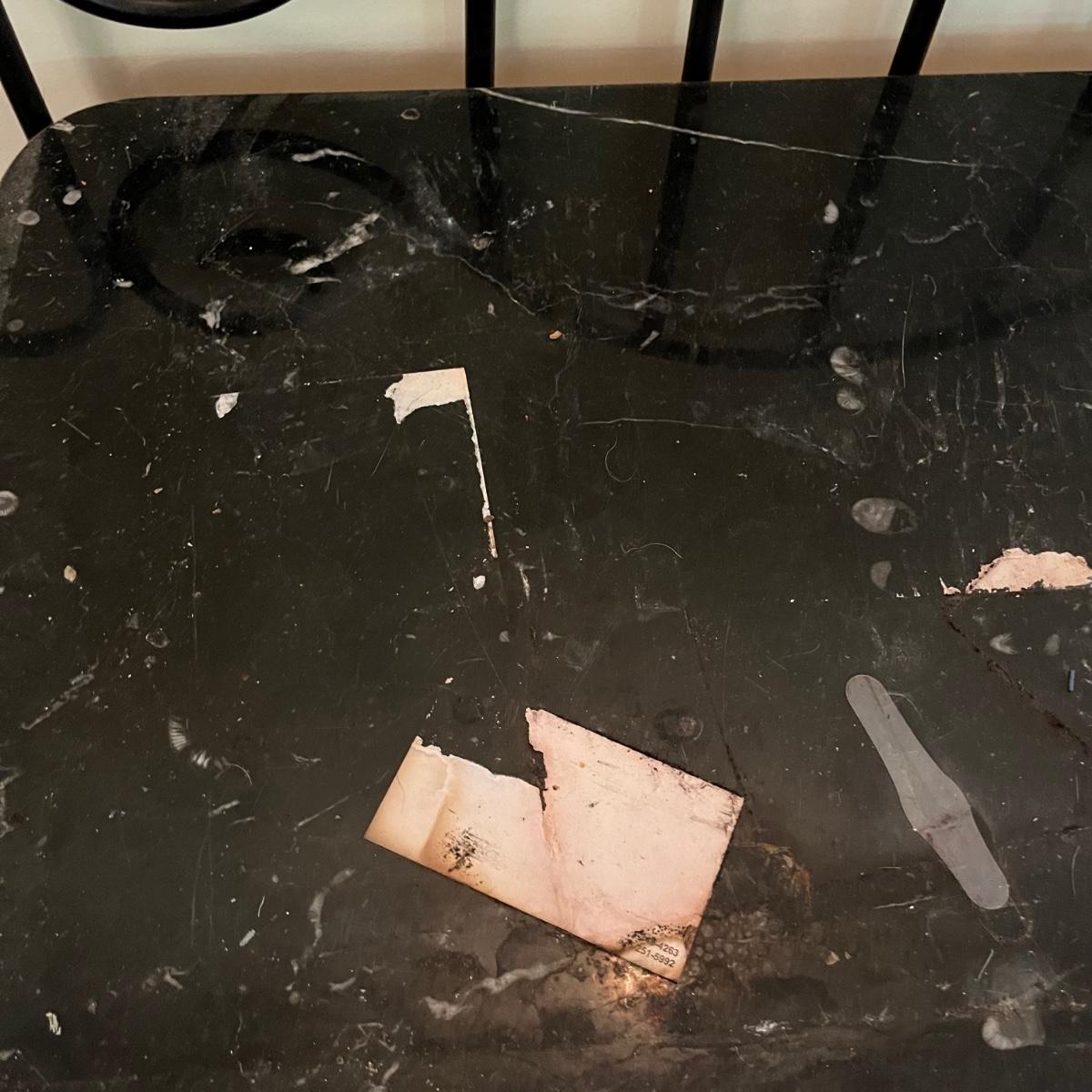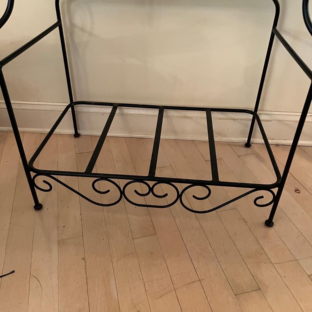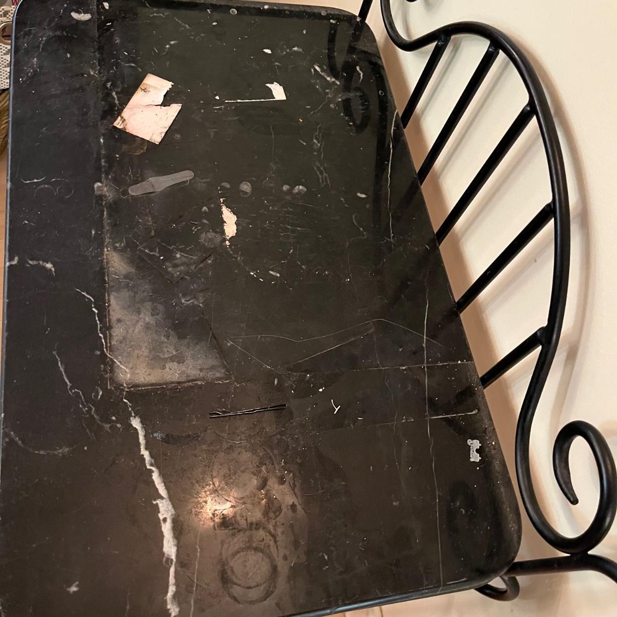Lot includes a black iron bar table with a stone top. Table measures 15.5” x 35” x 35”. Bring help item is substantial. Stone has scratches and some paper stuck to it but appears it will clean up nicely.