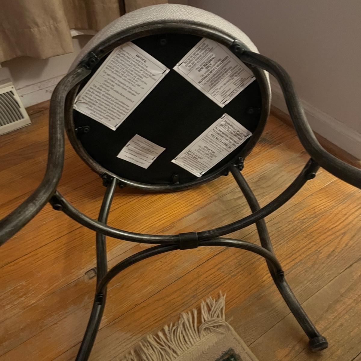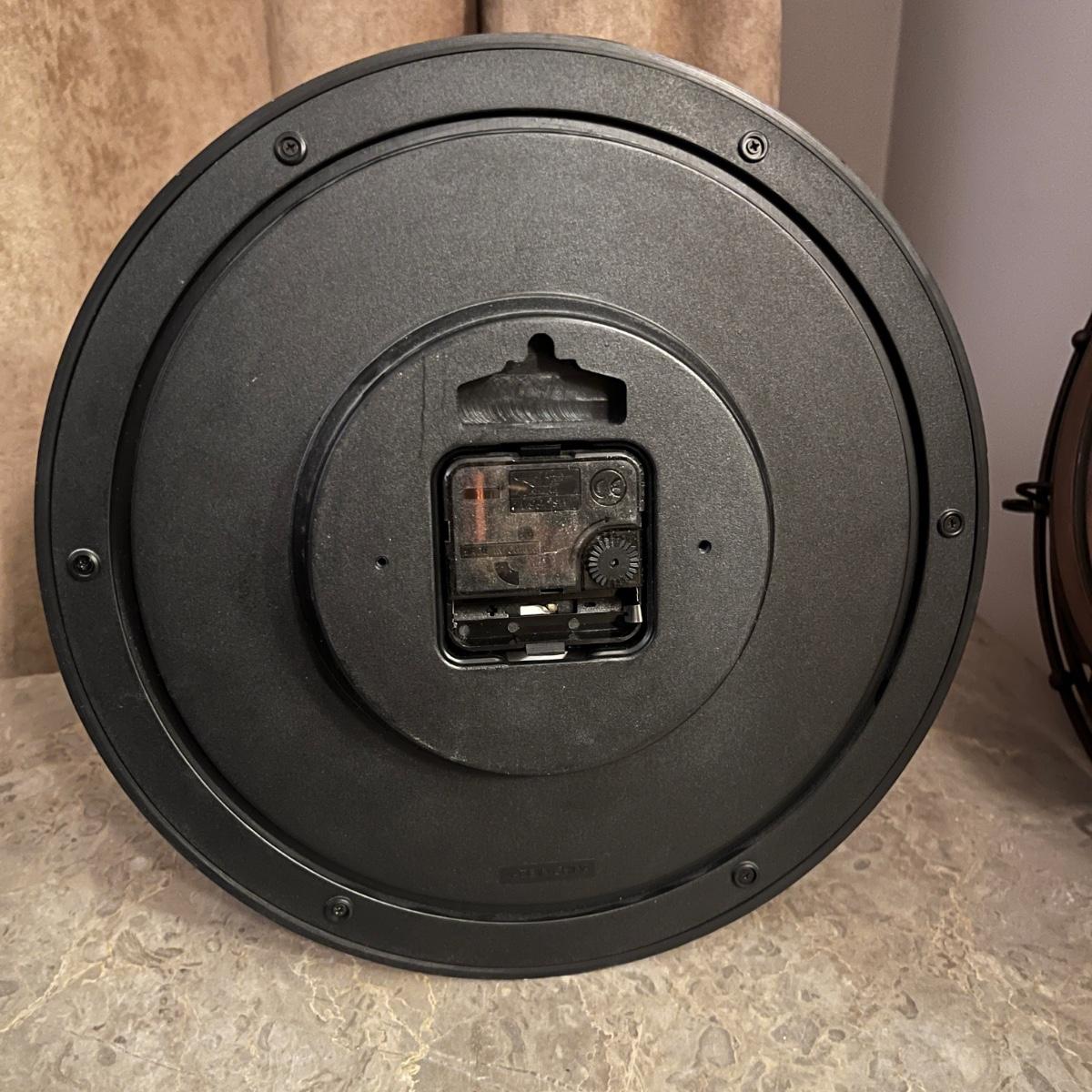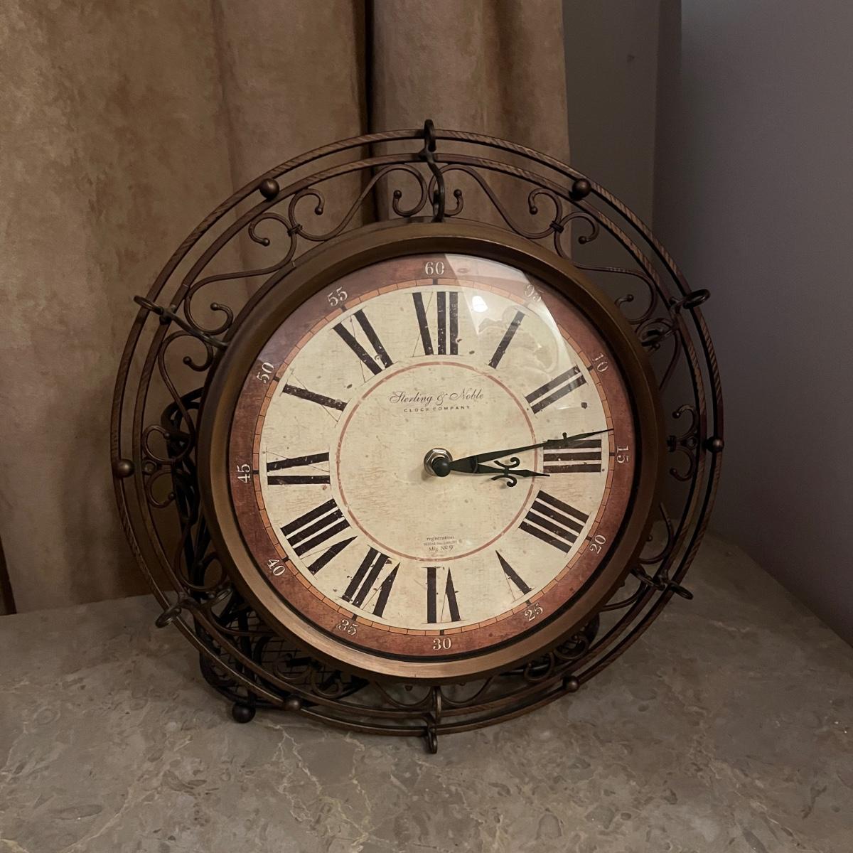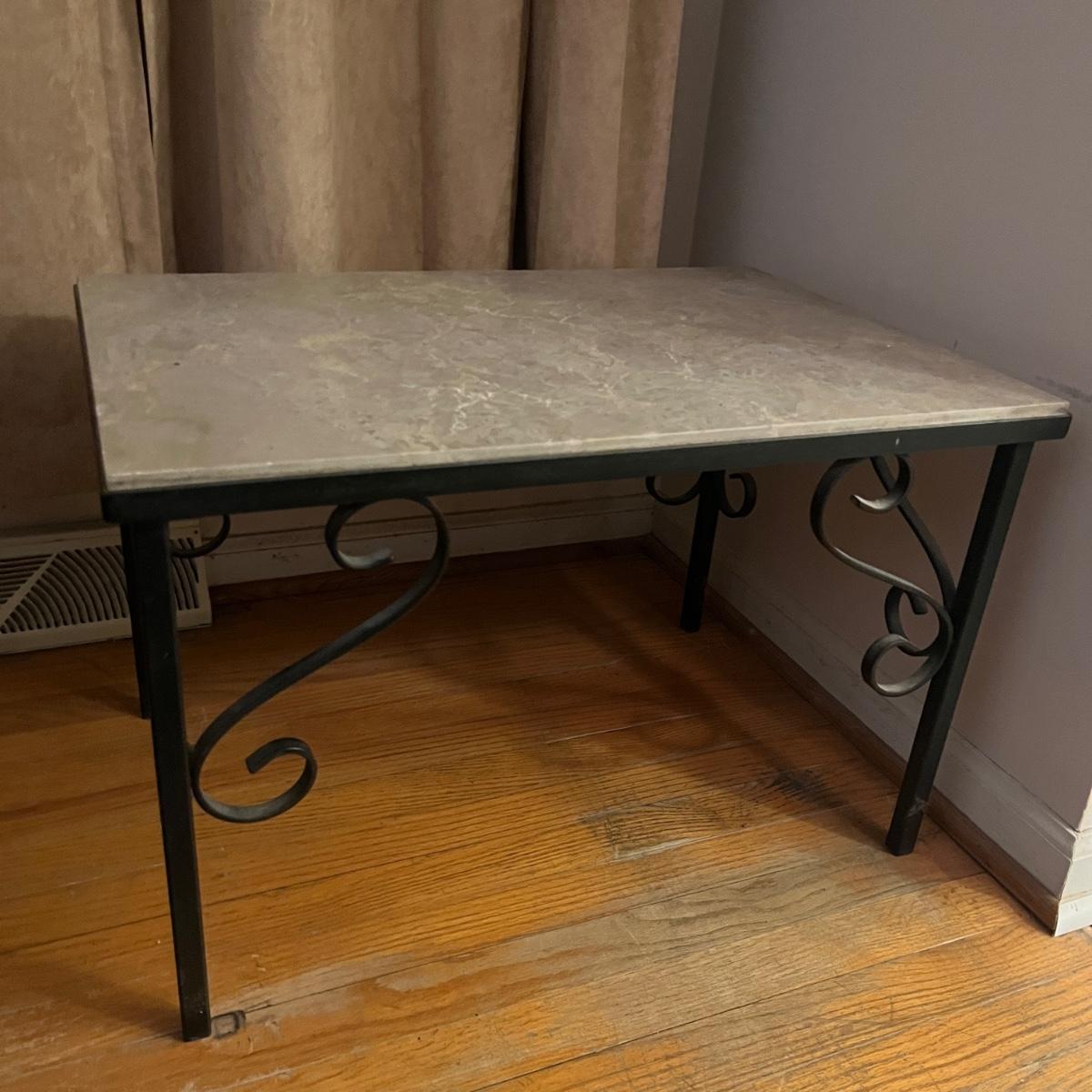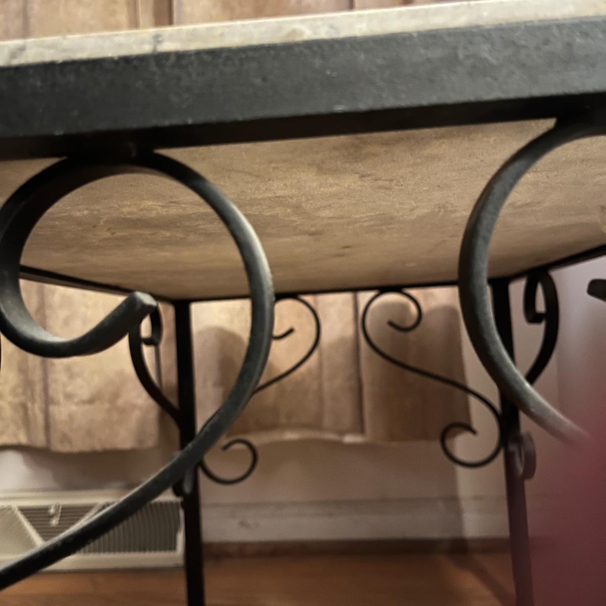 Lot includes a metal chair with padded seat, stone top table with iron base, one plastic clock, one metal and plastic clock, two metal containers and six metal decor pieces with magnets on one side. Table measures 17” x 26” x 17”H. Clocks are not currently running.