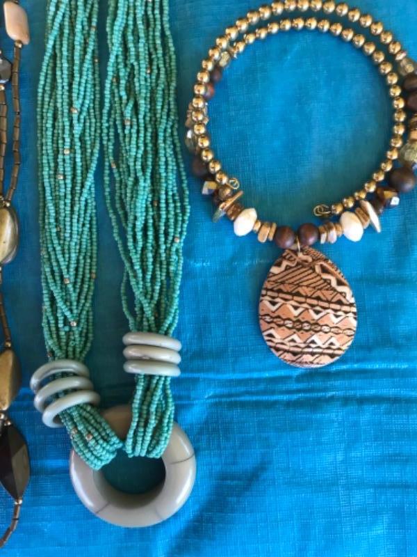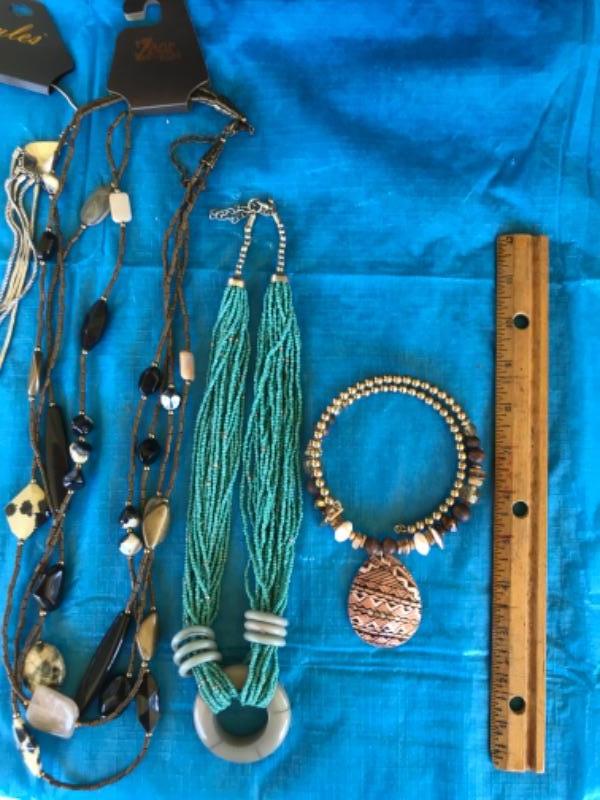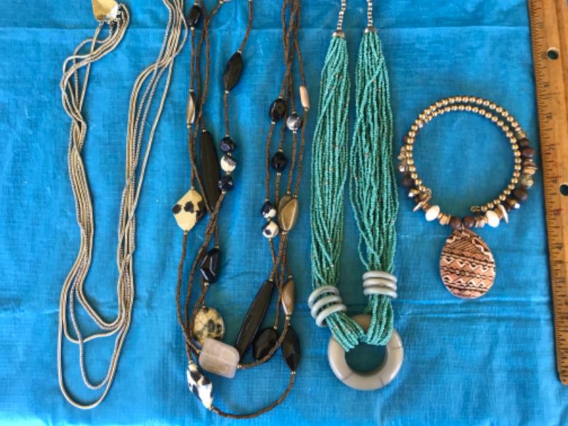4 wonderful necklaces. 2 still have the original hang cards. All but the coil necklace can be adjusted.