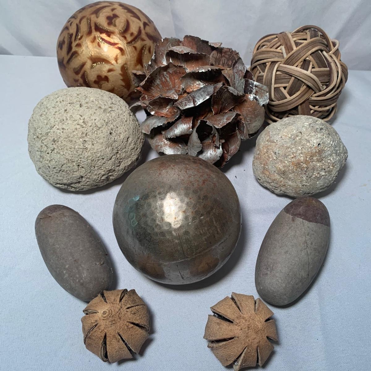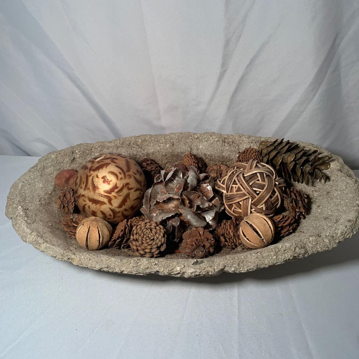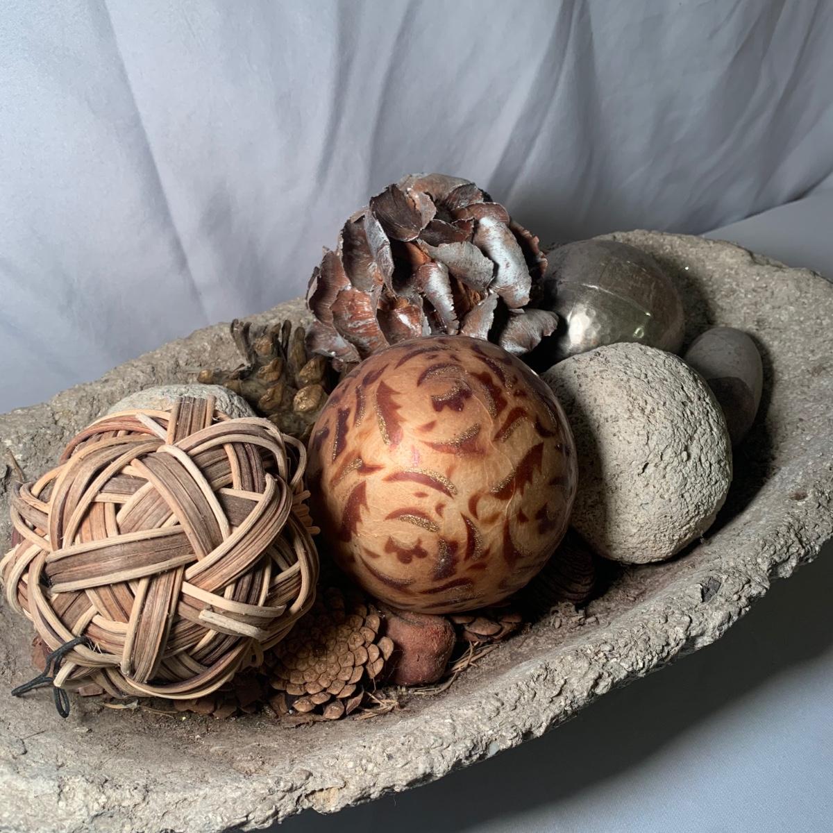 This lot includes a stone like bowl with multiple decorative balls. From pine cones to a hammered metal ball, this bowl can achieve many look! See photos for details
