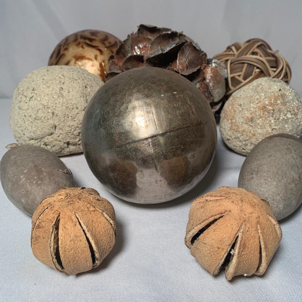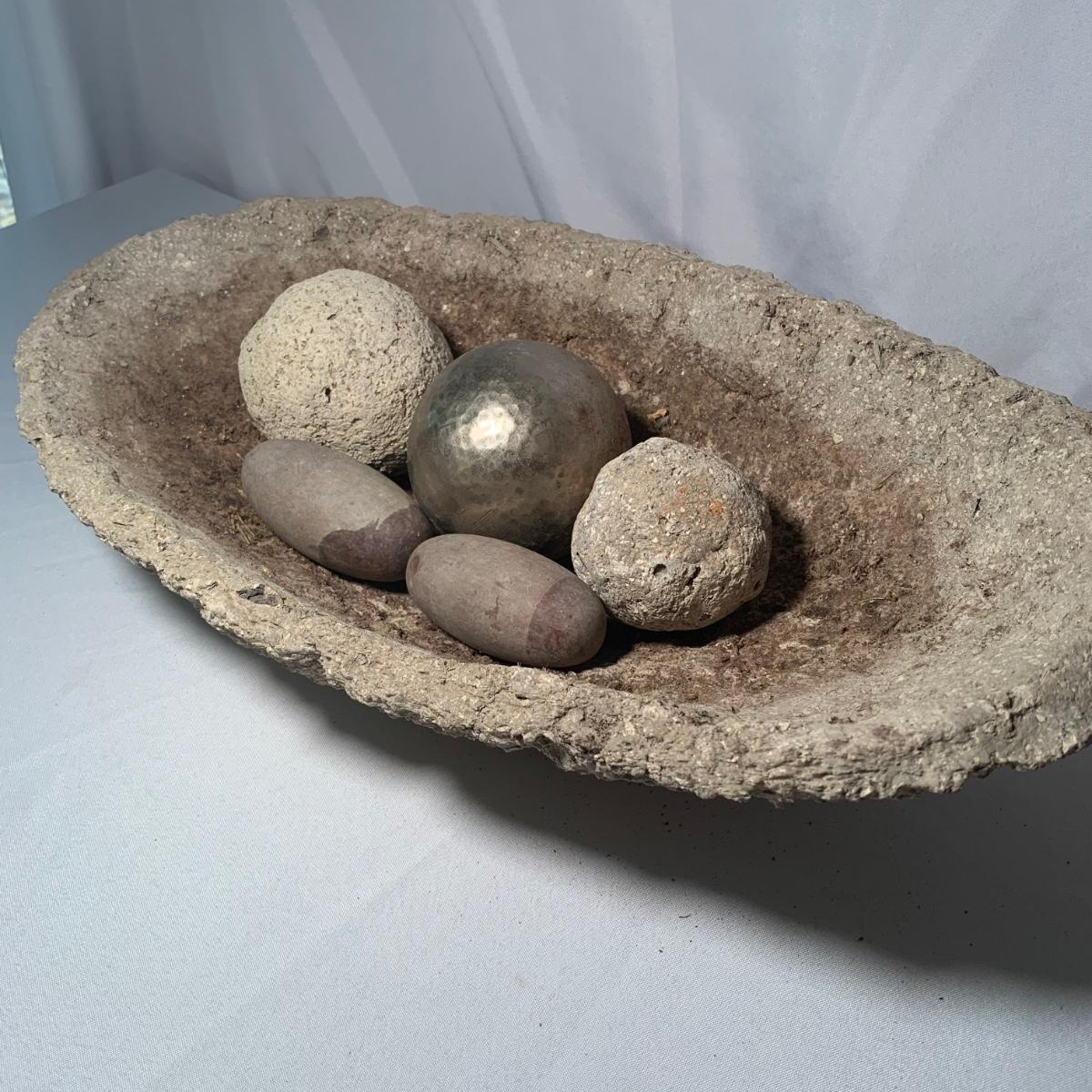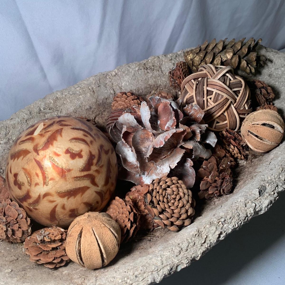 This lot includes a stone like bowl with multiple decorative balls. From pine cones to a hammered metal ball, this bowl can achieve many look! See photos for details