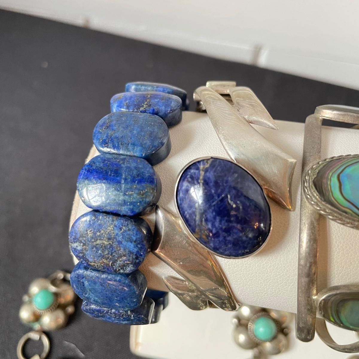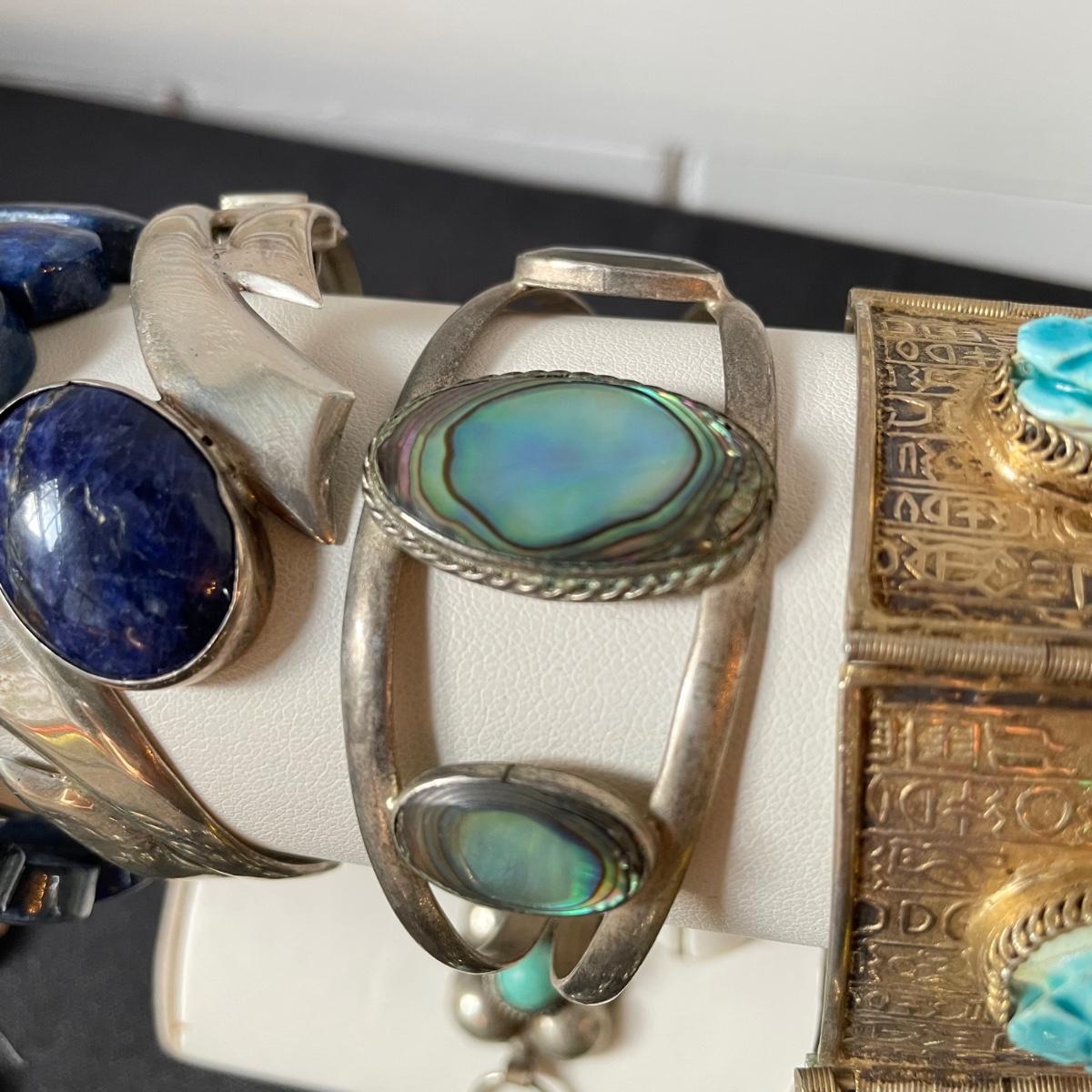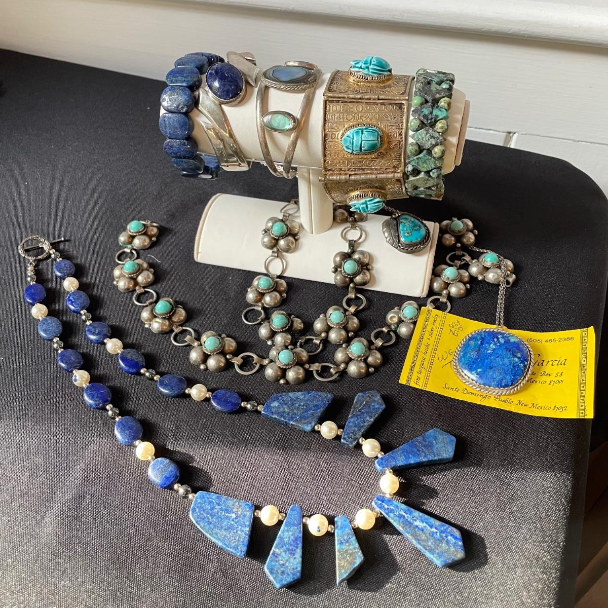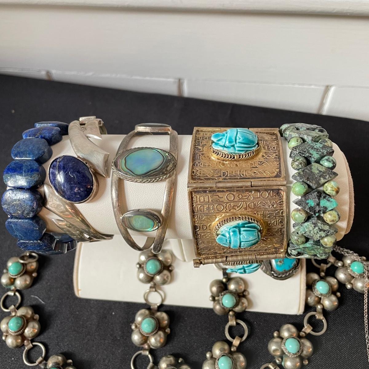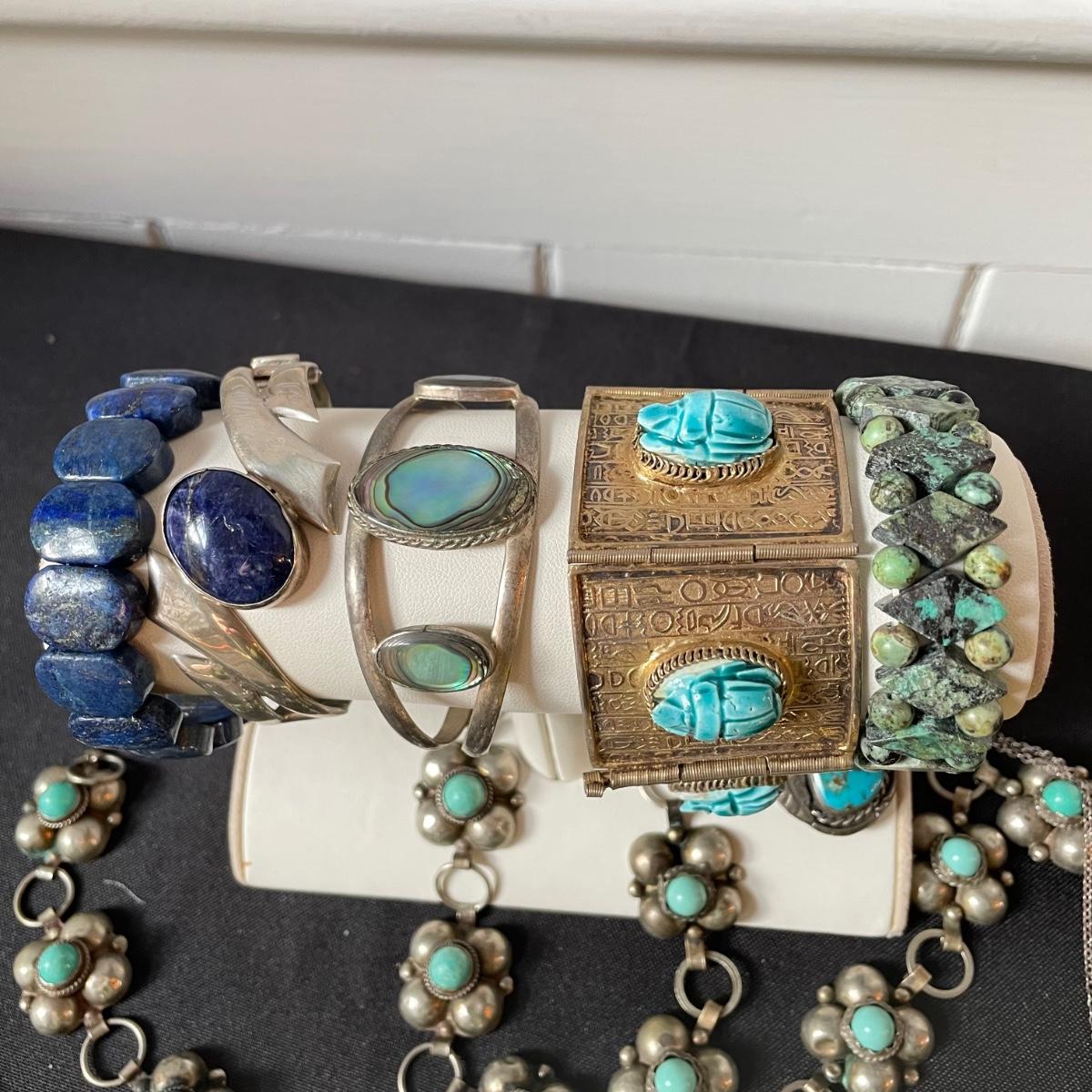 Beautiful collection of blue lapis and turquoise colored jewelry with silver colored settings. The two solely stone bracelets have elastic roping keeping them together. The turquoise colored pendant with a feather and the blue lapis colored pendant with a chain both can be used as brooches as well. A vintage shell cuff has a small chip in the shell, noted in the photos. Lot features a set of light turquoise colored stones, each one has a clip, it is unclear if they should be used together as the smaller one is too big to be worn as a bracelet, yet the larger one is choker sized. Lot also includes a 22” heavy stone necklace with a toggle clasp and pearly beads plus a unique carved scarab bracelet. See images. Shipping available. All sales are final. No returns or refunds. Please bid accordingly.