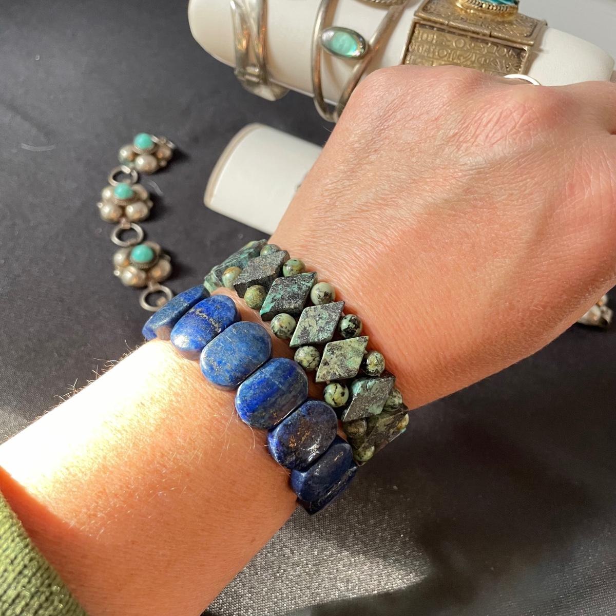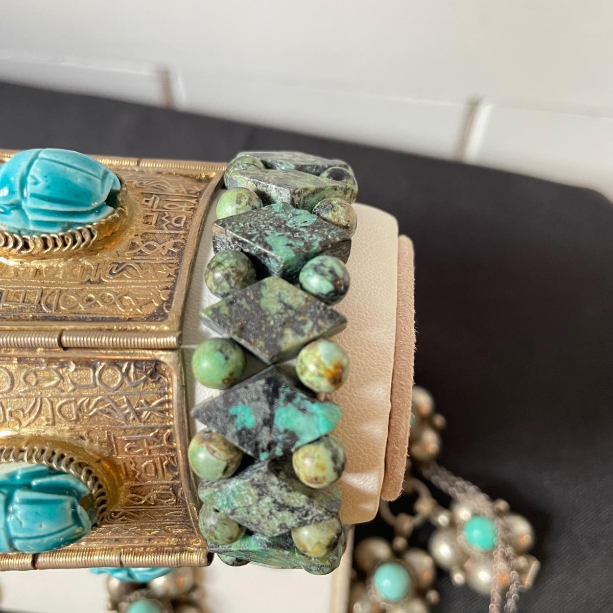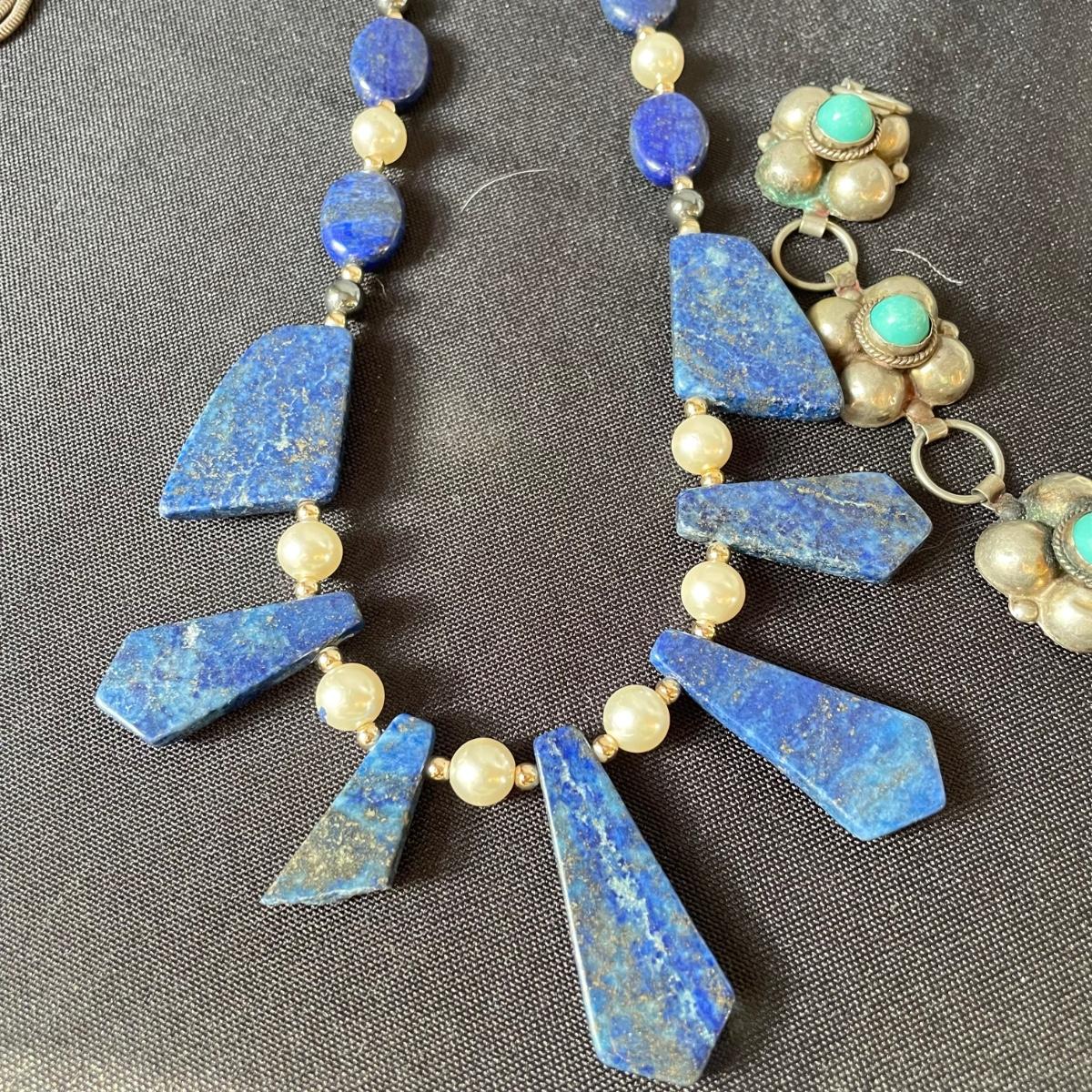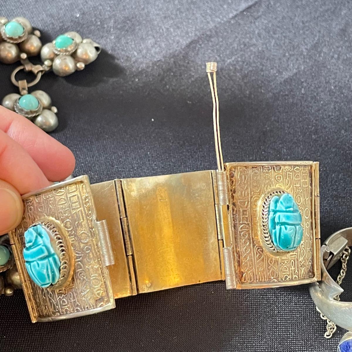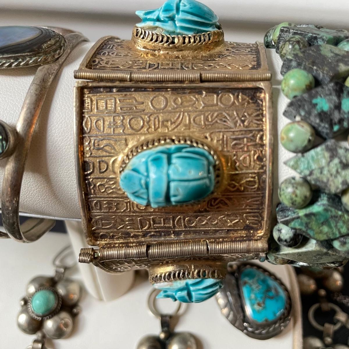 Beautiful collection of blue lapis and turquoise colored jewelry with silver colored settings. The two solely stone bracelets have elastic roping keeping them together. The turquoise colored pendant with a feather and the blue lapis colored pendant with a chain both can be used as brooches as well. A vintage shell cuff has a small chip in the shell, noted in the photos. Lot features a set of light turquoise colored stones, each one has a clip, it is unclear if they should be used together as the smaller one is too big to be worn as a bracelet, yet the larger one is choker sized. Lot also includes a 22” heavy stone necklace with a toggle clasp and pearly beads plus a unique carved scarab bracelet. See images. Shipping available. All sales are final. No returns or refunds. Please bid accordingly.