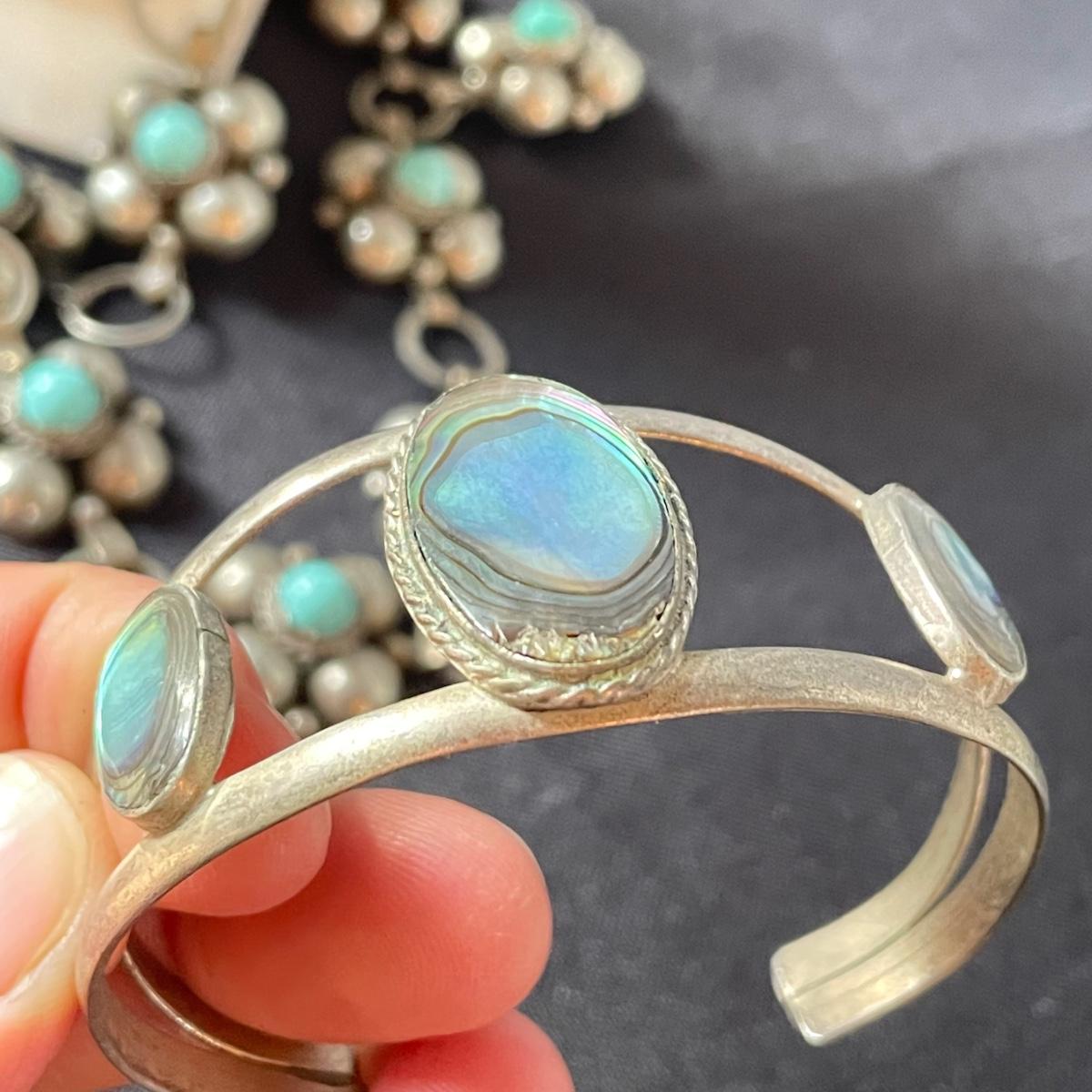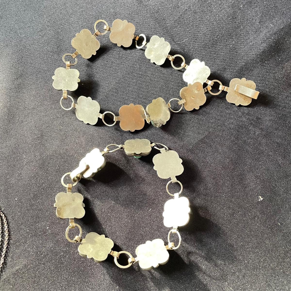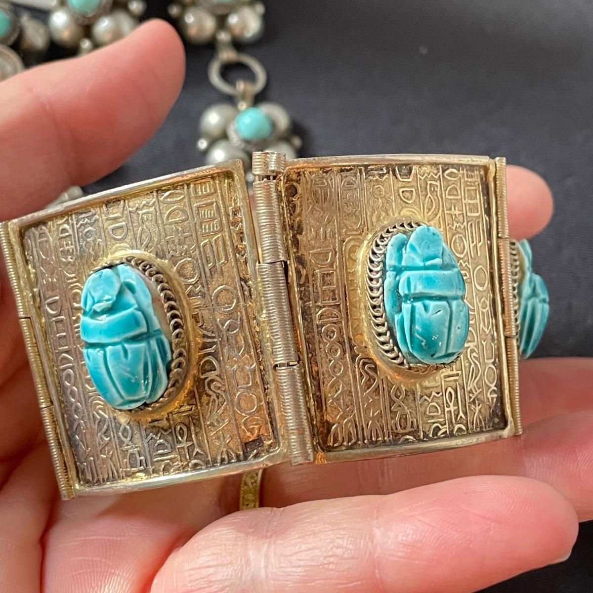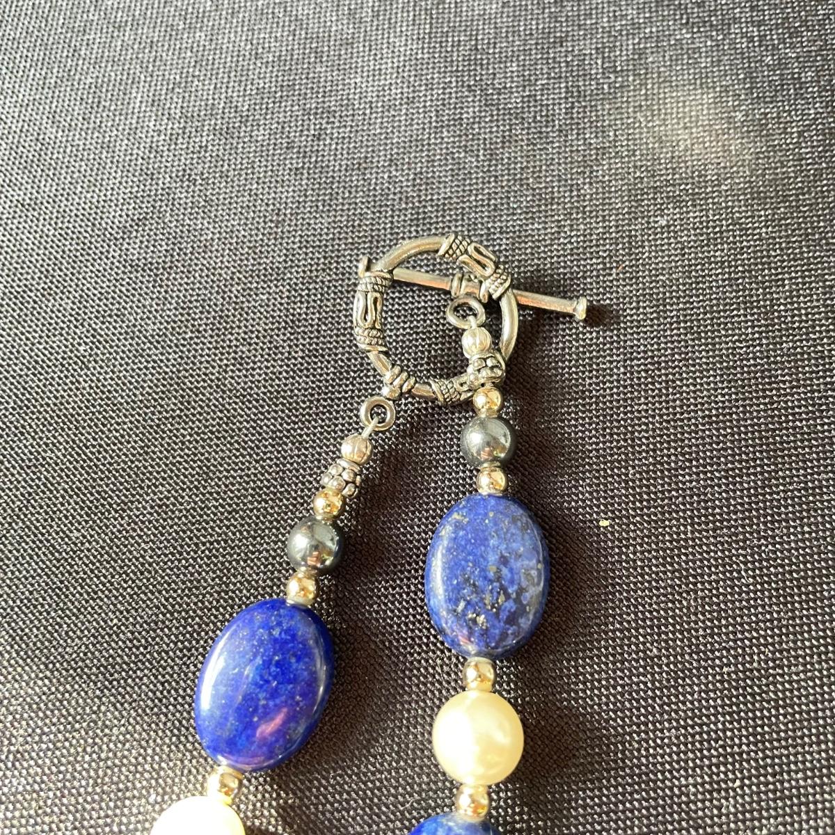 Beautiful collection of blue lapis and turquoise colored jewelry with silver colored settings. The two solely stone bracelets have elastic roping keeping them together. The turquoise colored pendant with a feather and the blue lapis colored pendant with a chain both can be used as brooches as well. A vintage shell cuff has a small chip in the shell, noted in the photos. Lot features a set of light turquoise colored stones, each one has a clip, it is unclear if they should be used together as the smaller one is too big to be worn as a bracelet, yet the larger one is choker sized. Lot also includes a 22” heavy stone necklace with a toggle clasp and pearly beads plus a unique carved scarab bracelet. See images. Shipping available. All sales are final. No returns or refunds. Please bid accordingly.