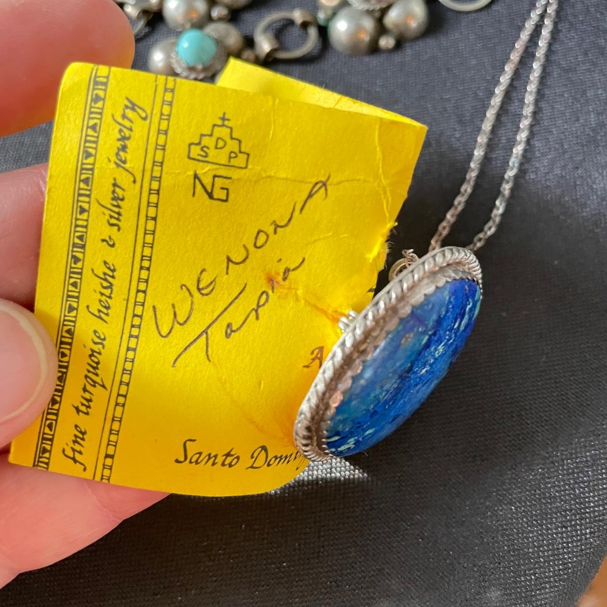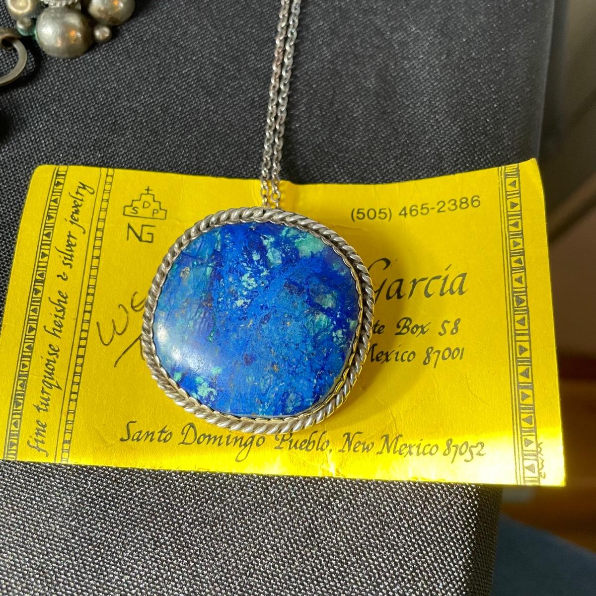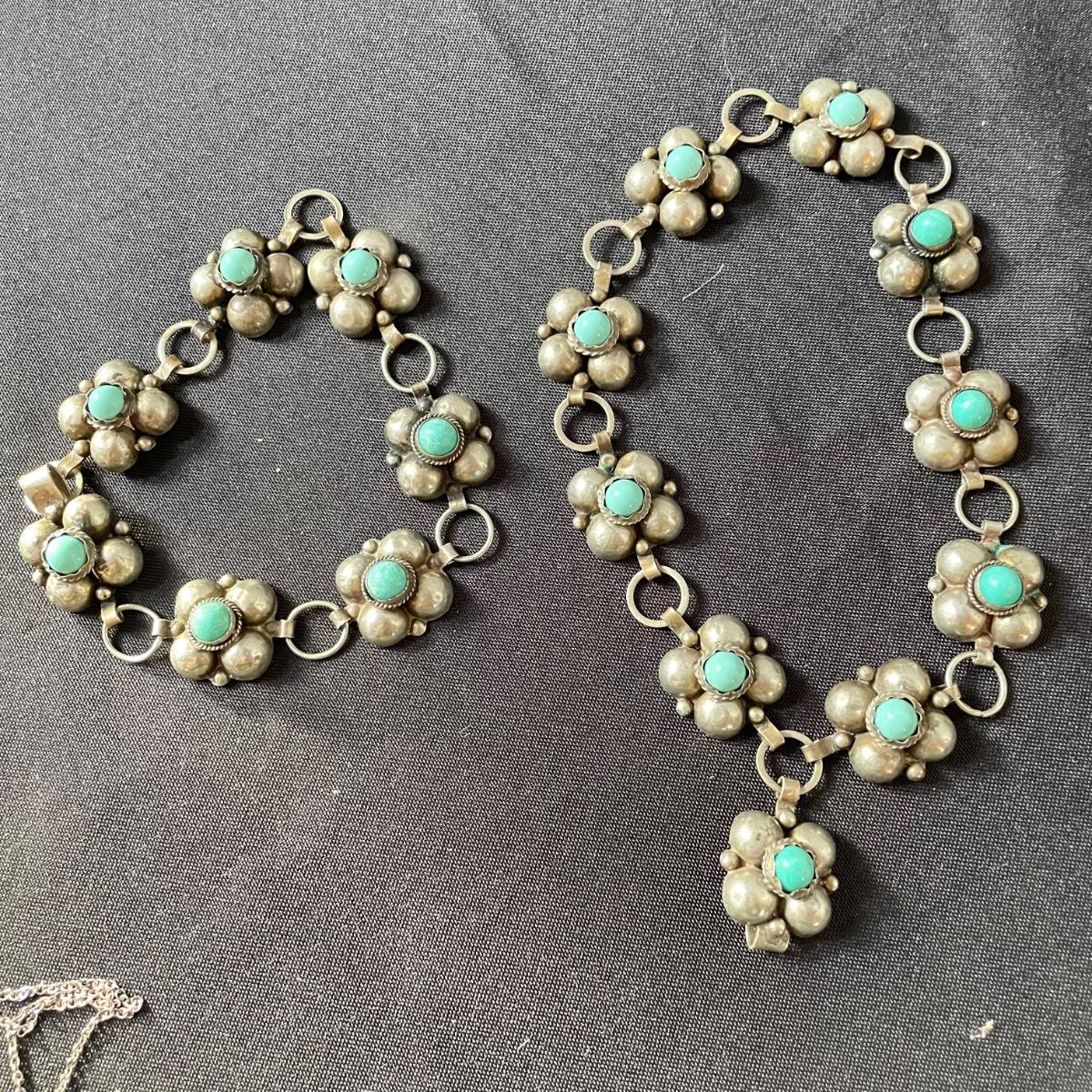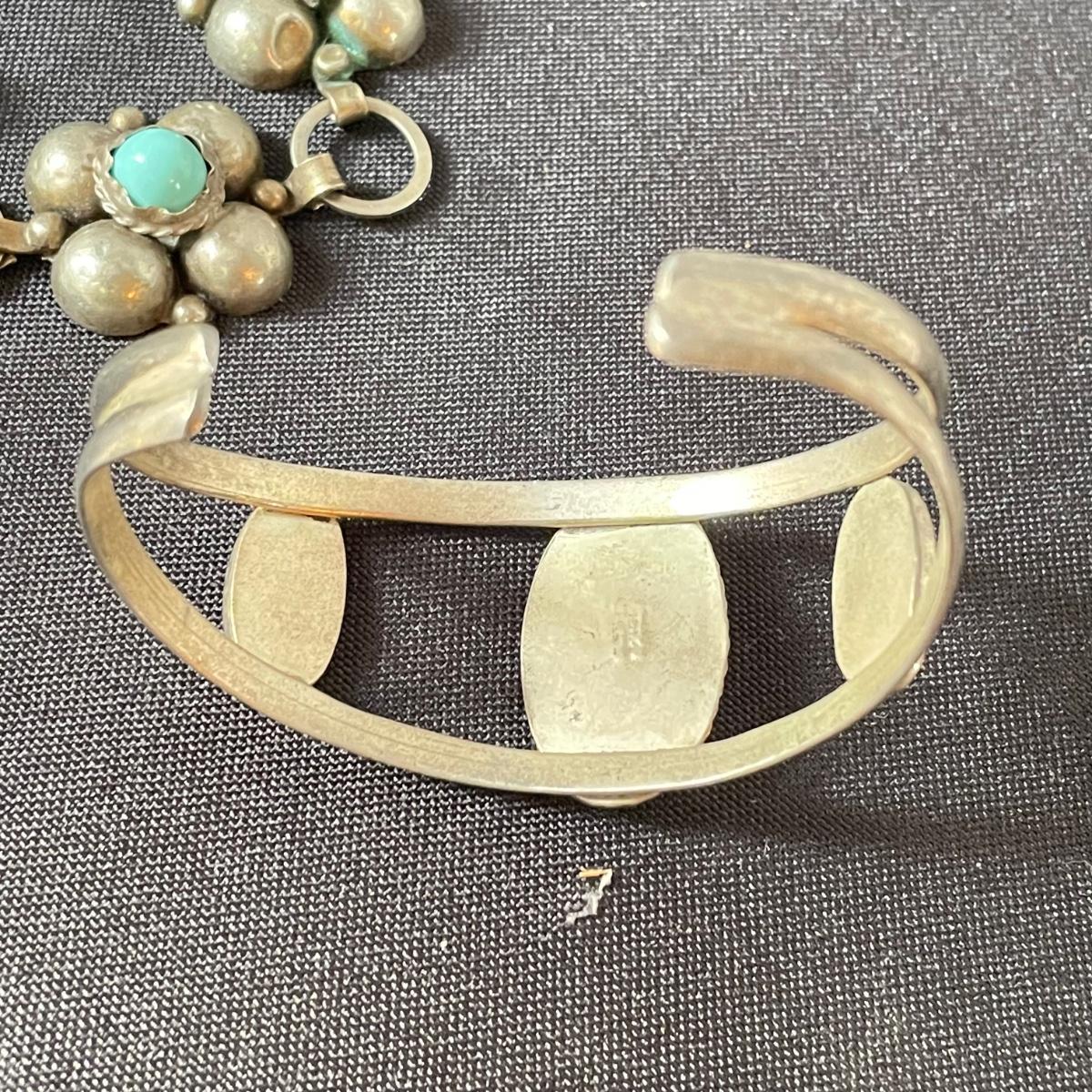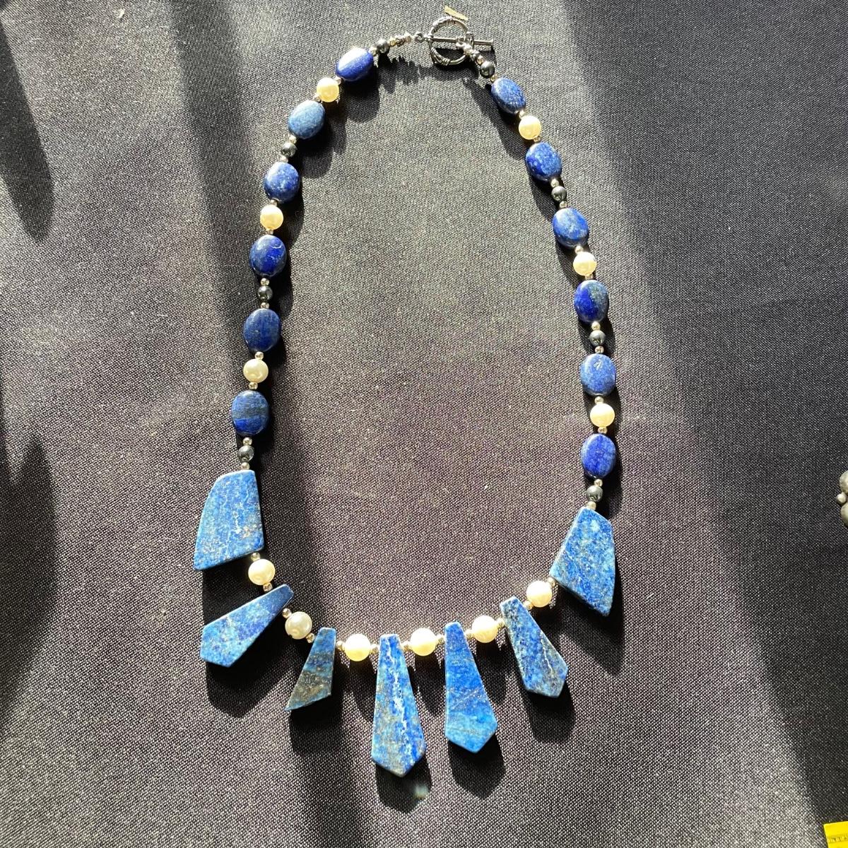 Beautiful collection of blue lapis and turquoise colored jewelry with silver colored settings. The two solely stone bracelets have elastic roping keeping them together. The turquoise colored pendant with a feather and the blue lapis colored pendant with a chain both can be used as brooches as well. A vintage shell cuff has a small chip in the shell, noted in the photos. Lot features a set of light turquoise colored stones, each one has a clip, it is unclear if they should be used together as the smaller one is too big to be worn as a bracelet, yet the larger one is choker sized. Lot also includes a 22” heavy stone necklace with a toggle clasp and pearly beads plus a unique carved scarab bracelet. See images. Shipping available. All sales are final. No returns or refunds. Please bid accordingly.