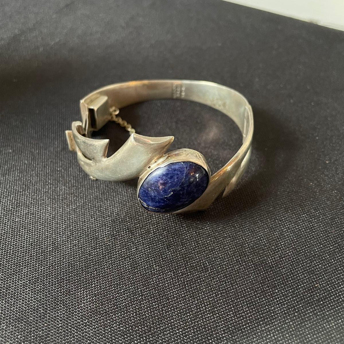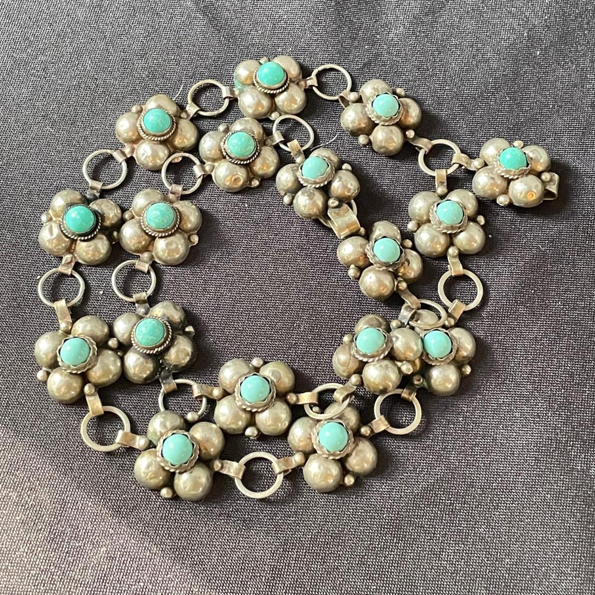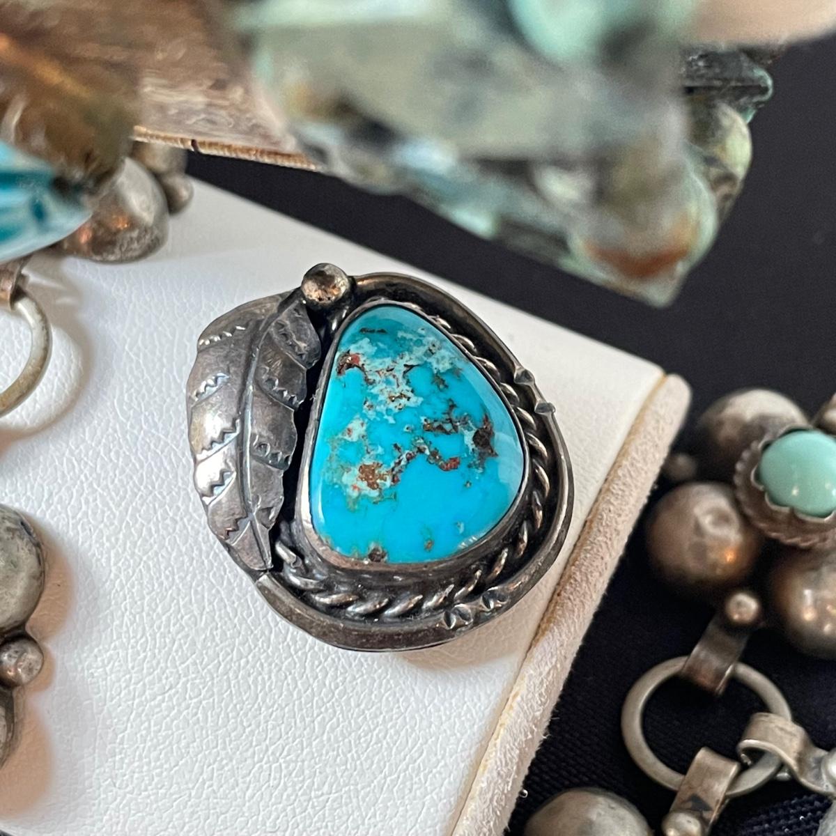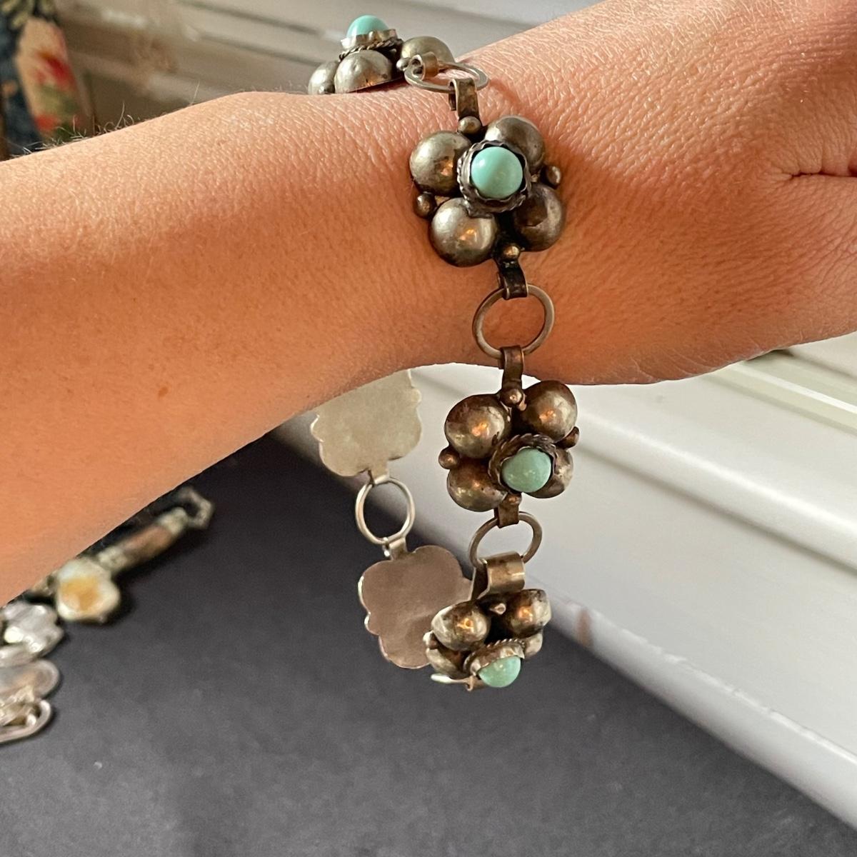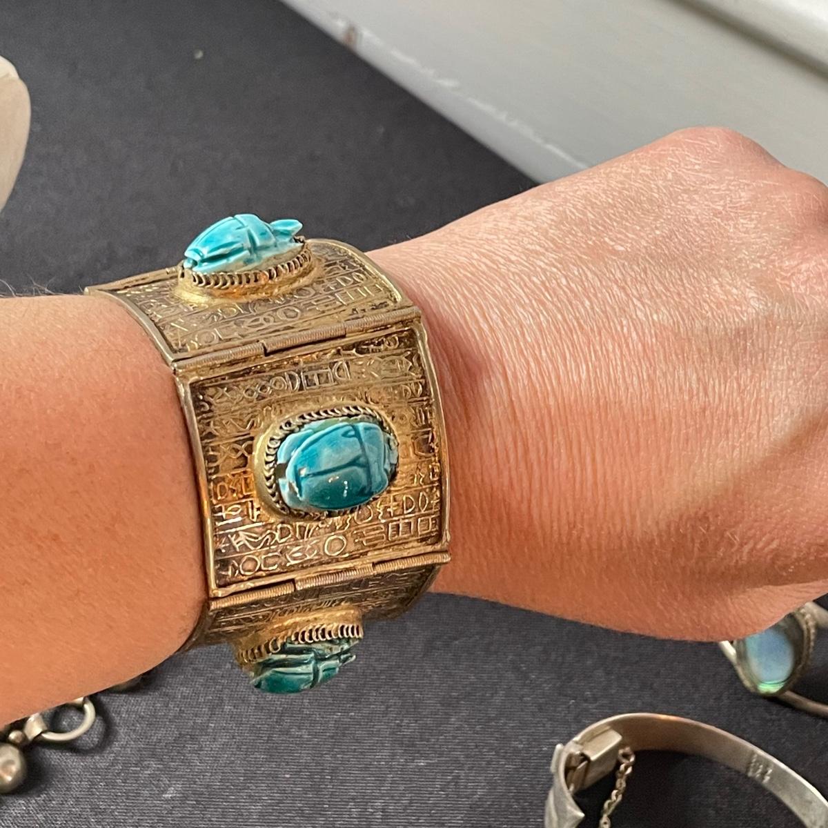 Beautiful collection of blue lapis and turquoise colored jewelry with silver colored settings. The two solely stone bracelets have elastic roping keeping them together. The turquoise colored pendant with a feather and the blue lapis colored pendant with a chain both can be used as brooches as well. A vintage shell cuff has a small chip in the shell, noted in the photos. Lot features a set of light turquoise colored stones, each one has a clip, it is unclear if they should be used together as the smaller one is too big to be worn as a bracelet, yet the larger one is choker sized. Lot also includes a 22” heavy stone necklace with a toggle clasp and pearly beads plus a unique carved scarab bracelet. See images. Shipping available. All sales are final. No returns or refunds. Please bid accordingly.