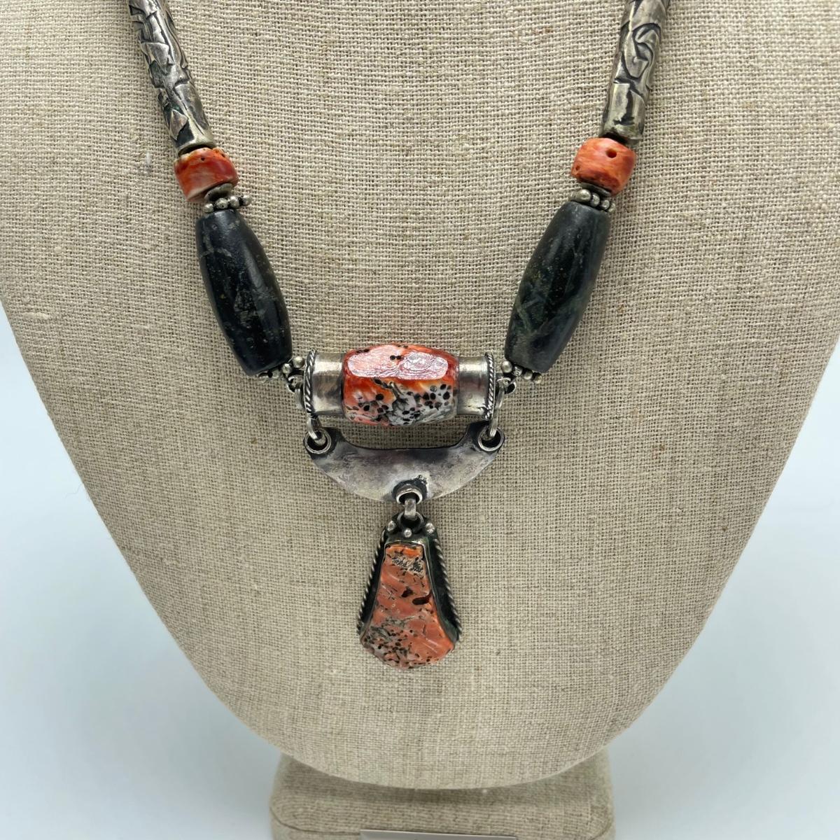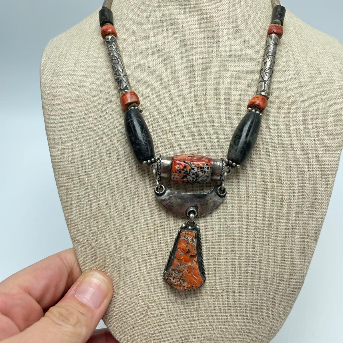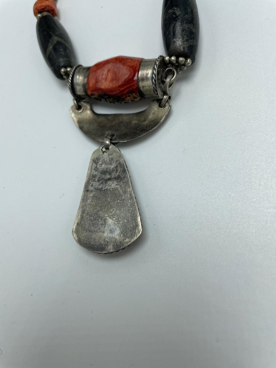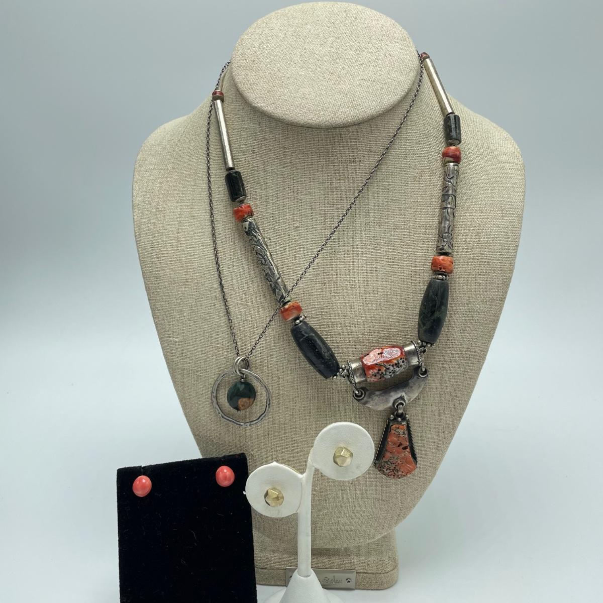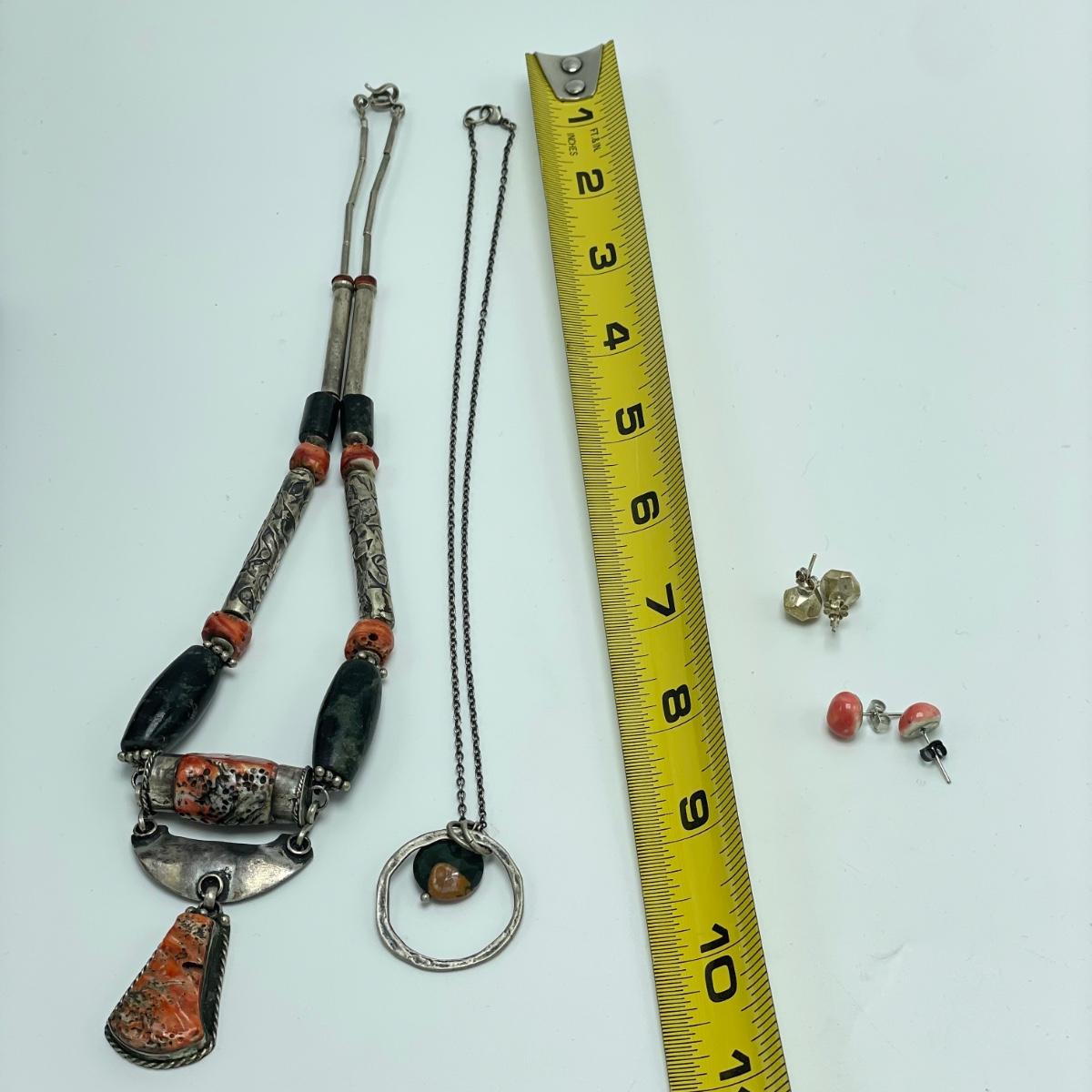 Two necklaces offer a mix of stone and silver, the larger necklace is marked 925. Lot also contains two sets of stud earrings, a golden metal pair and a ceramic salmon colored pair. See images. Shipping available.