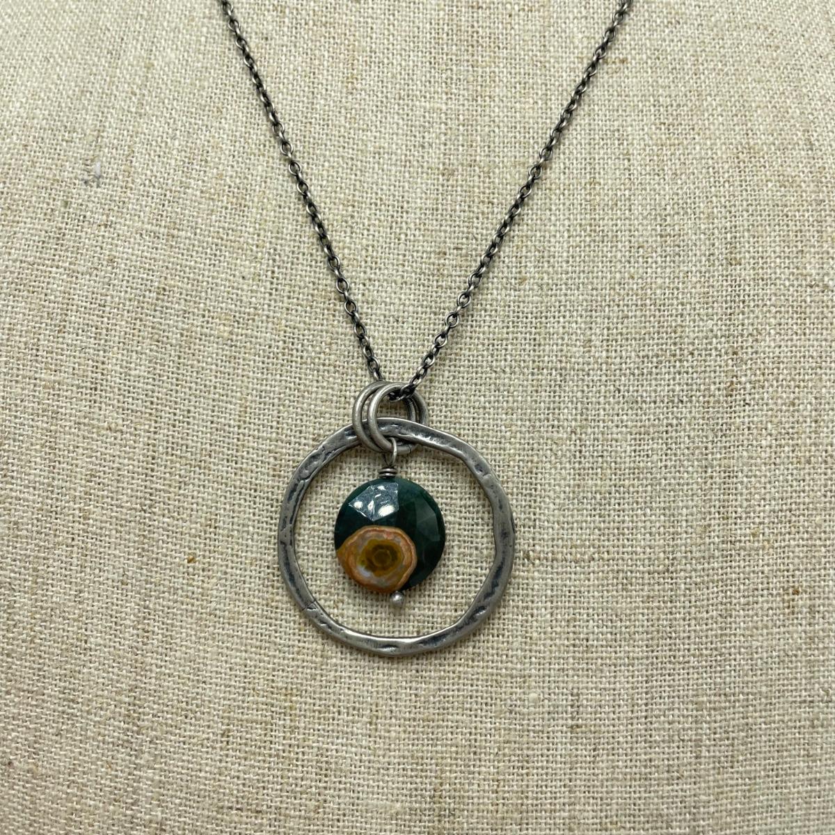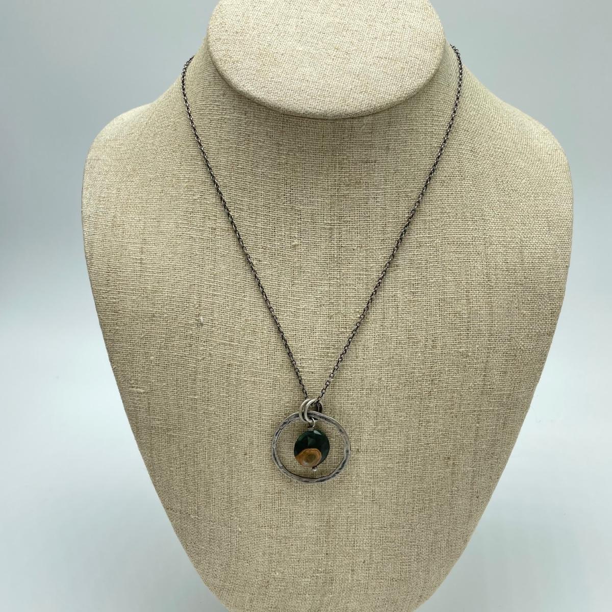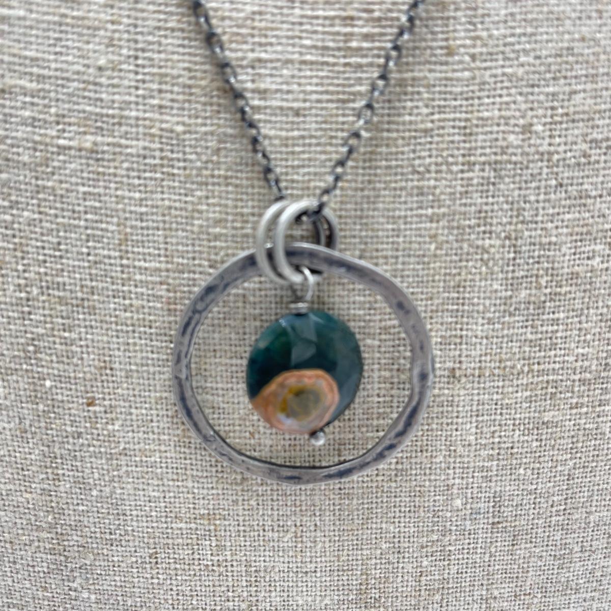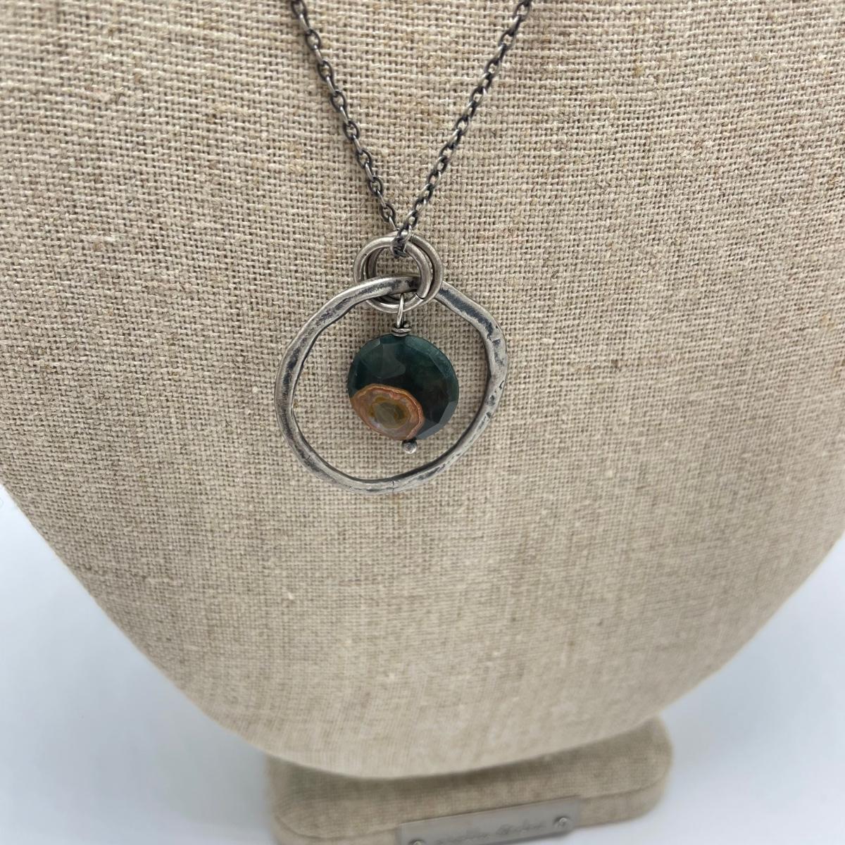 Two necklaces offer a mix of stone and silver, the larger necklace is marked 925. Lot also contains two sets of stud earrings, a golden metal pair and a ceramic salmon colored pair. See images. Shipping available.