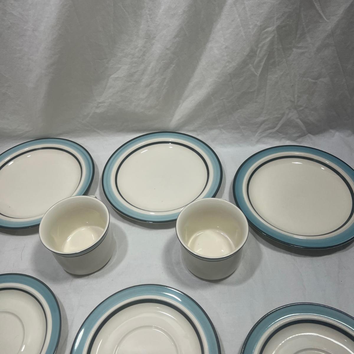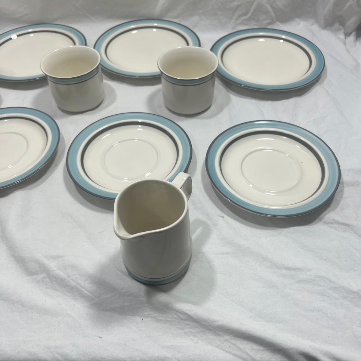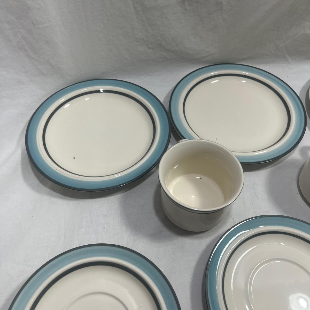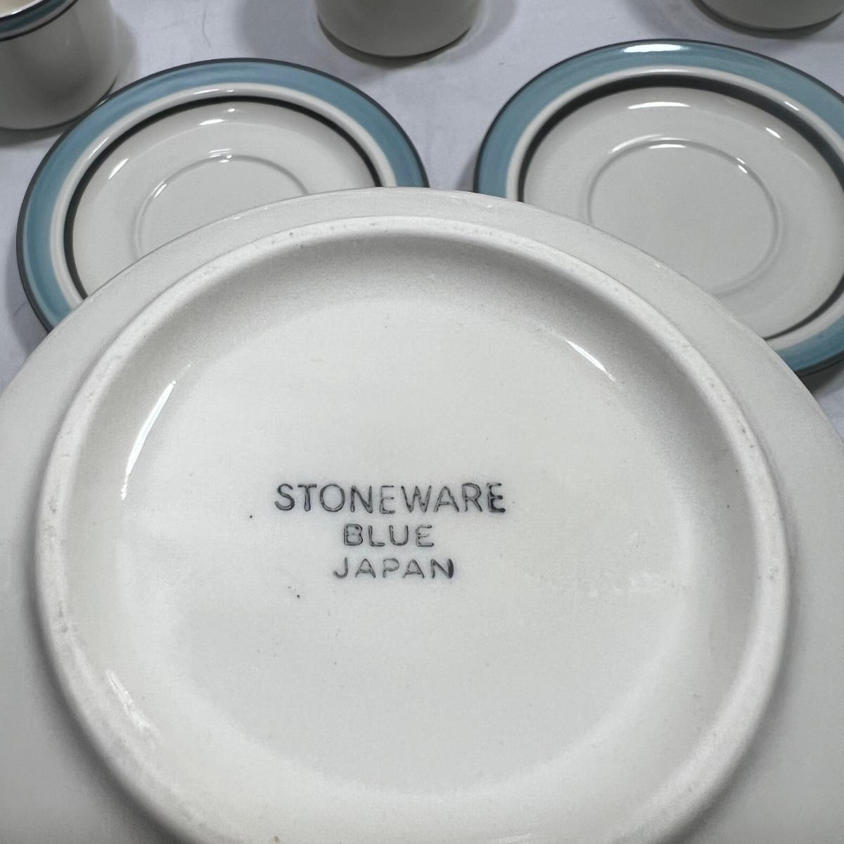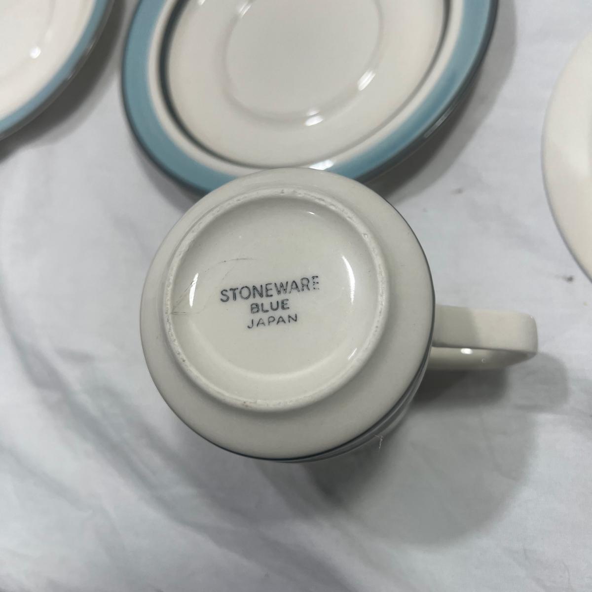 StoneWare Blue set; 4 medium plates, 4 small plates, 3 mugs cream pourer and a sugar dish