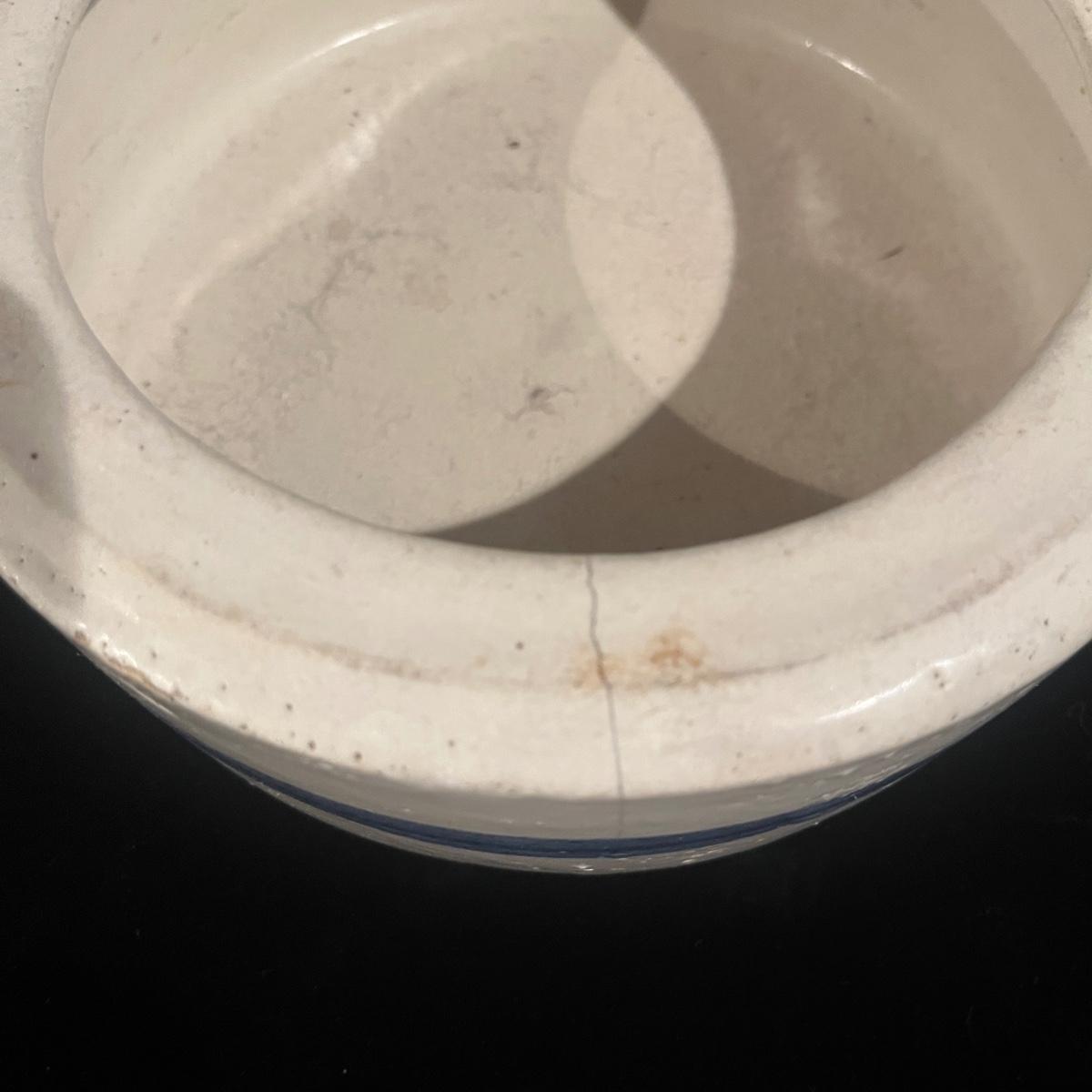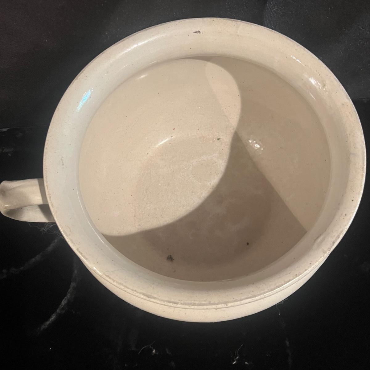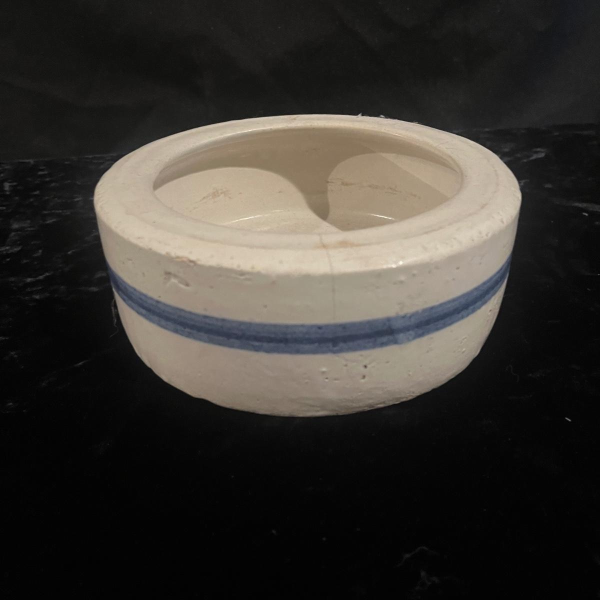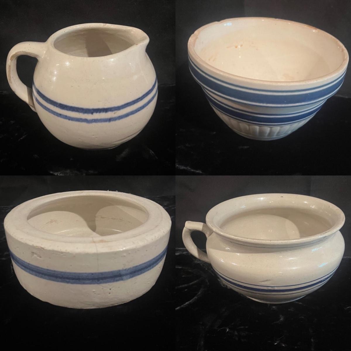 Lot includes four pieces of stoneware with two having handles. Largest piece measures 9.5”D x 6”H. Some condition issues due to age. Please see photos for details.