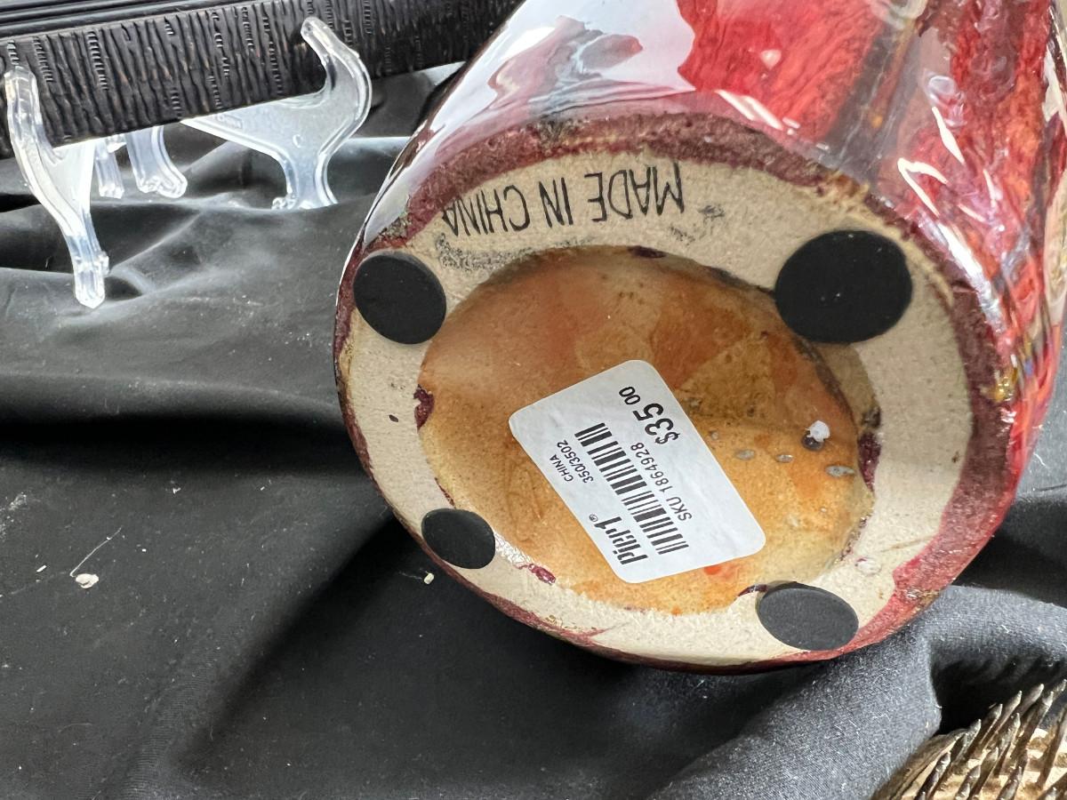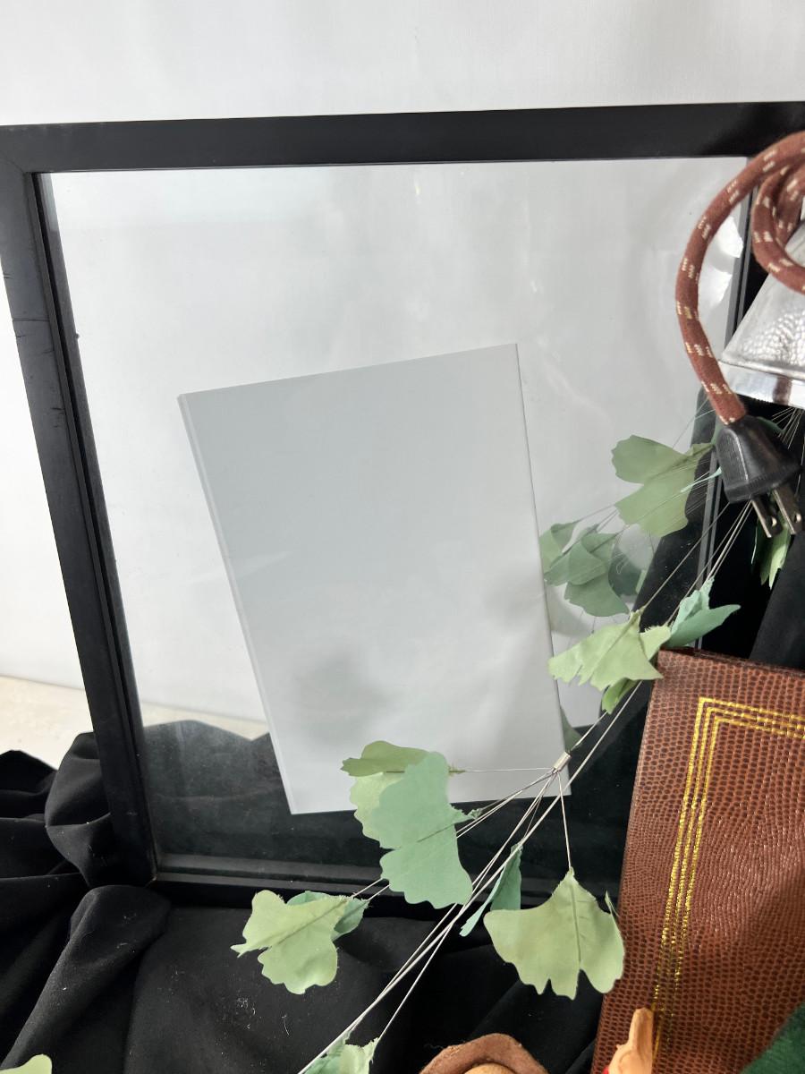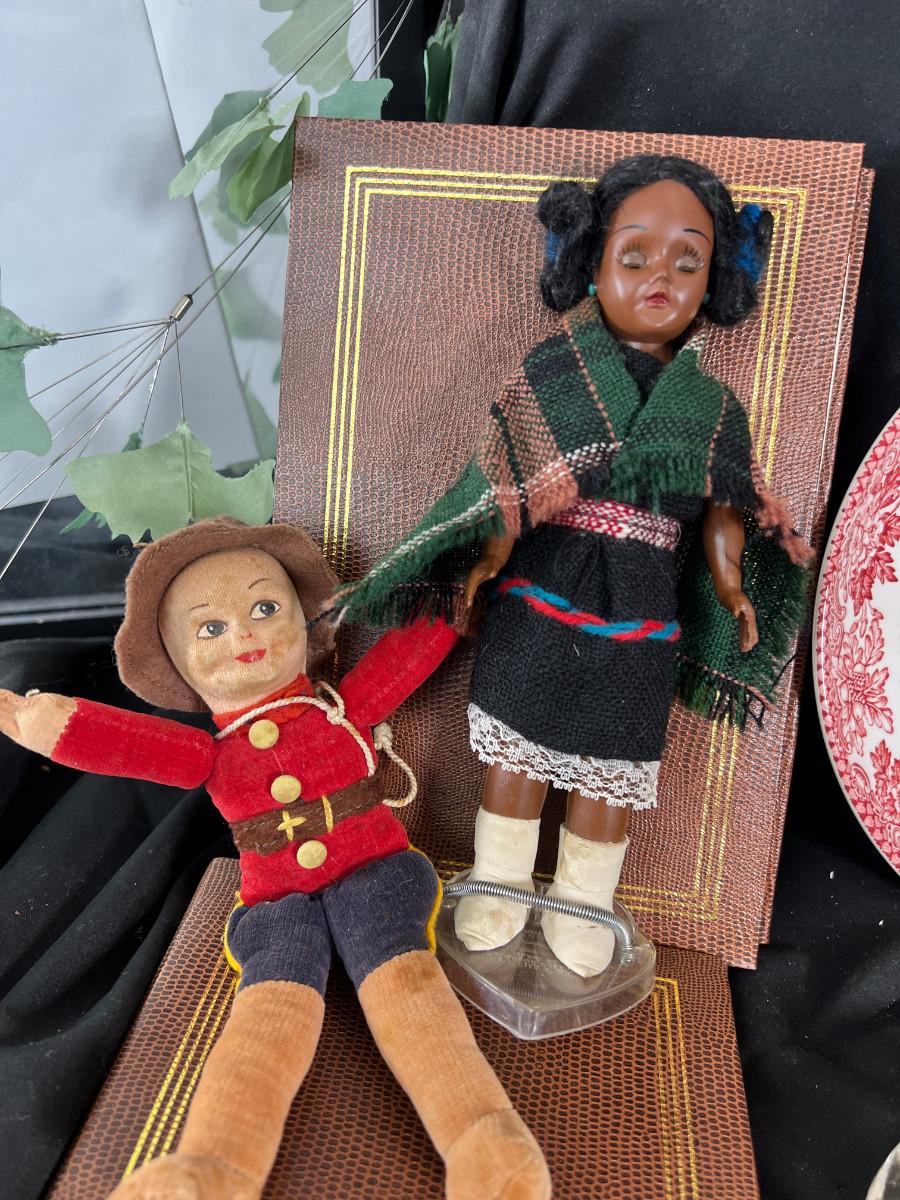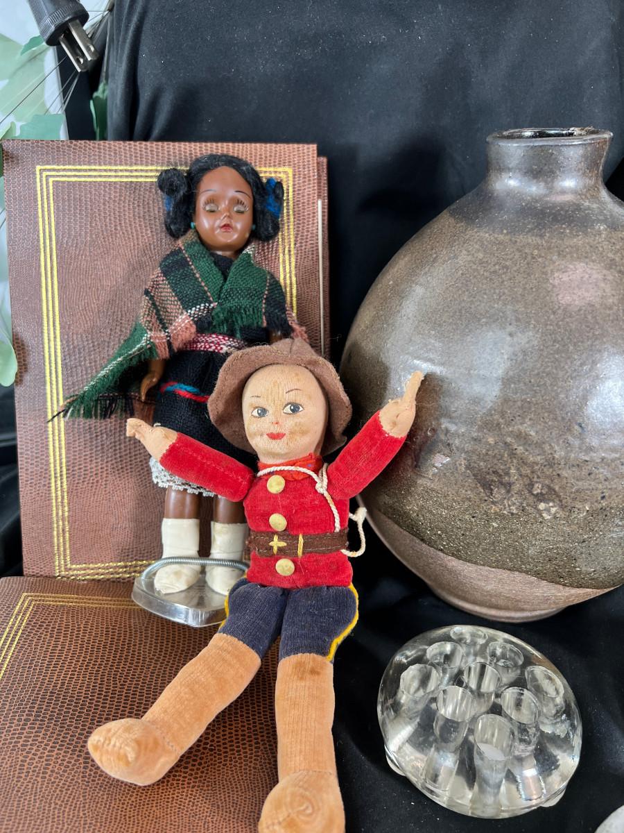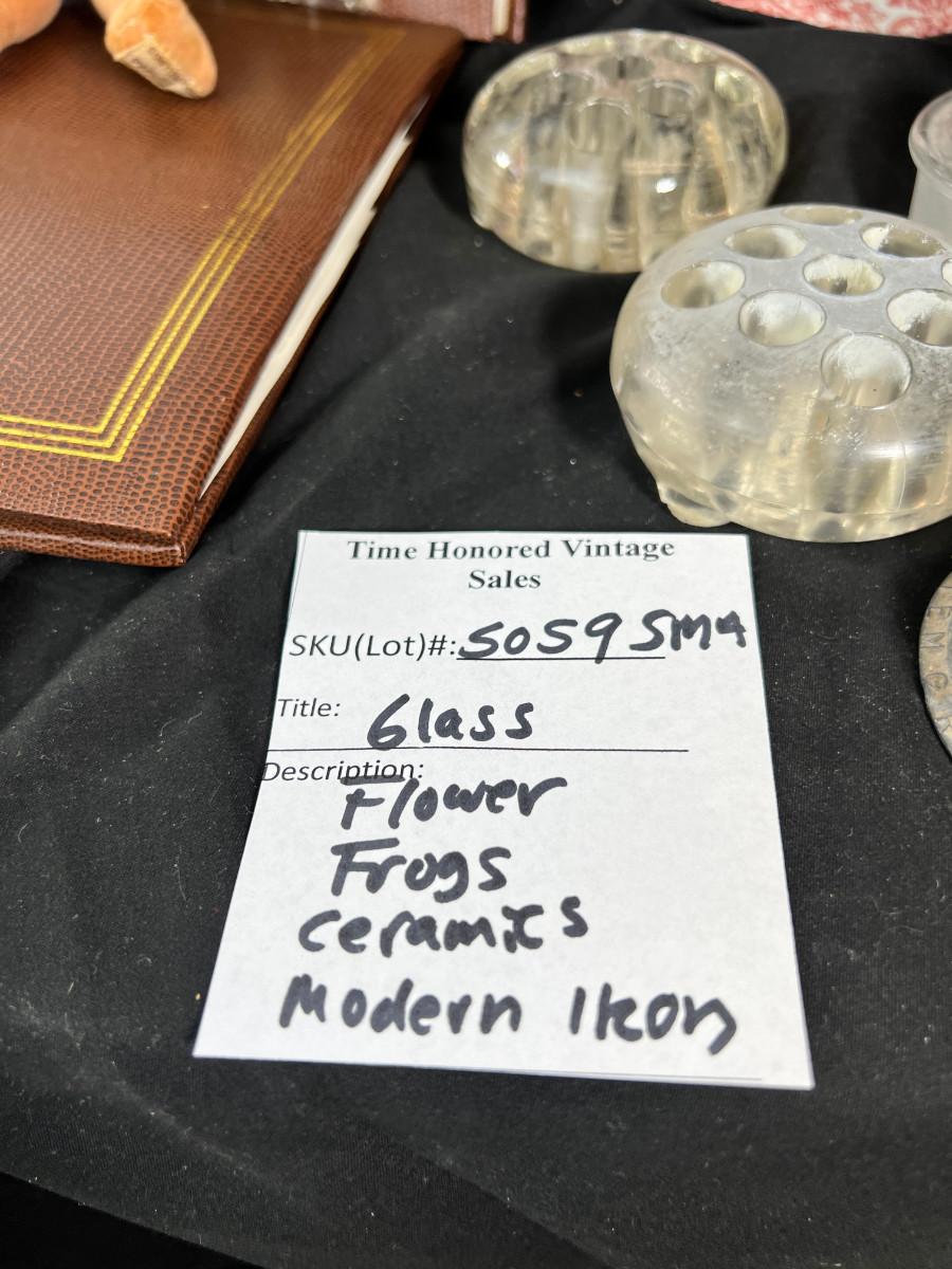 Glass flower frogs, metal flower frogs, 2 black frames, Red White plate, 2 dolls.