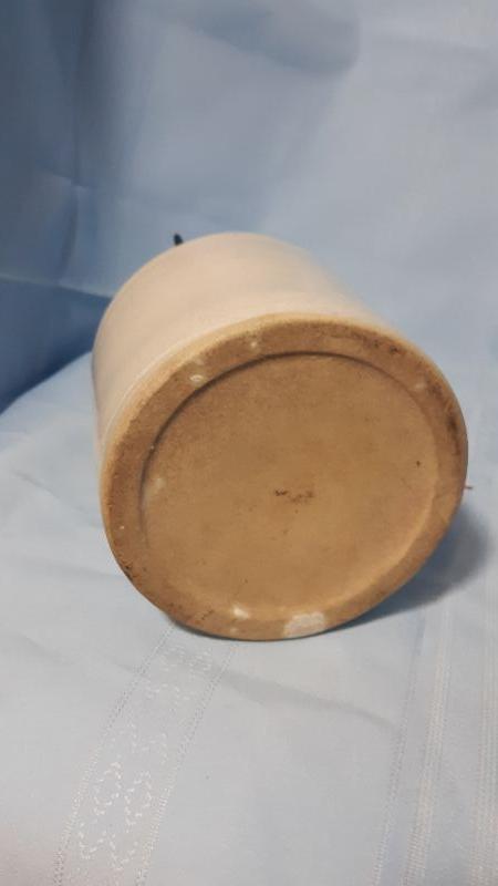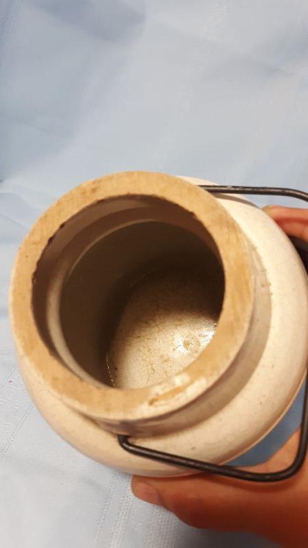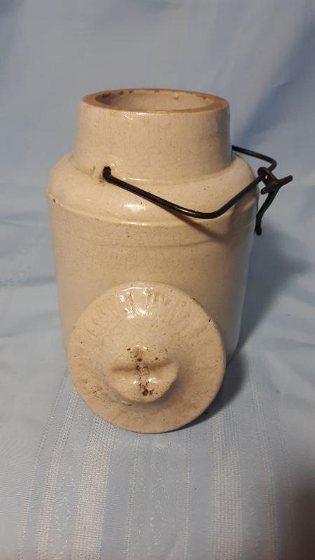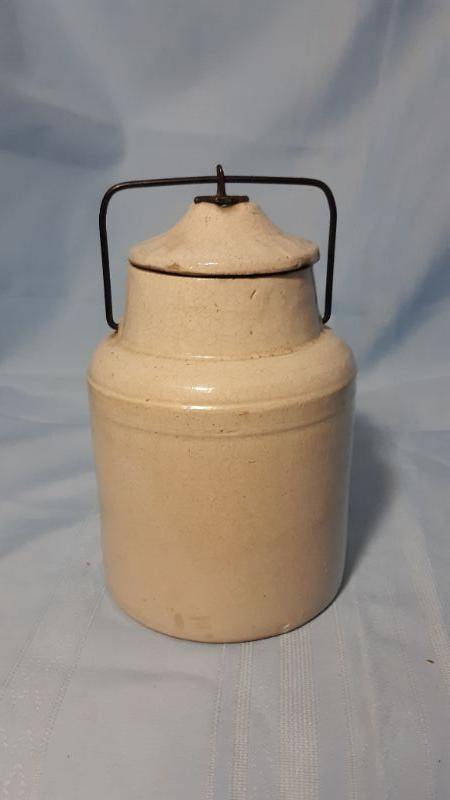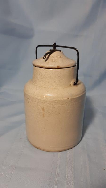 Stoneware cream colored salt jar with lid and working hasp, 7"H