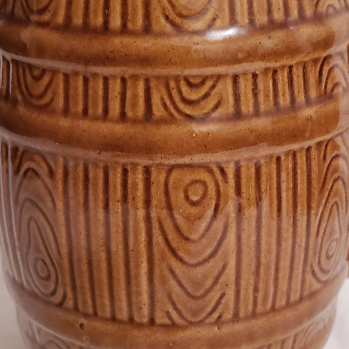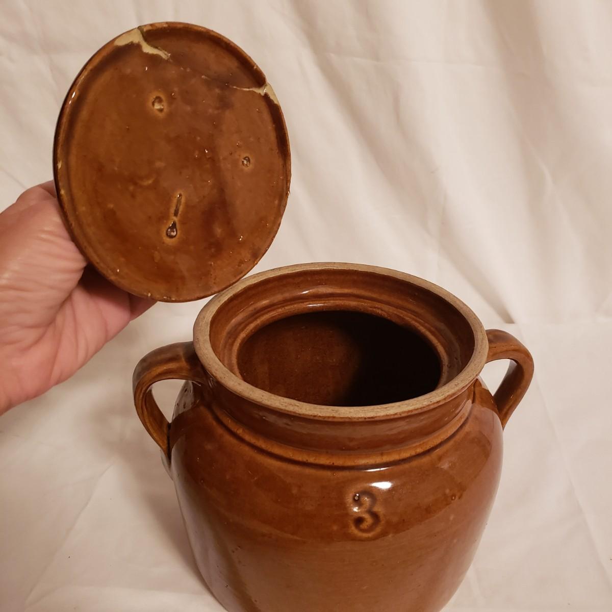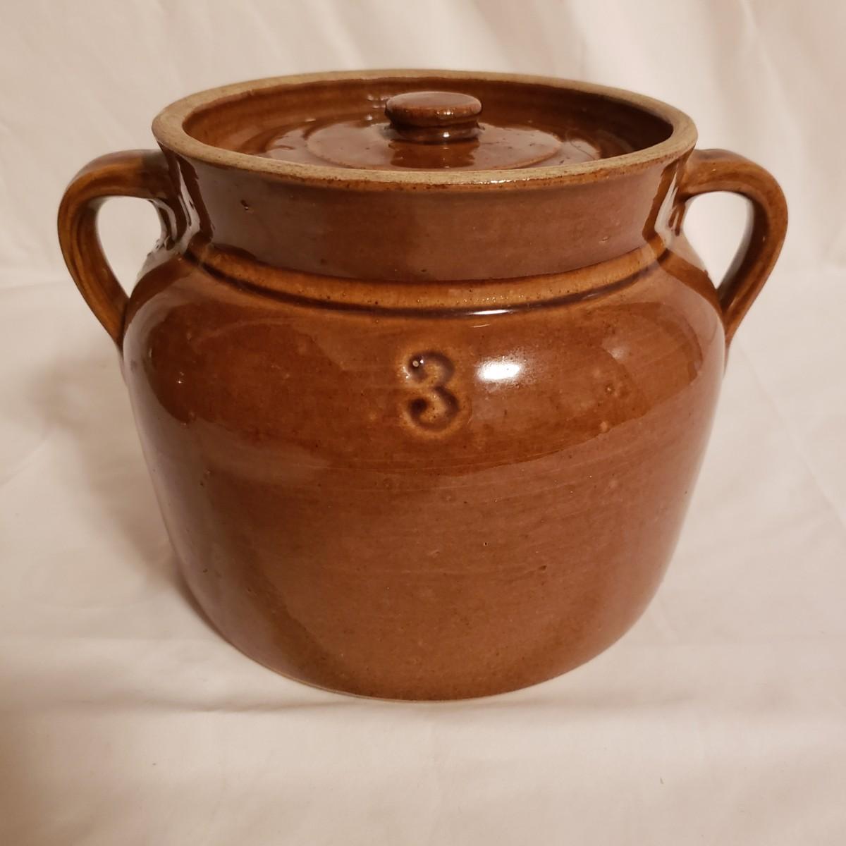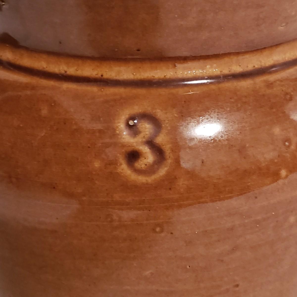 This three piece stoneware lot features a stamped #3 crock with a lid and two pitchers. The bark like barrel pitcher is a possible McCoy based on research. This stout, heavy pitcher measures 8.5" x 5" x 8"H. The smaller pitcher appears to be blemish free and has some markings on the bottom, see picture. The #3 crock is adorable! It is heavy to the touch. The lid unfortunately has a crack, which is slightly camouflaged from the top view, yet visible on the reverse side. Box is a photo prop and not included in the lot.