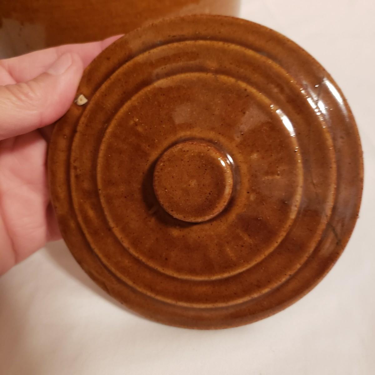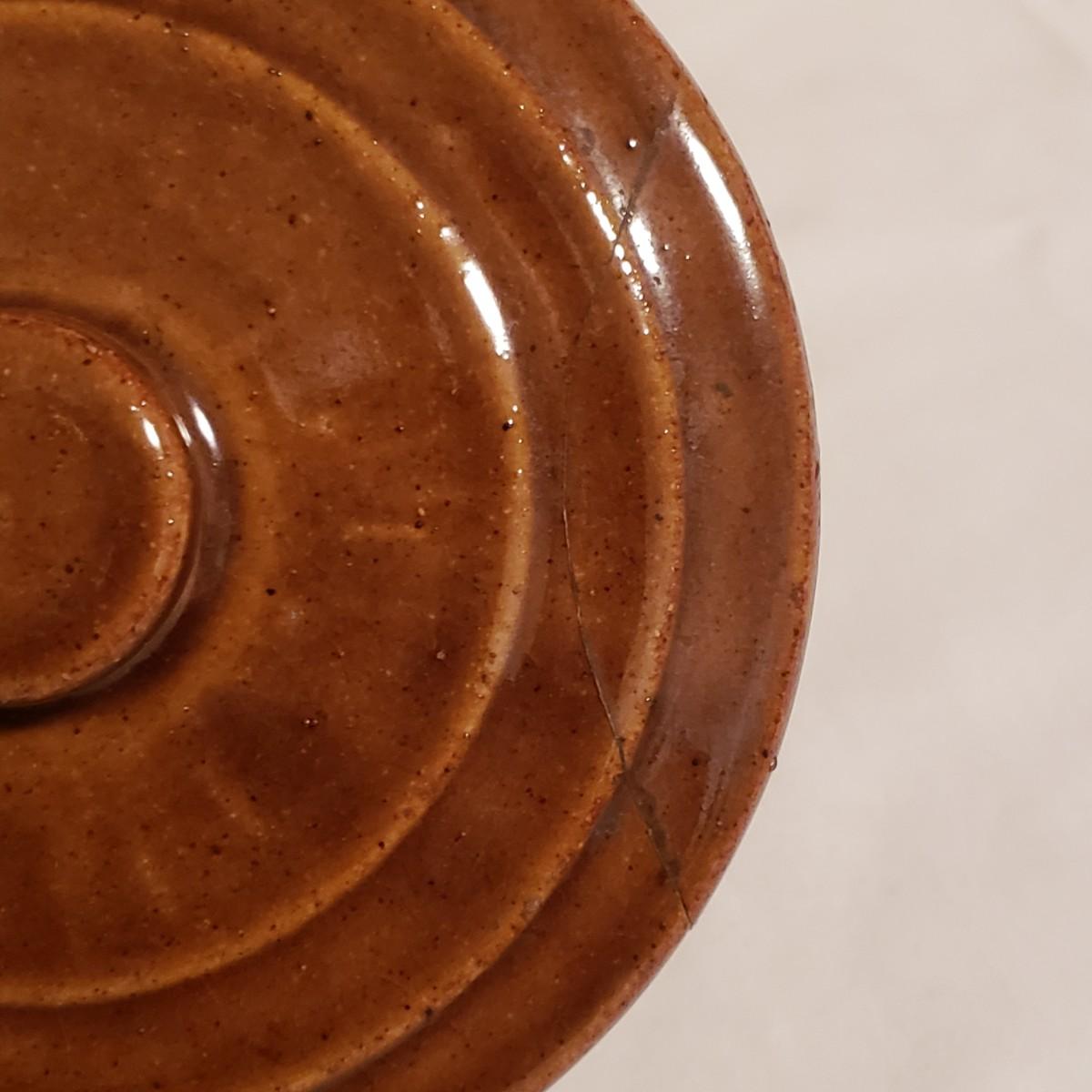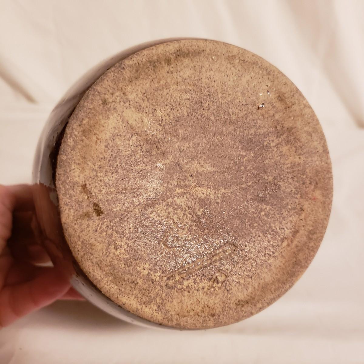 This three piece stoneware lot features a stamped #3 crock with a lid and two pitchers. The bark like barrel pitcher is a possible McCoy based on research. This stout, heavy pitcher measures 8.5" x 5" x 8"H. The smaller pitcher appears to be blemish free and has some markings on the bottom, see picture. The #3 crock is adorable! It is heavy to the touch. The lid unfortunately has a crack, which is slightly camouflaged from the top view, yet visible on the reverse side. Box is a photo prop and not included in the lot.